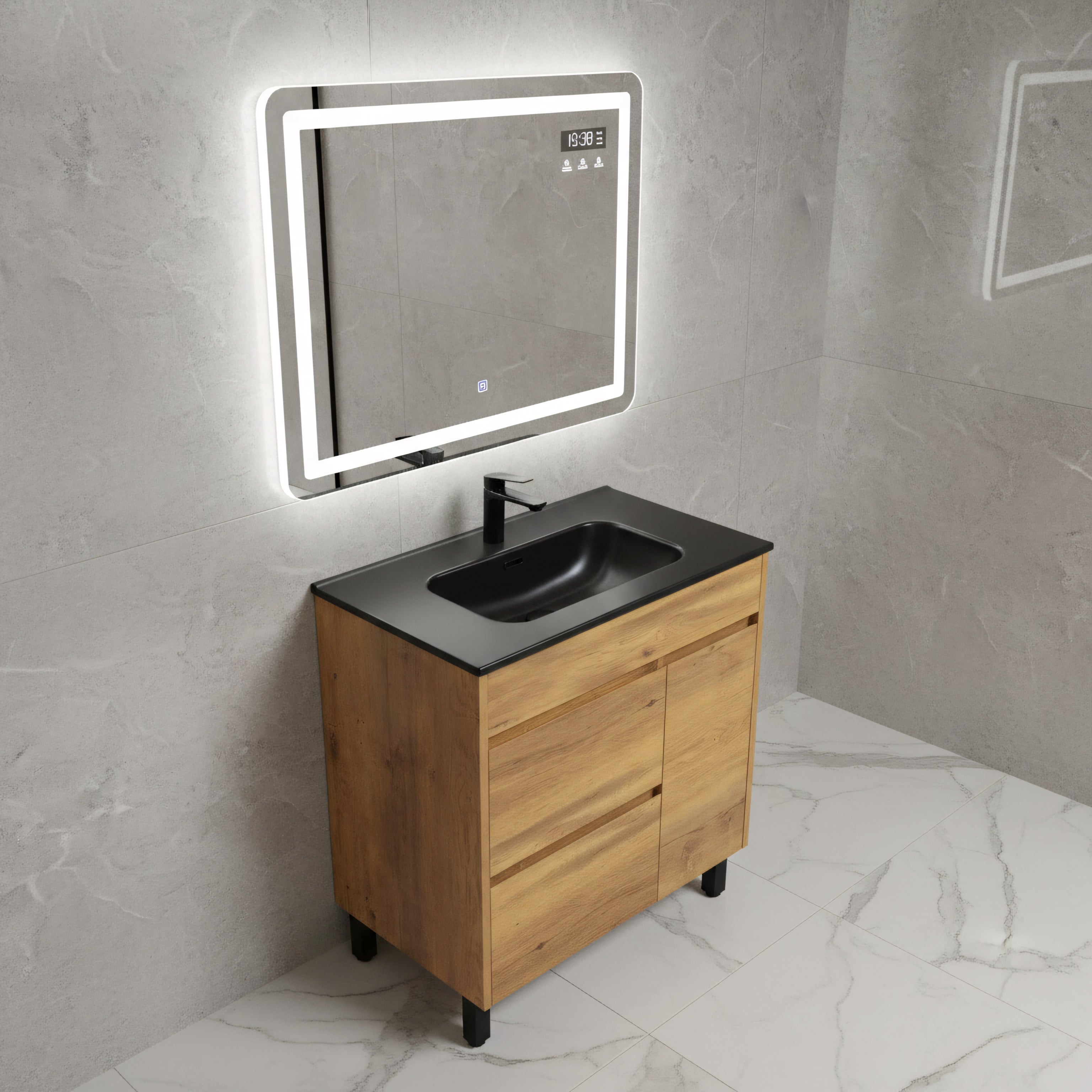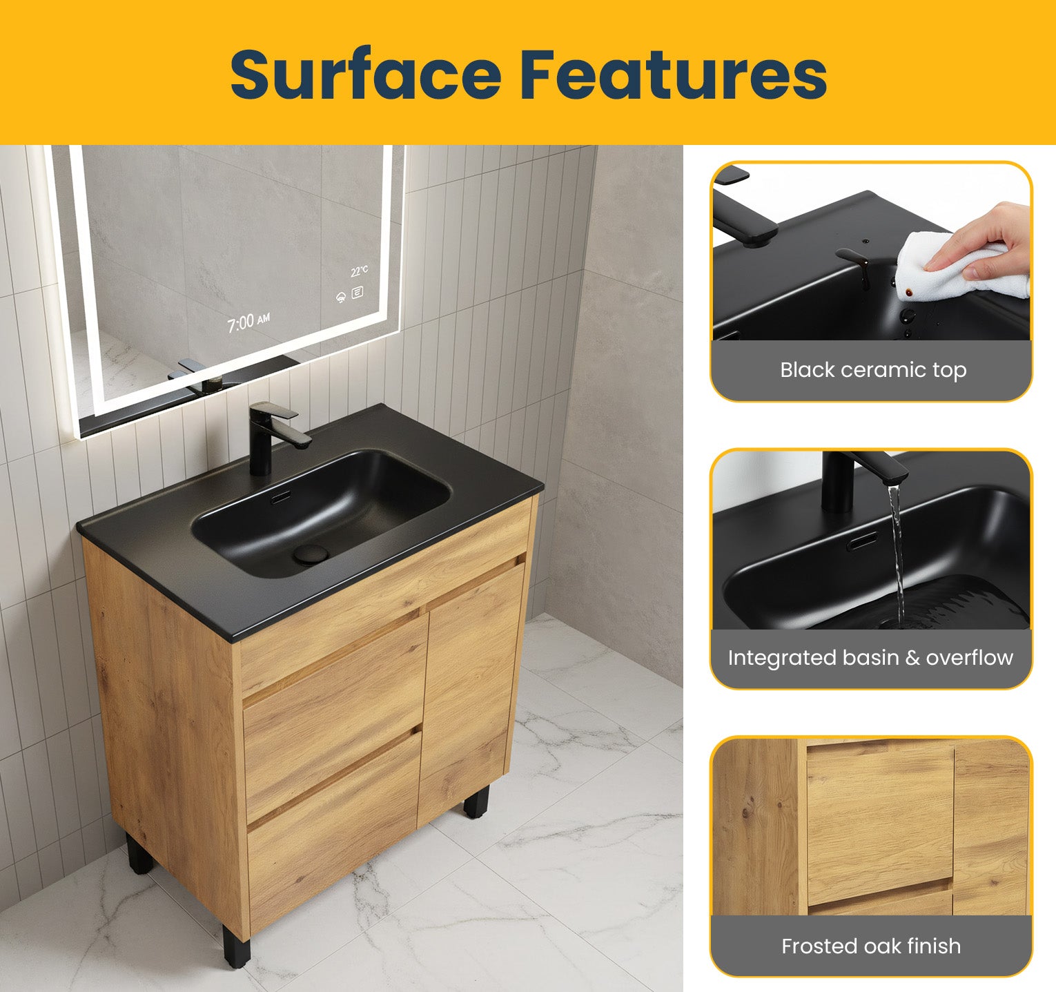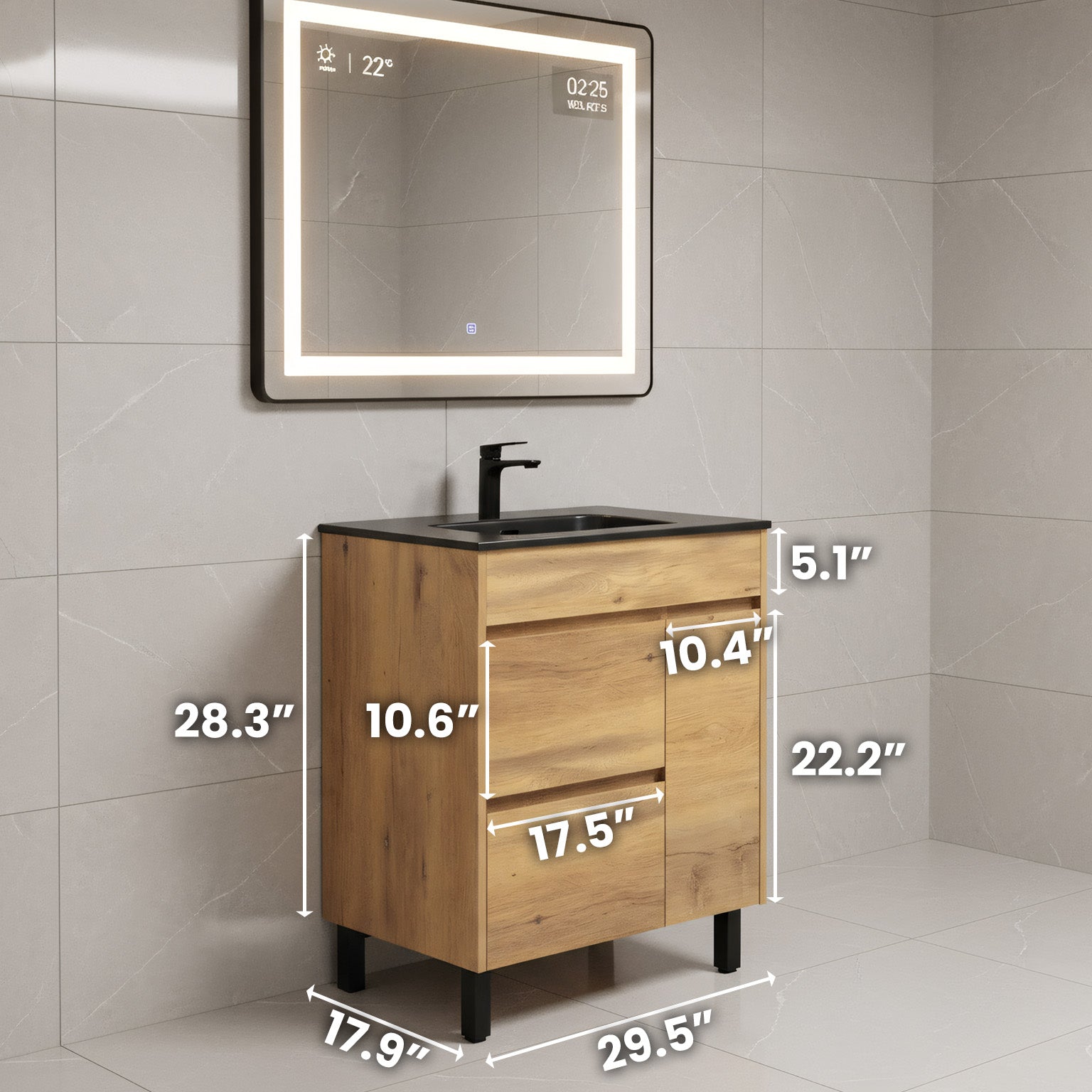 30" Frosted Oak Freestanding Single Sink Bathroom Vanity with Black Ceramic Countertop