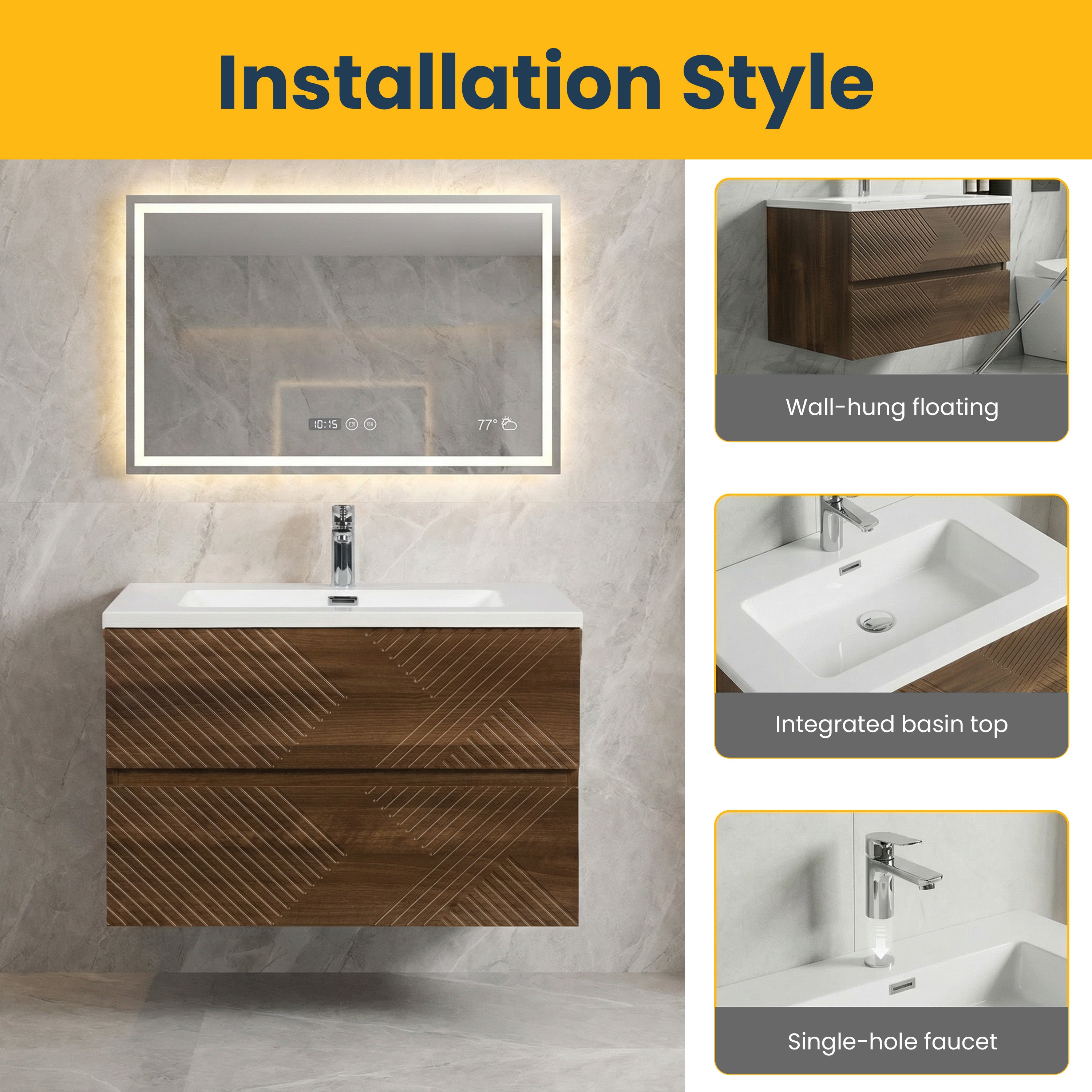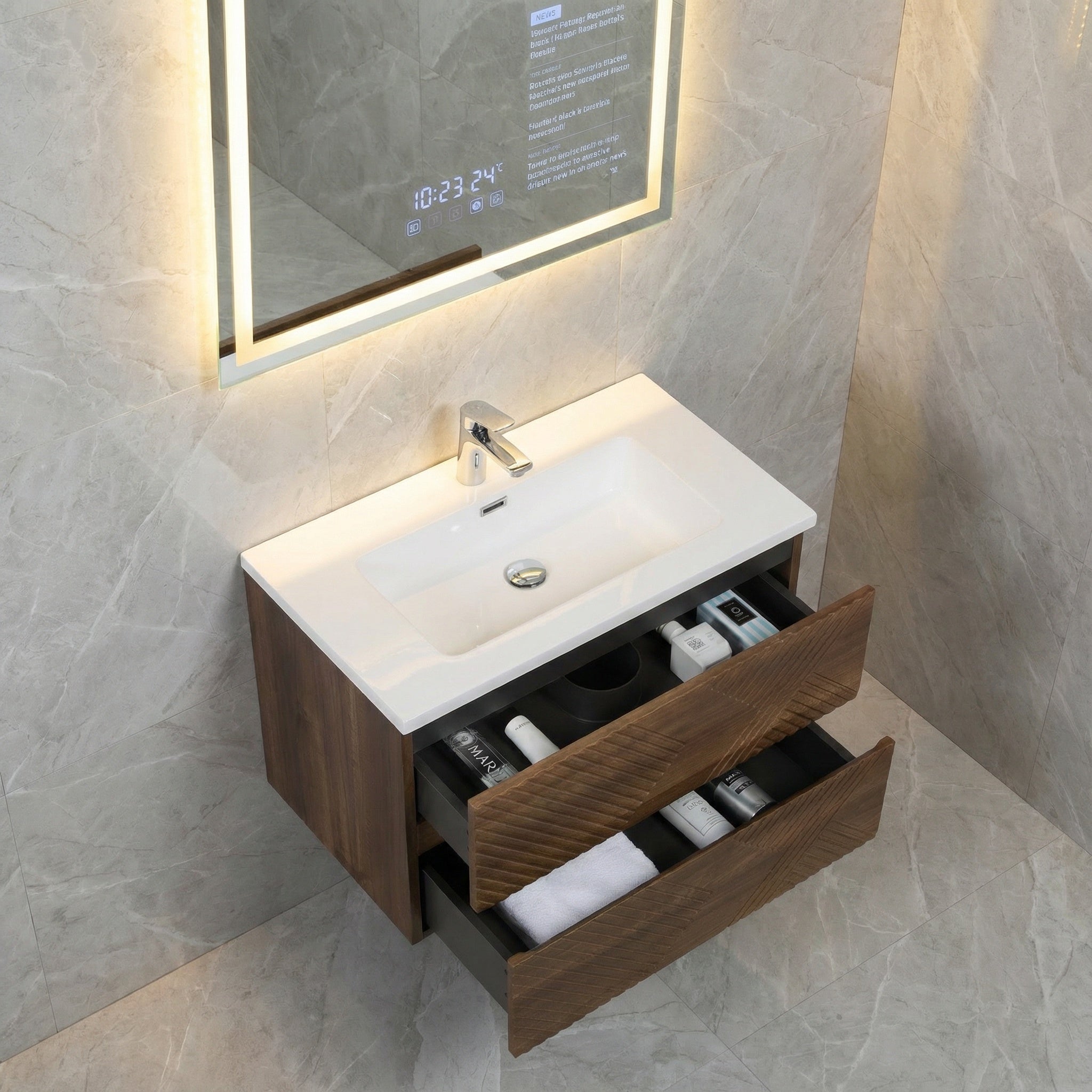 Maximize modern elegance with this 30″ wall-mounted vanity in rich walnut, featuring a clean white polymarble countertop and functional storage—perfect for compact bathrooms with contemporary flair.