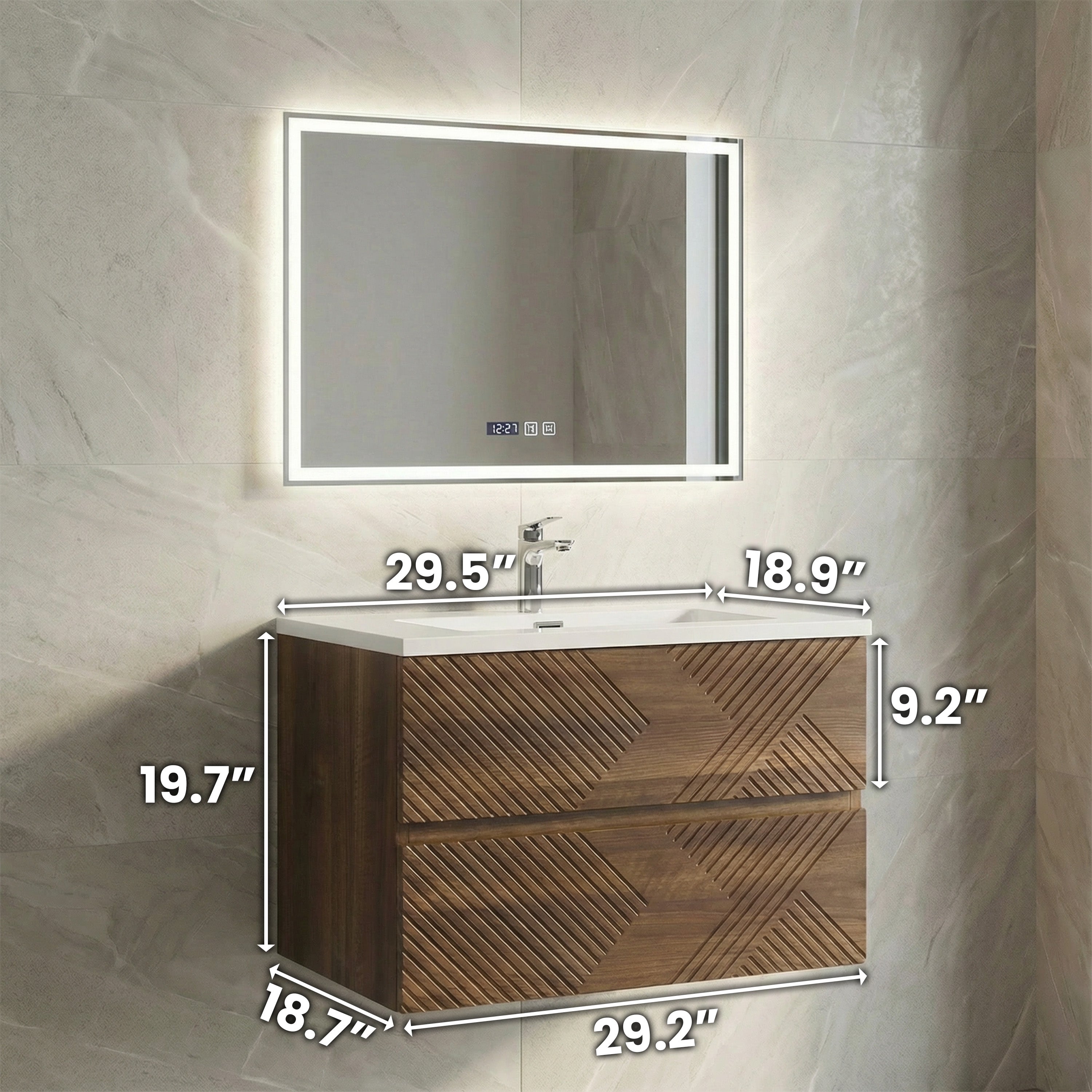 30" Walnut Wall Mount Single Sink Bathroom Vanity with White Polymarble Countertop