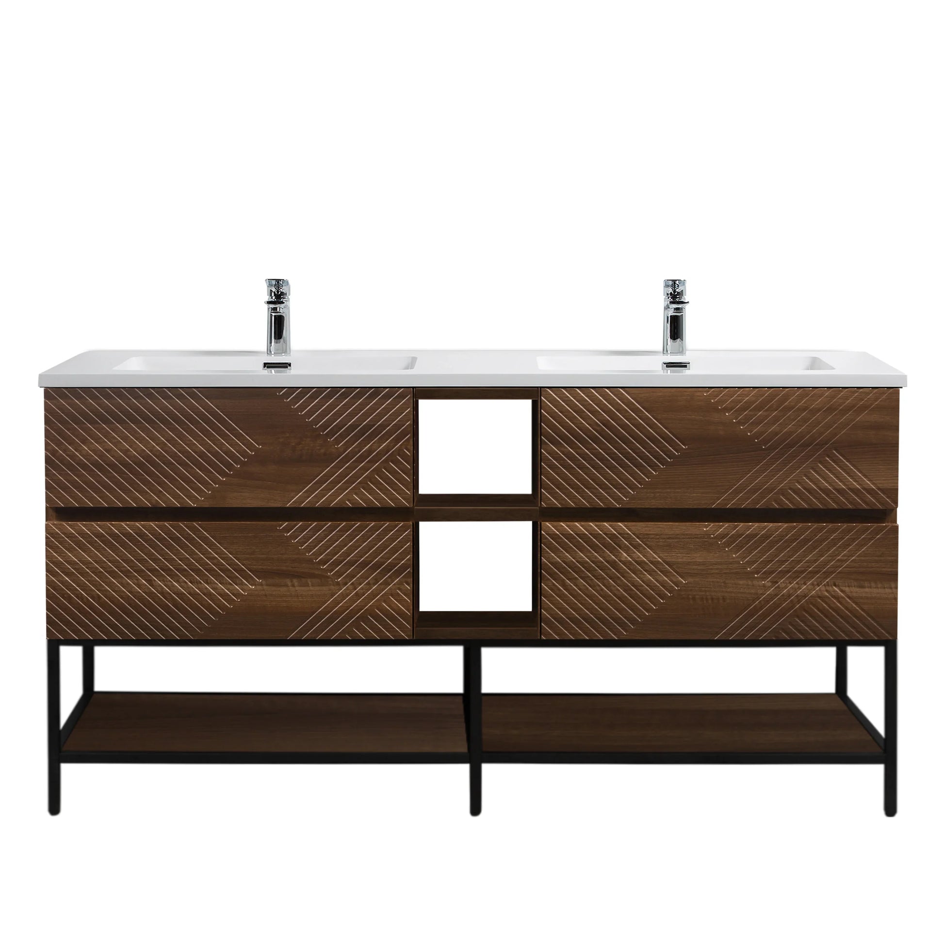 Redefine spacious sophistication with this 72″ wall-mounted double sink vanity in elegant walnut, paired with a seamless white polymarble countertop—designed for modern bathrooms that value both luxury and functionality.