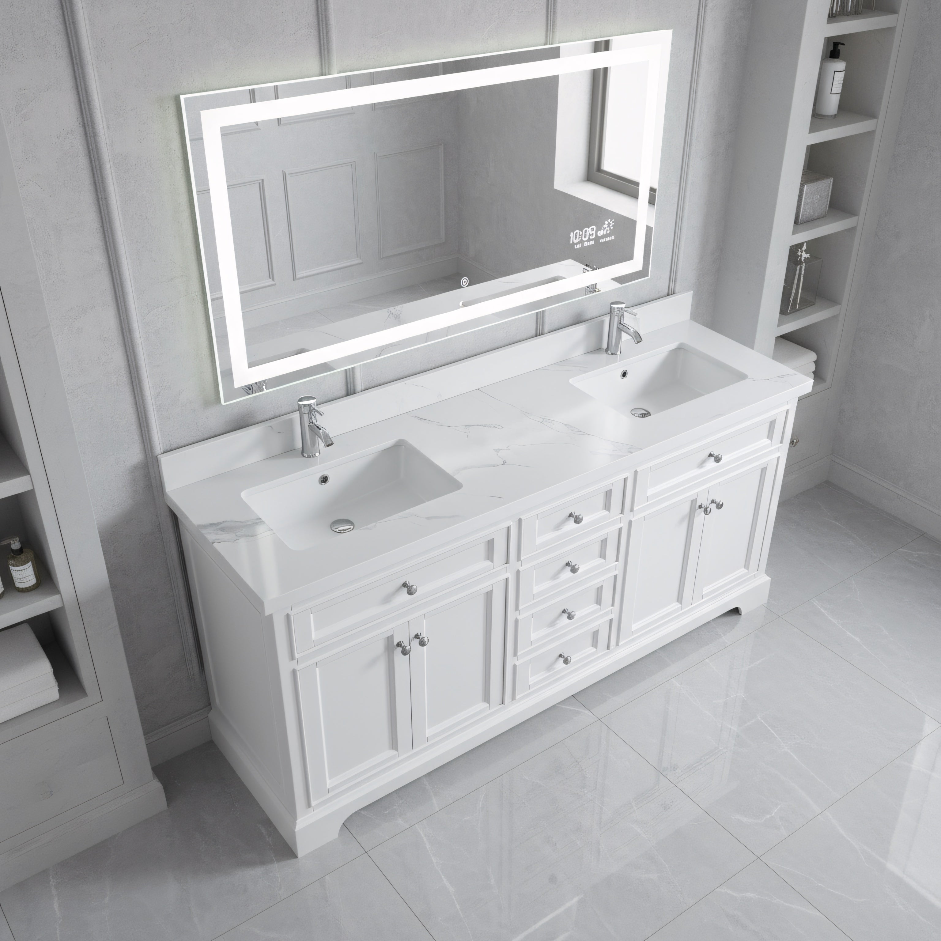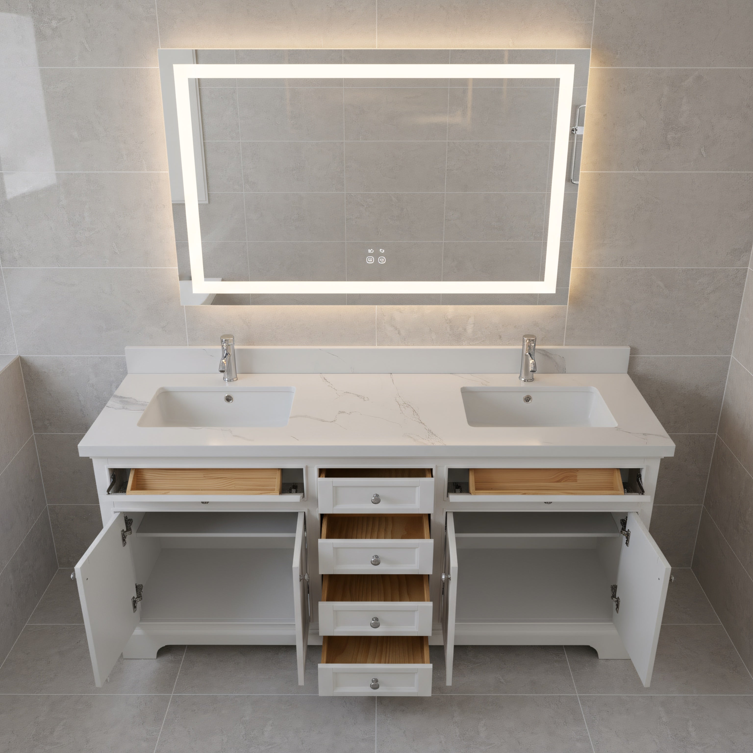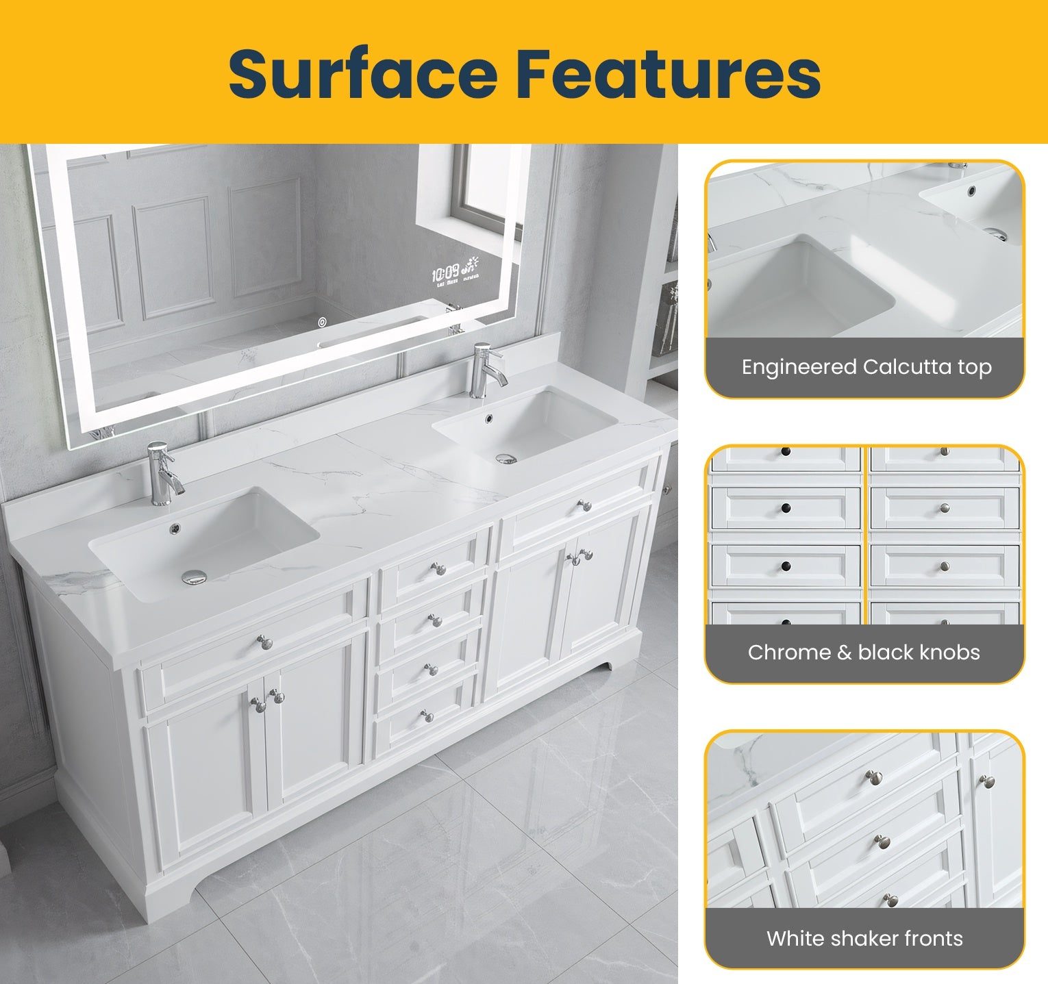 72" White Freestanding Double Sink Bathroom Vanity with Engineered Calcutta Marble Countertop