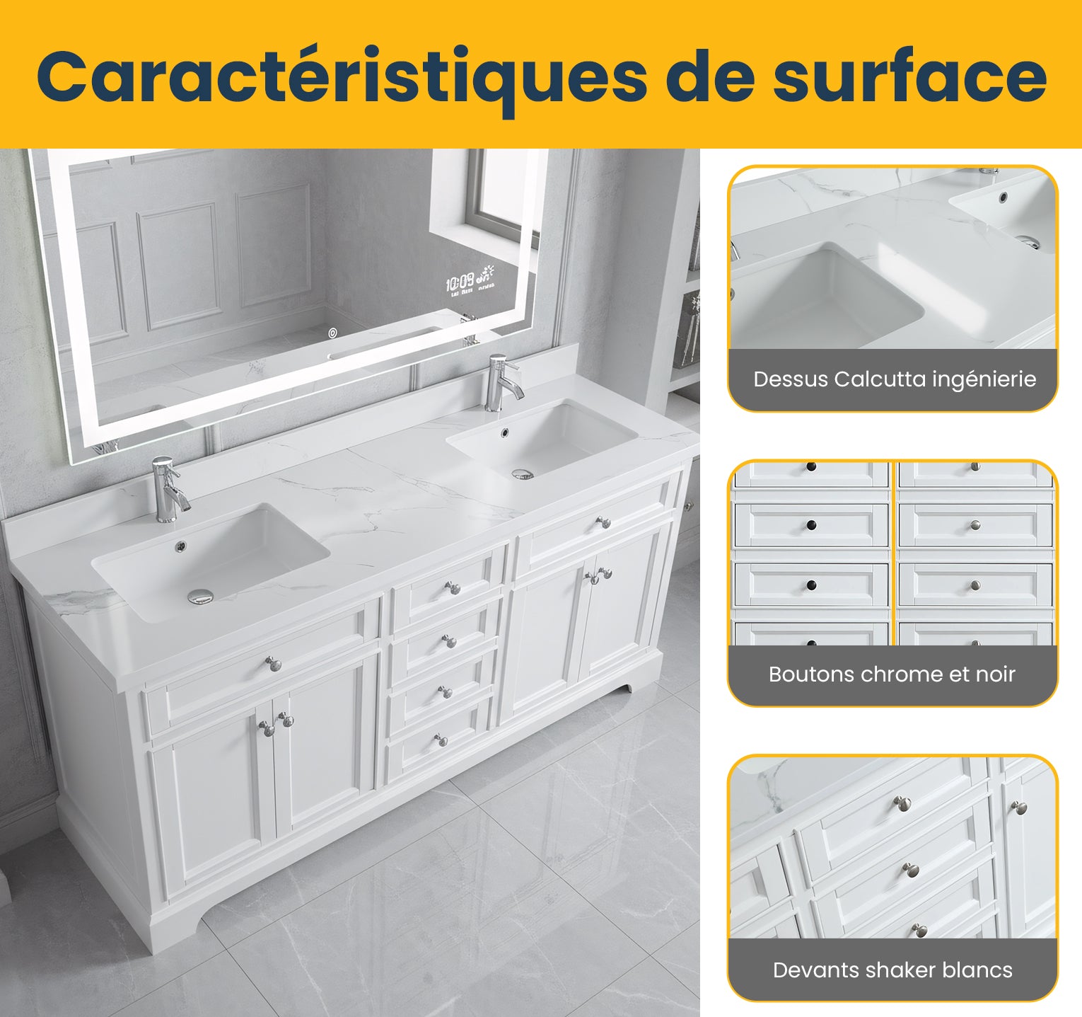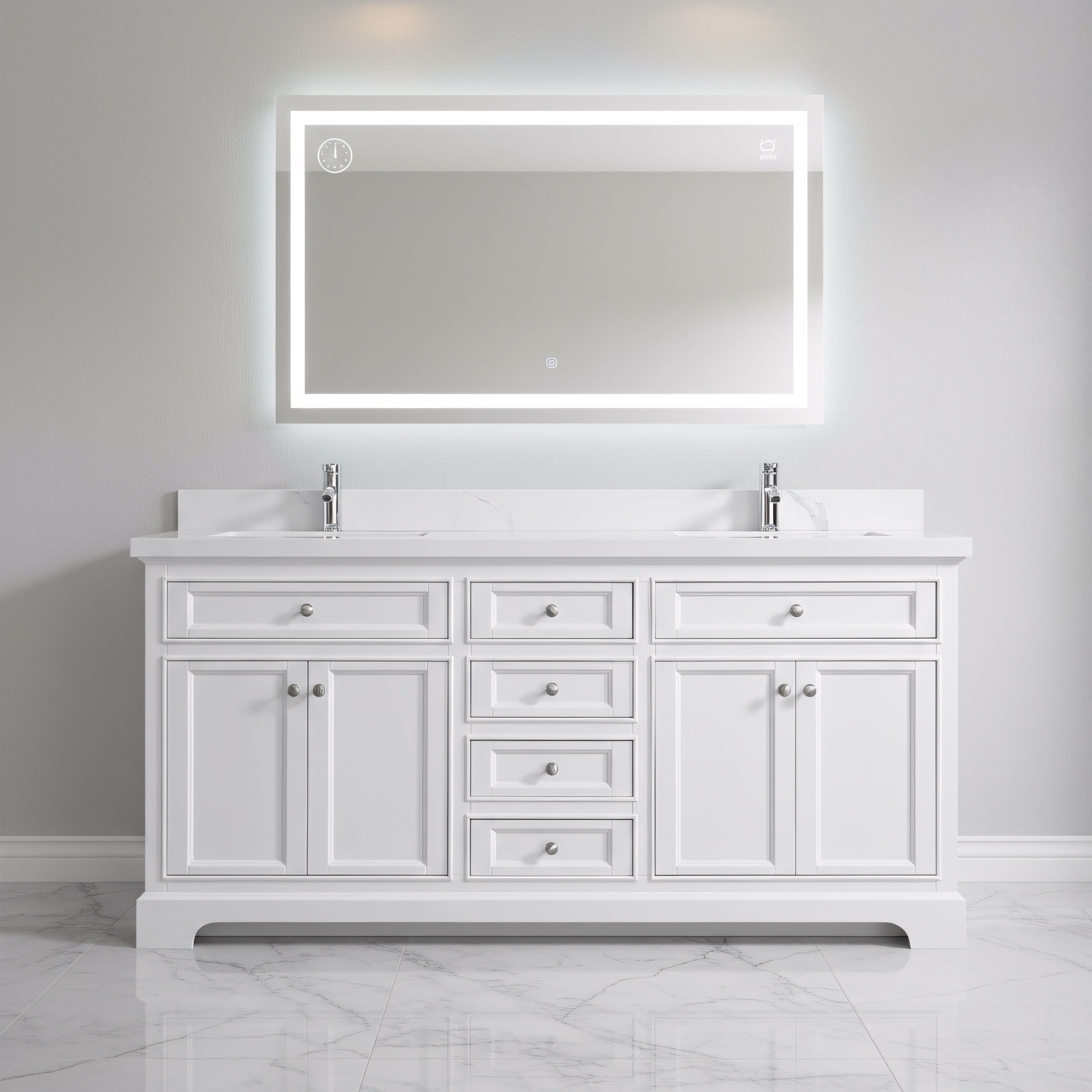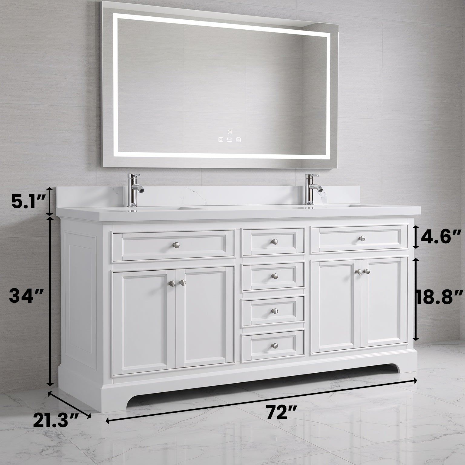 72" White Freestanding Double Sink Bathroom Vanity with Engineered Calcutta Marble Countertop