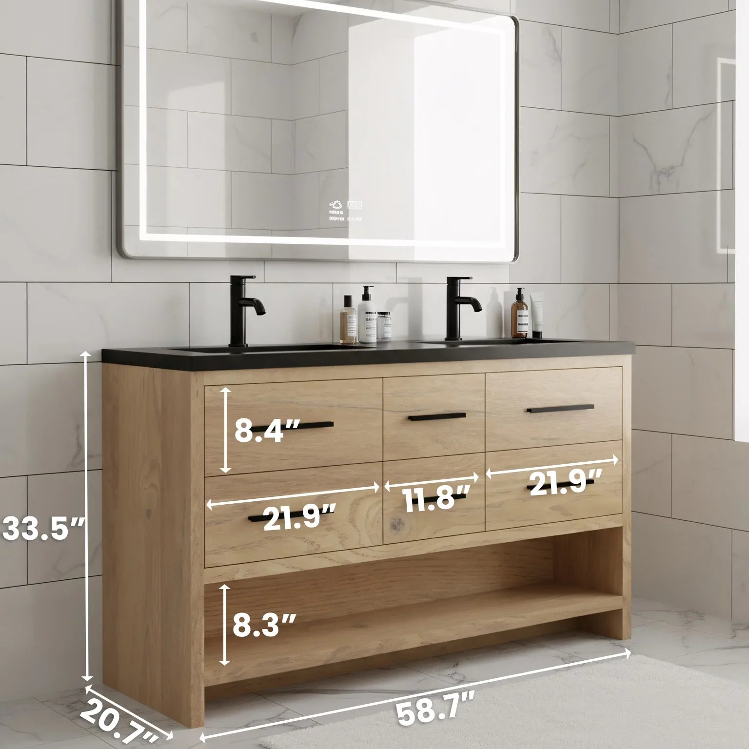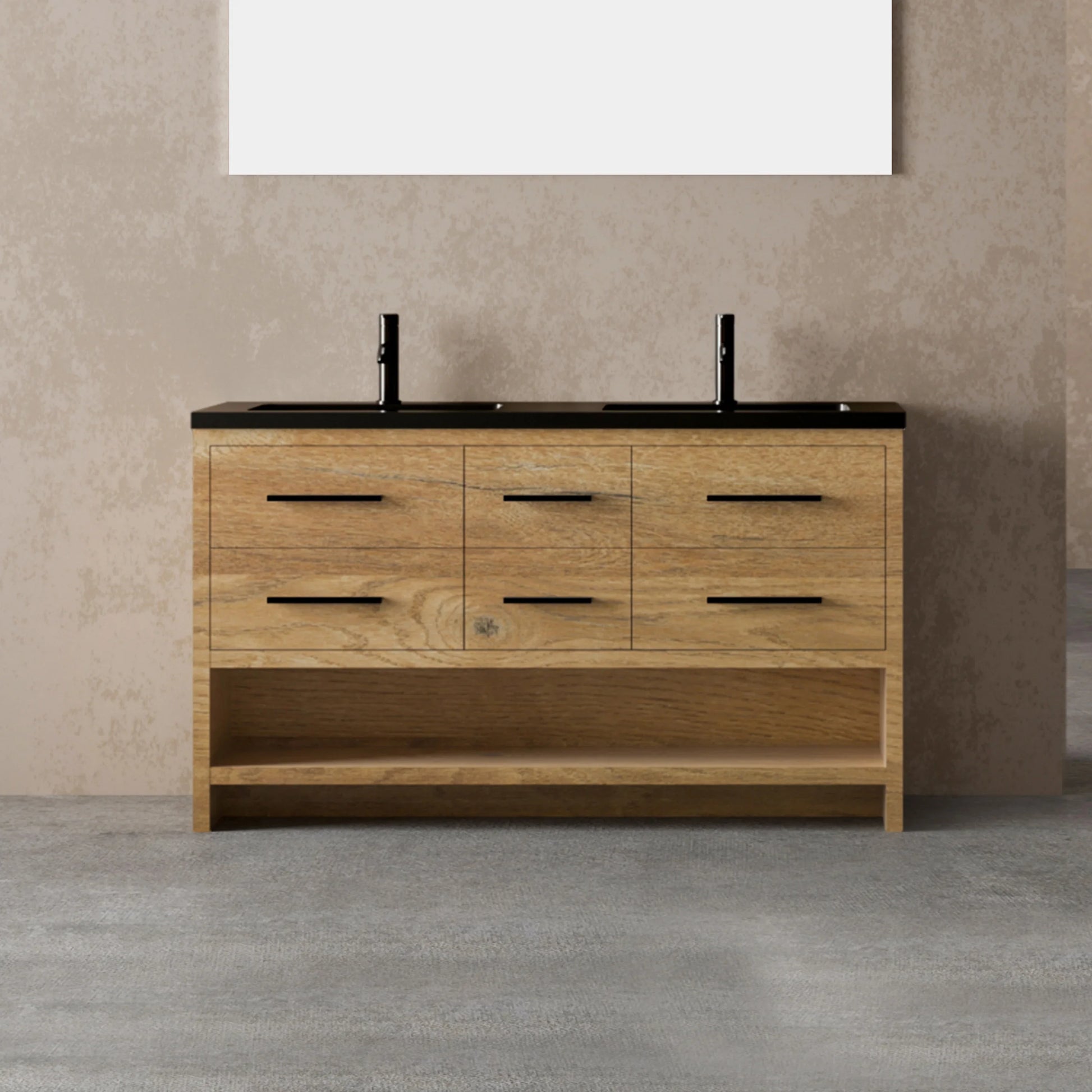 60" Rough Oak Freestanding Double Sink Bathroom Vanity with Black Engineered Quartz Countertop