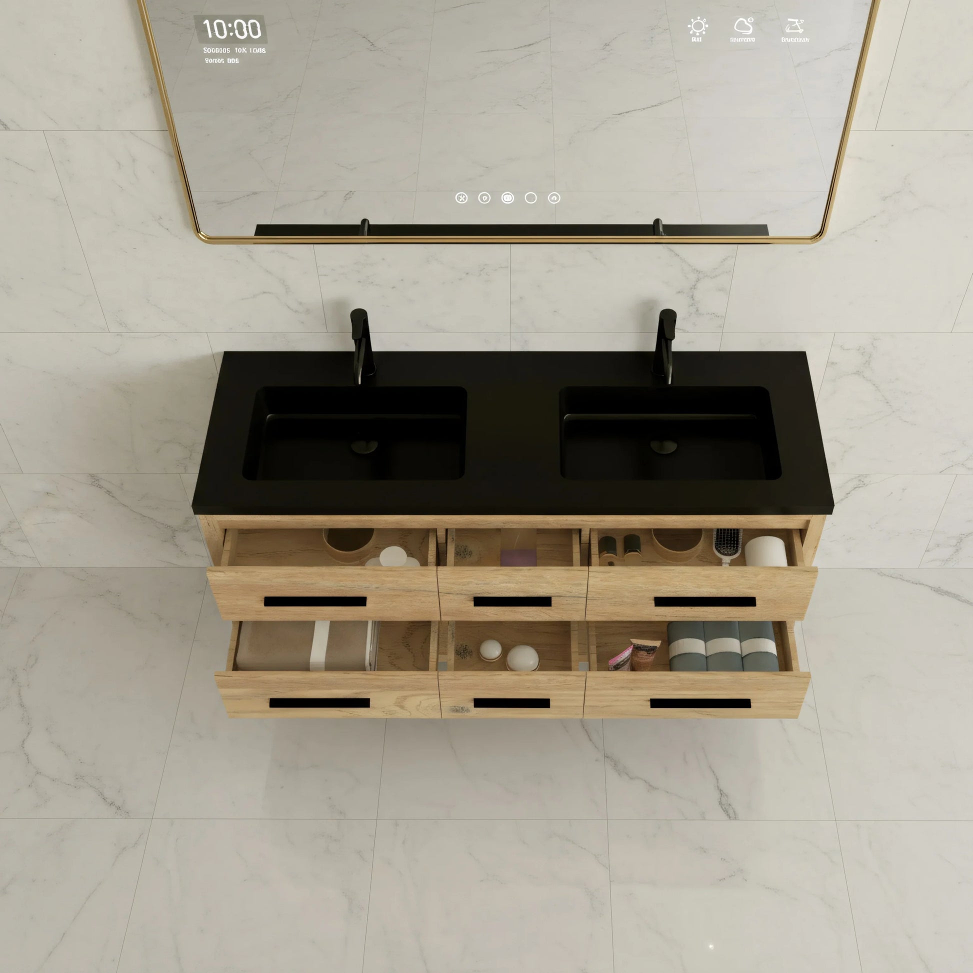 The soft-closing drawers, accented with matte black handles, glide smoothly and quietly for a refined, user-friendly experience. Each drawer is intelligently engineered to work around plumbing systems while still maximizing available storage, ensuring no space goes to waste.