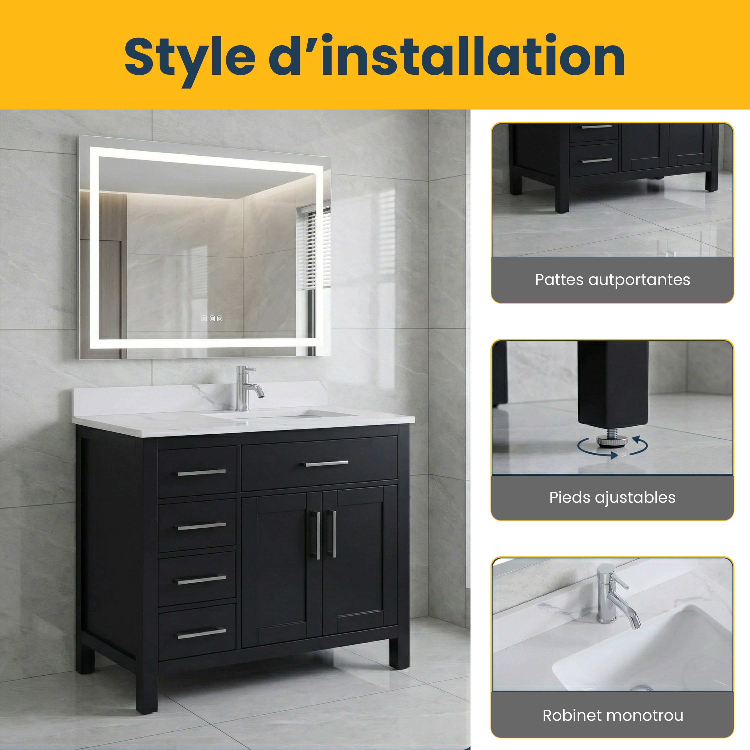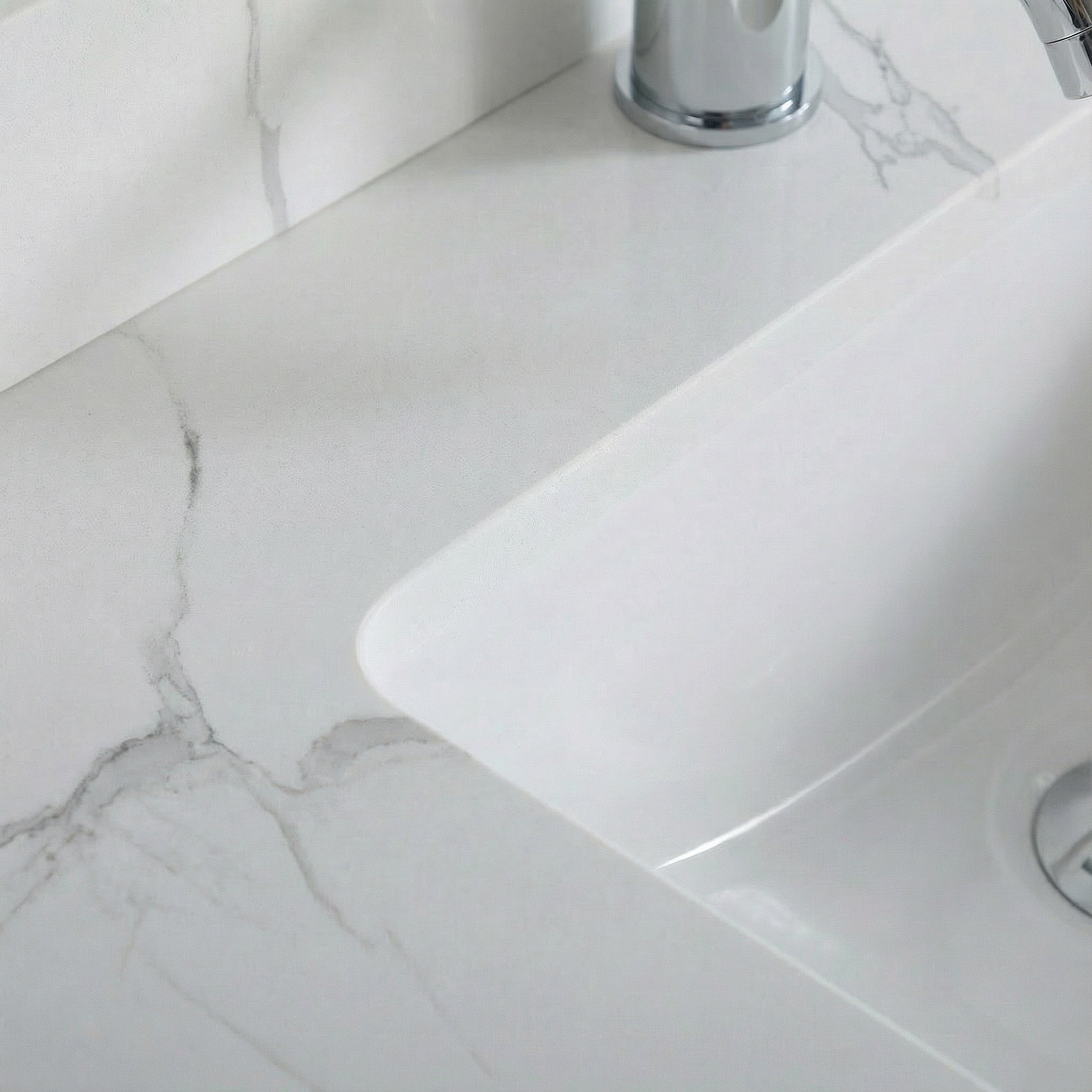 Mella features a solid-hardwood construction, MDF side panels and drawers with soft closing mechanisms for the sheer simplicity of use. It's meticulously chosen white Carrera Marble top demonstrates excellence in quality and craftsmanship and comes polished for an enhanced appearance. Known for simplicity, the Golden Elite Carmela collection comes fully equipped with a pre-mounted CUPC certified under-mount porcelain sink, 4" high matching Marble backsplash, pre-drilled for Mono-faucet, adjustable feet and pop-up drain. Two sets of handles: Chrome & Matte Black Handles.