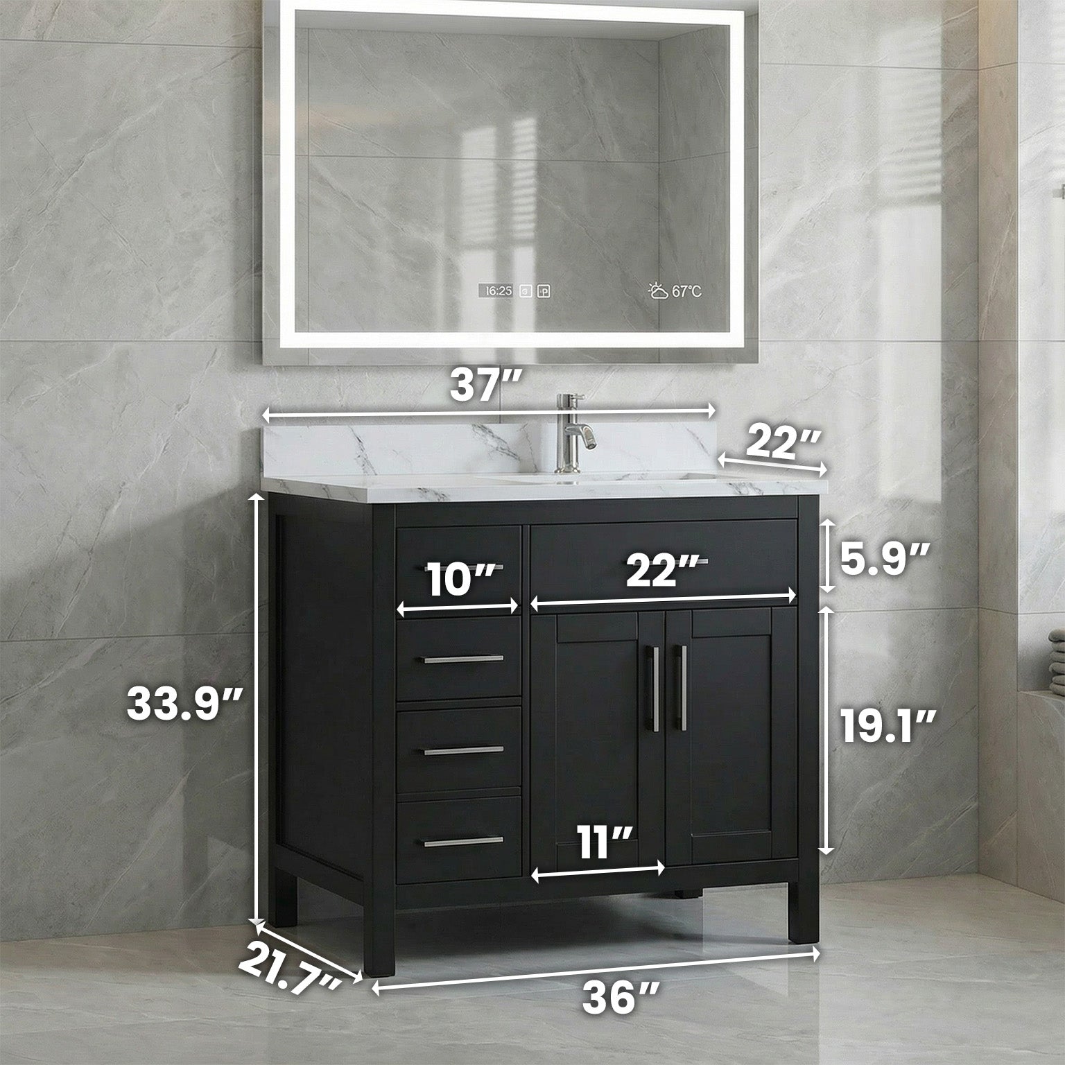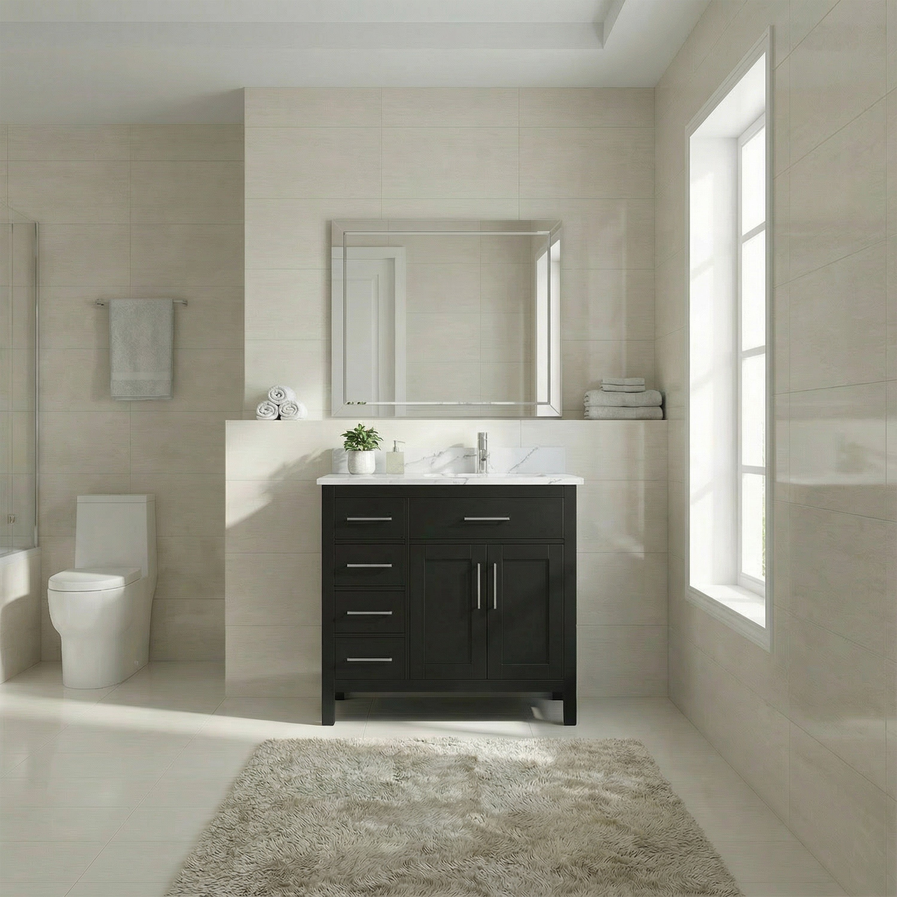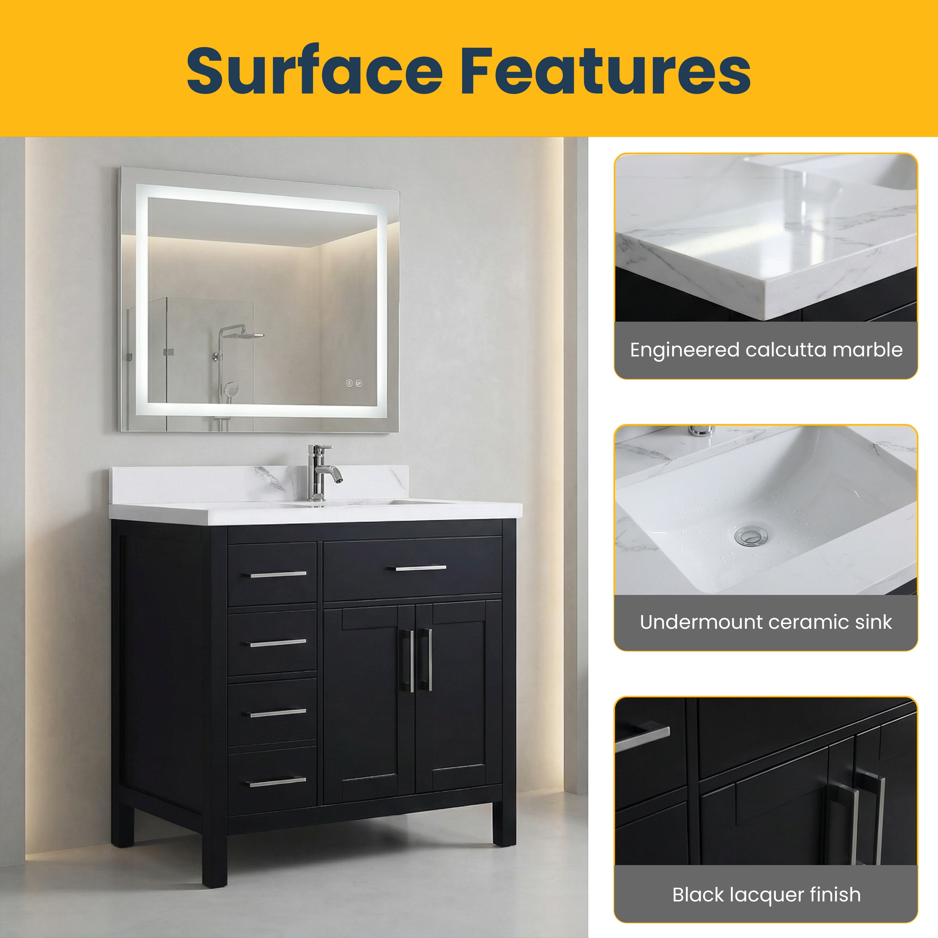 36" Black Freestanding Single Sink Bathroom Vanity with Engineered Calcutta Marble Countertop