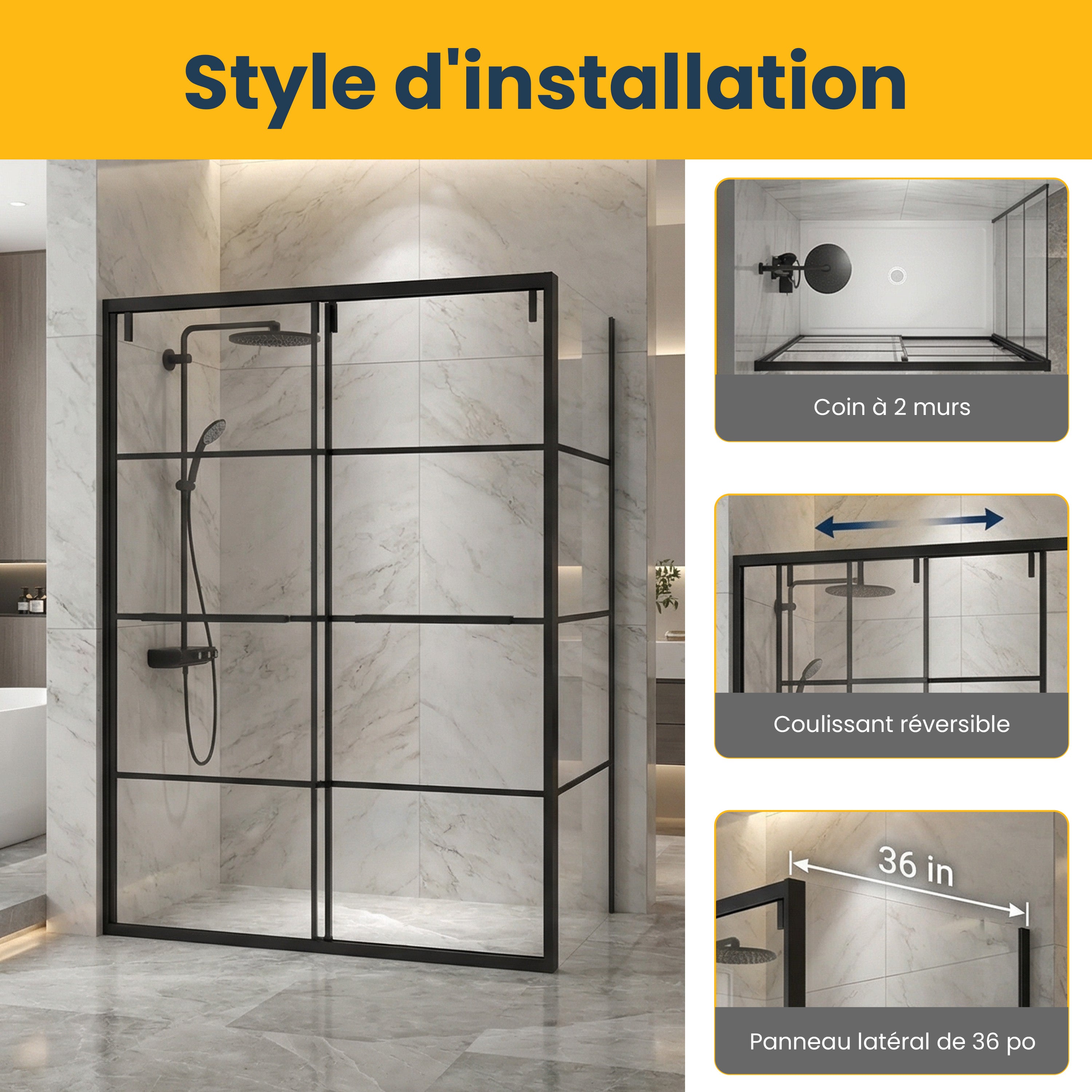 60" x 79" Framed Reversible Sliding Shower Door with 36" Side Panel in Matte Black and Clear Glass Without Base