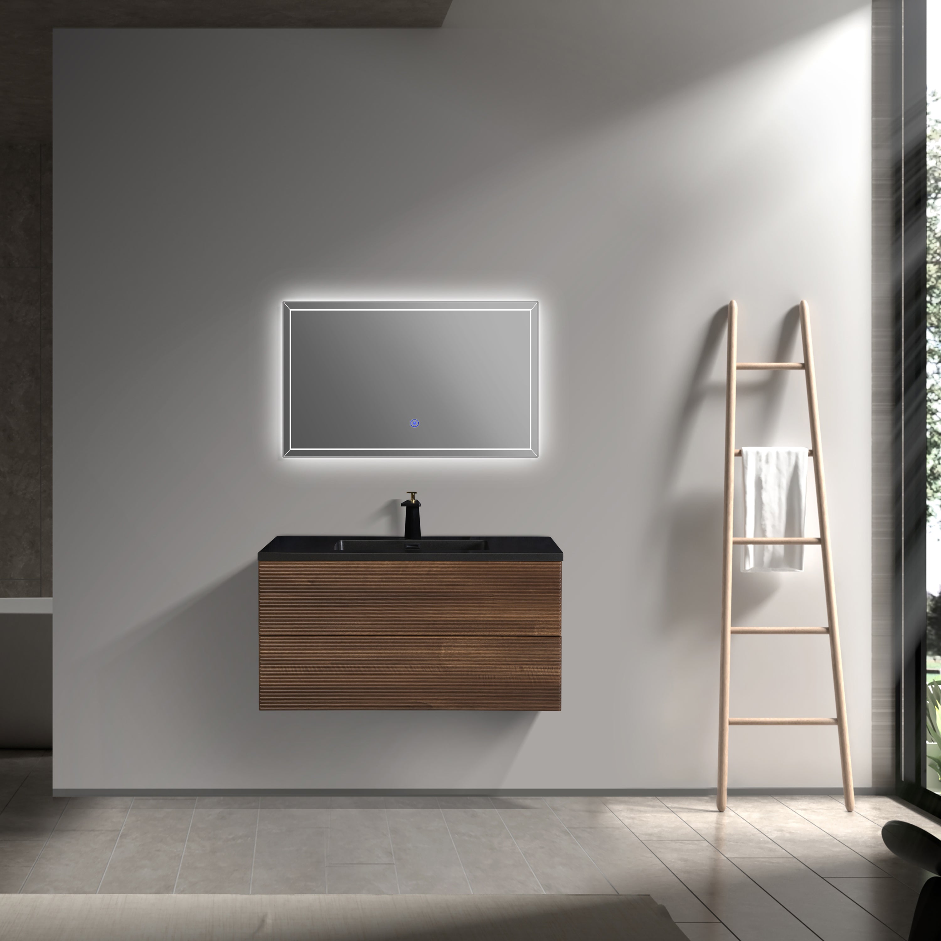 Transform your bathroom into a haven of luxury and refinement with the Catania 40" wall mount vanity. It features a sturdy cabinet crafted from moisture-resistant engineered wood with a sleek Walnut finish and grooved panels at the front. A stunning engineered quartz countertop with a black finish sits on this modern piece, equipped with two deep drawers organize your bathroom essentials. This modern vanity seamlessly blends contemporary design with unparalleled durability, promising to elevate your bathroom to new heights of elegance.