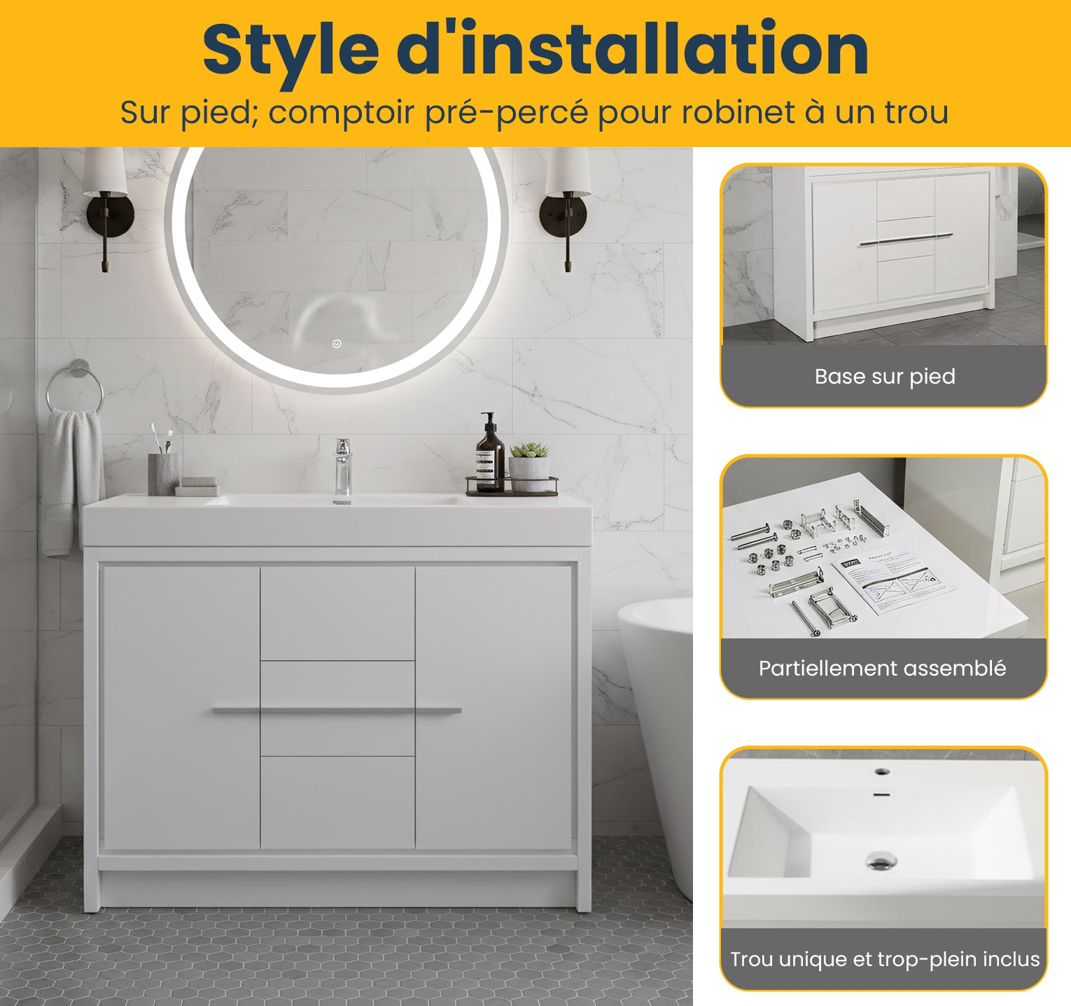 Perfect for medium and large bathrooms, this 48″ vanity from the Allier Collection offers a cohesive all-white aesthetic and practical storage—where modern minimalism meets everyday function.