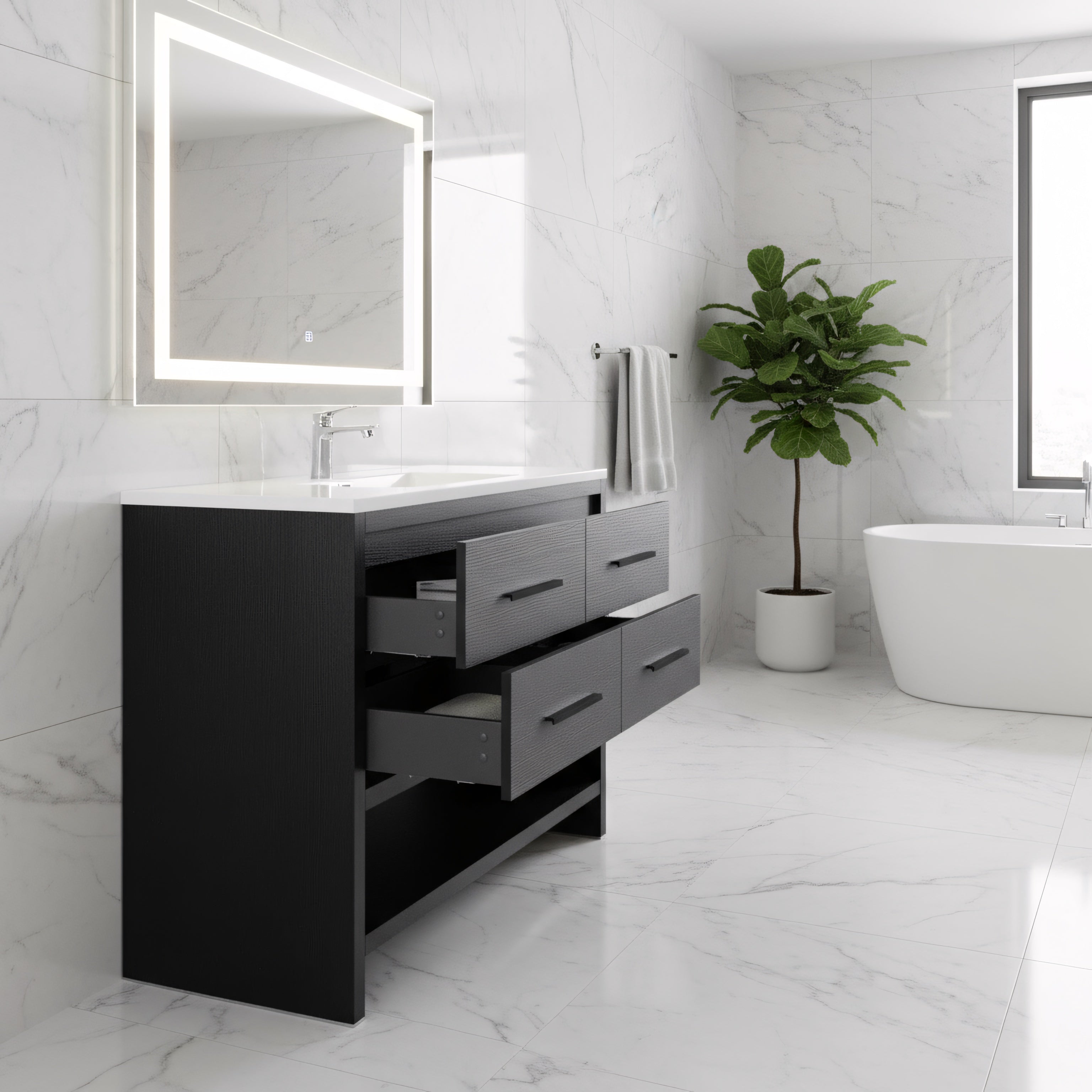 A new collection of Golden Elite freestanding vanities, Fiory adds a contemporary look to any bathroom. Designed to provide you with great storage space, the large vanity cabinet has both open and concealed storage to optimize organization. Soft-closing vanity drawers provide a quiet and elegant experience. The drawers are specifically designed to accommodate plumbing and give you the most amount of storage space out of your vanity.