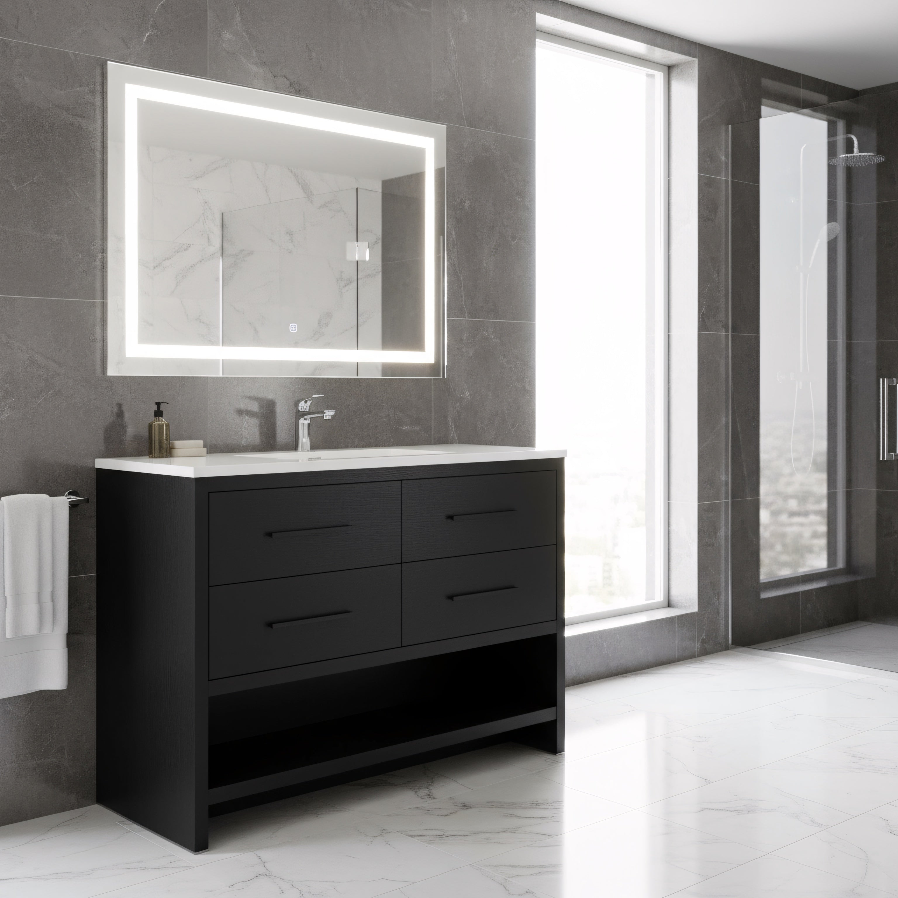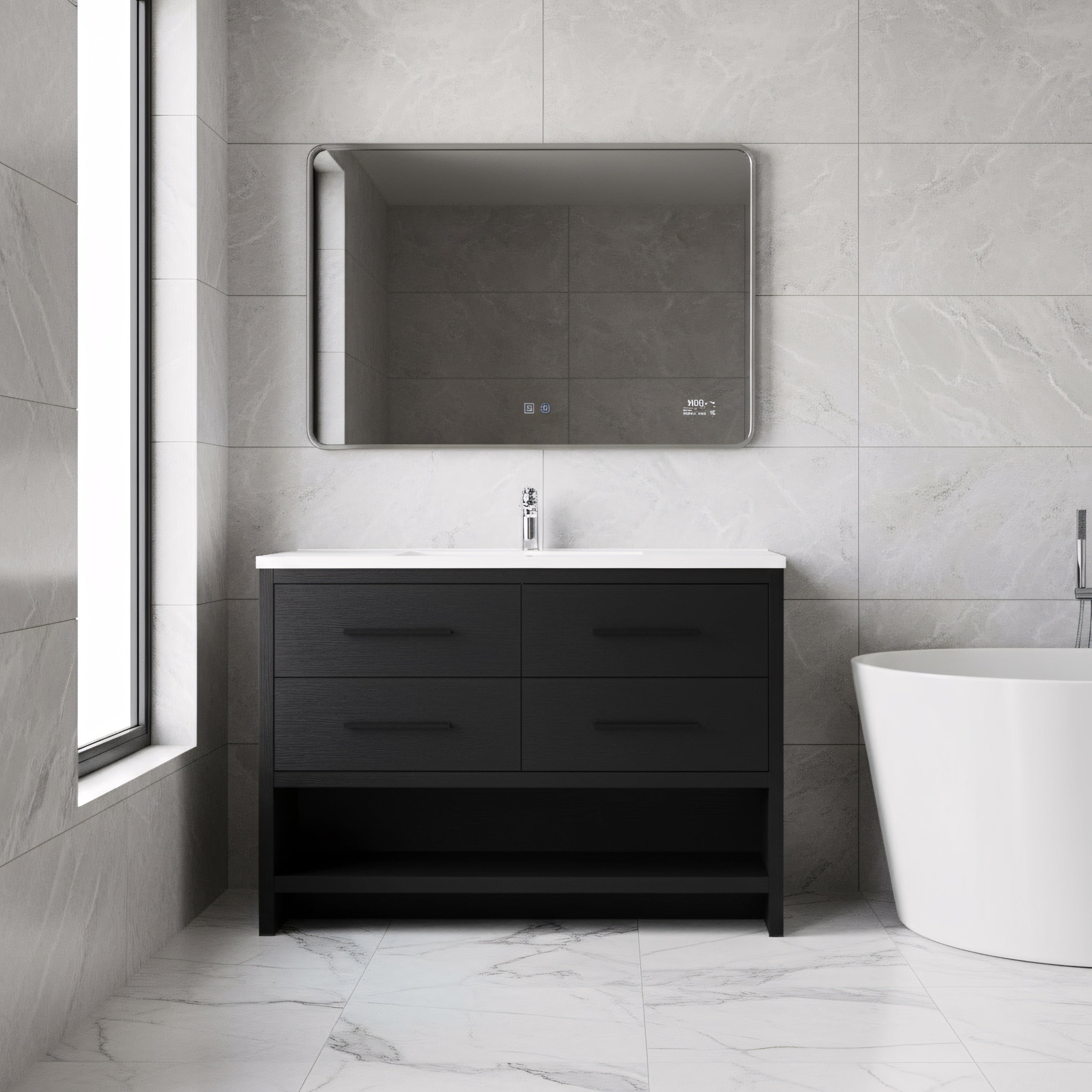 48" Black Rough Oak Freestanding Bathroom Vanity with White Polymarble Countertop