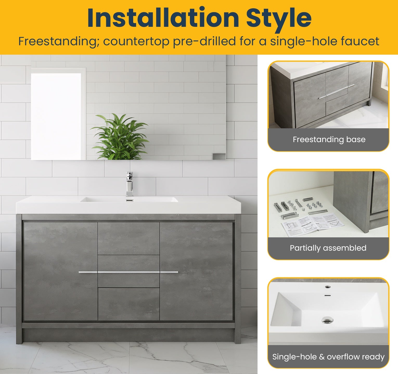 60" Cement Freestanding Single Sink Bathroom Vanity with White Polymarble Countertop