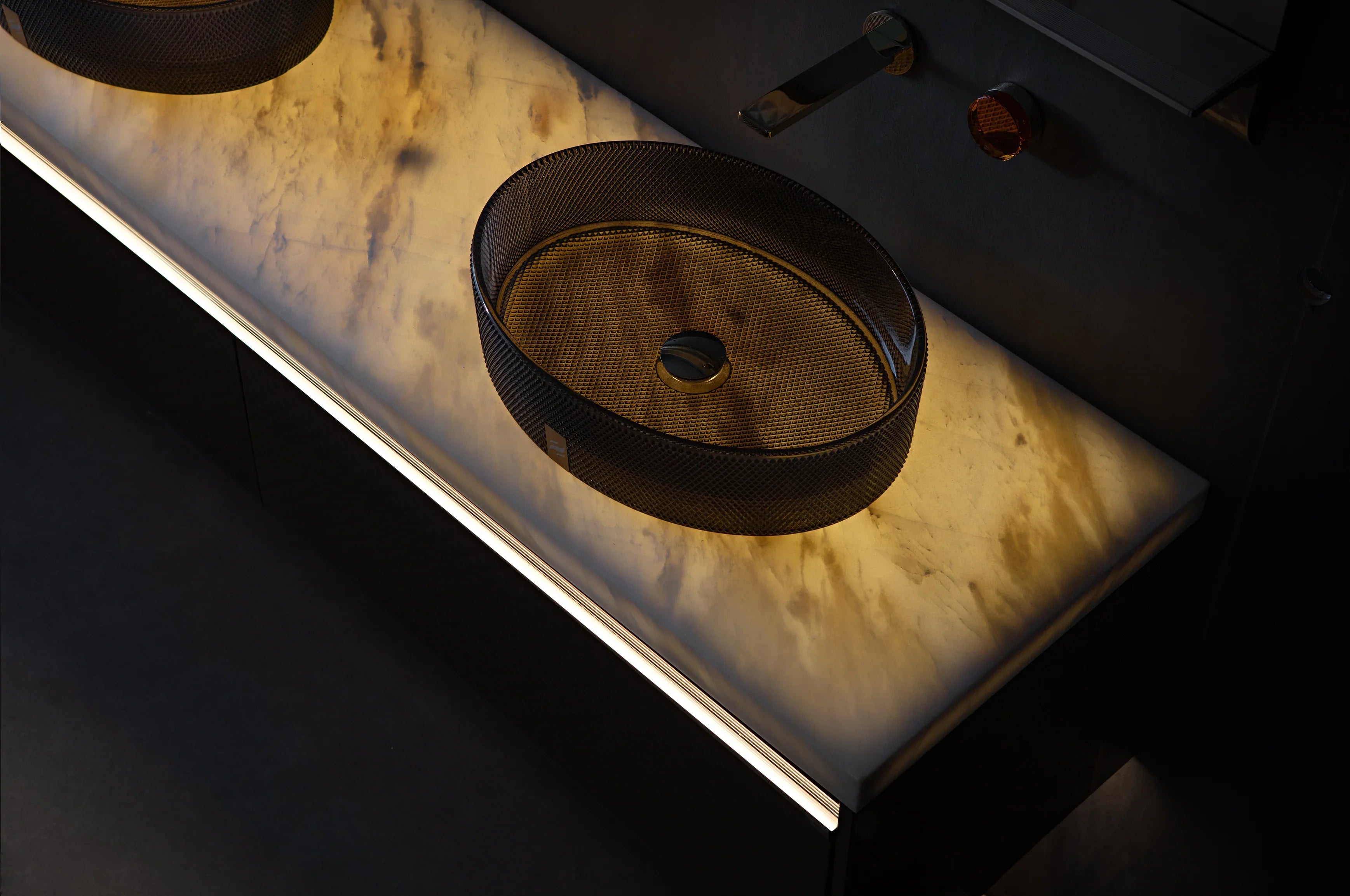 Royal White Jade Marble countertop: Genuine natural stone with double crystal sinks and overflows; pre-drilled for dual faucets