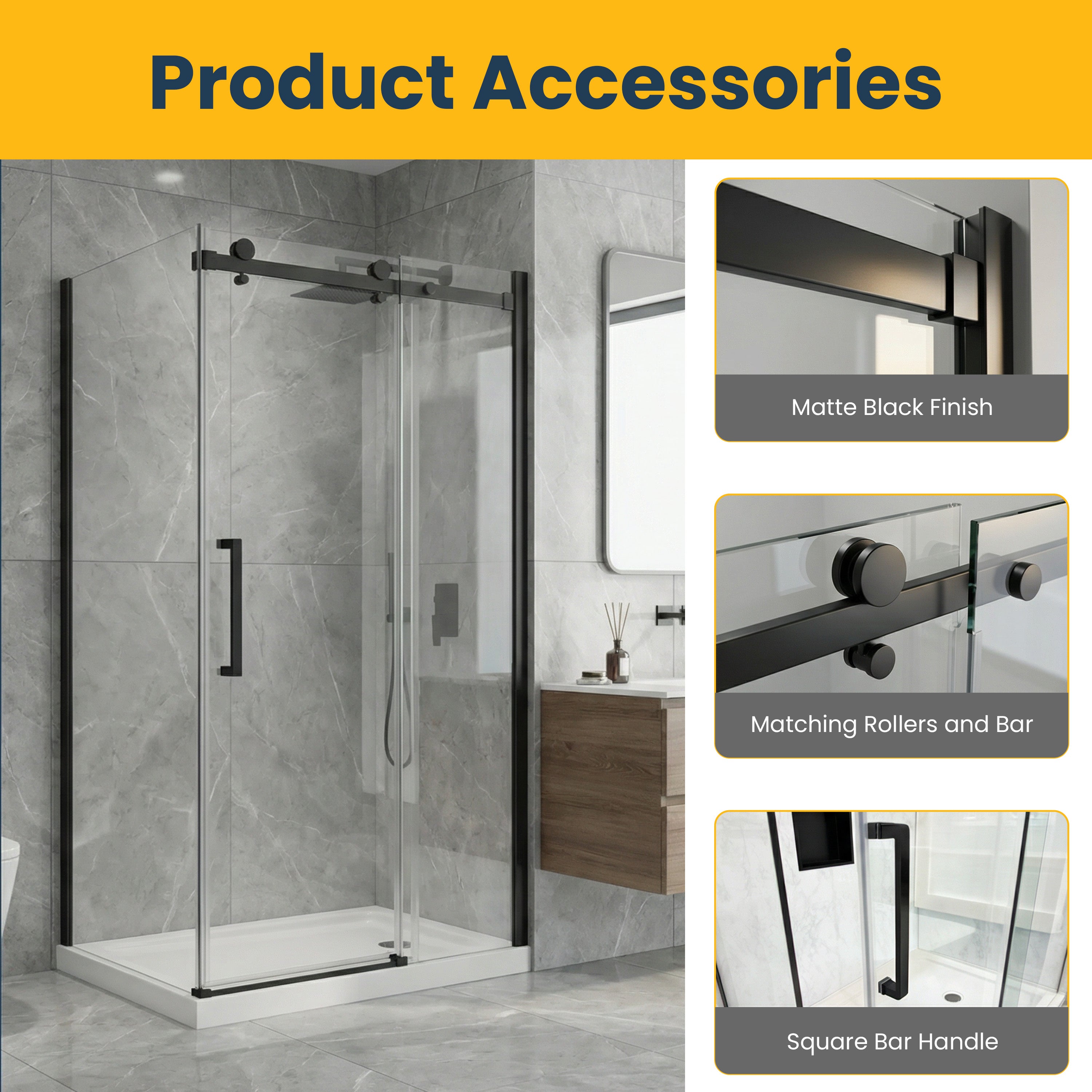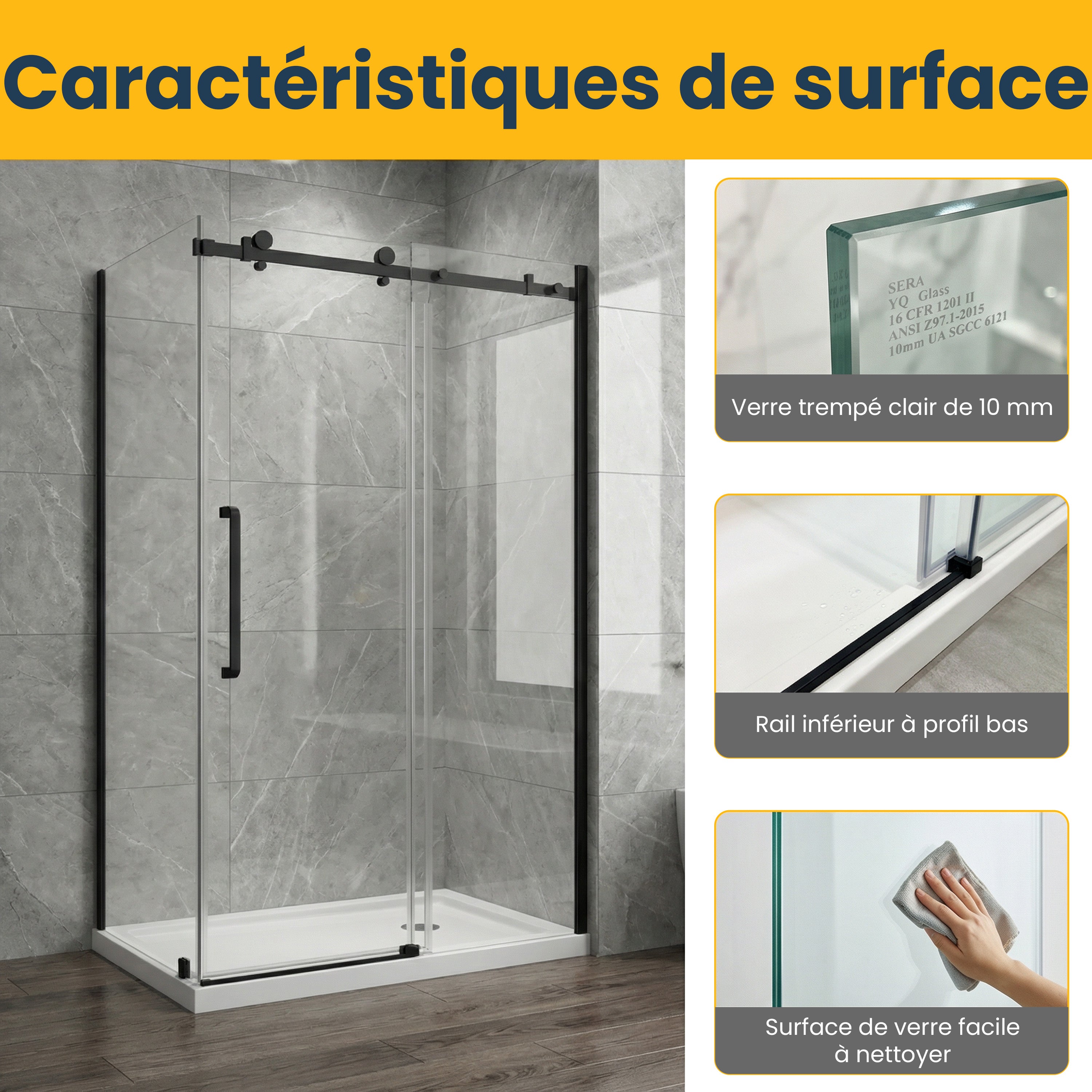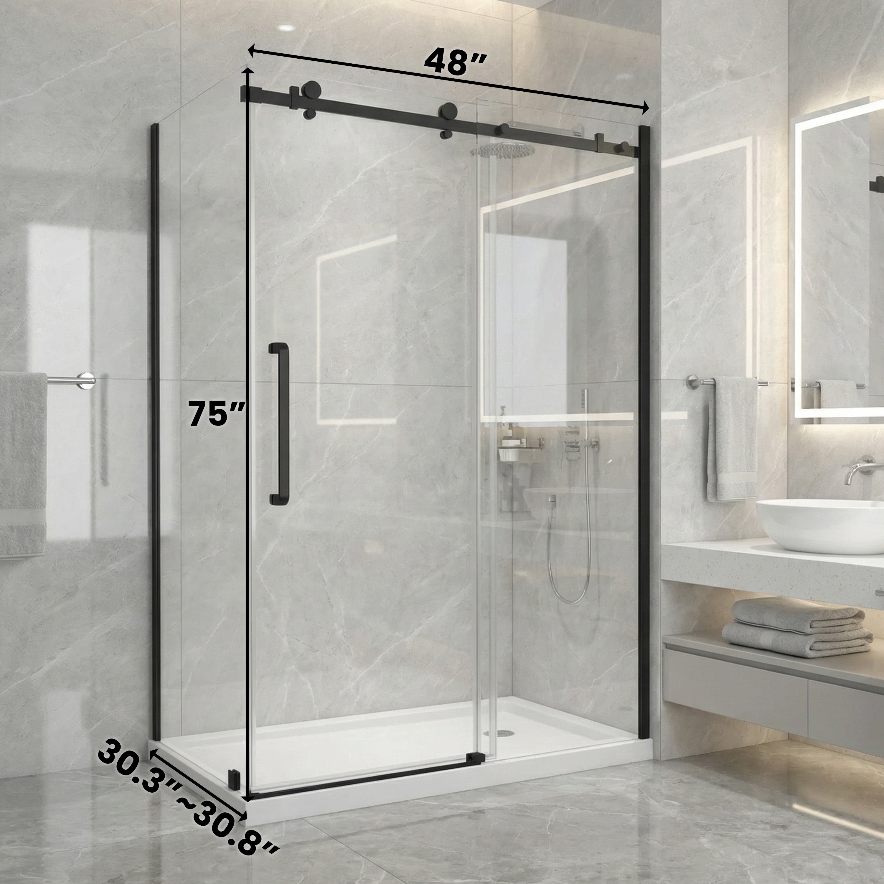 10 mm tempered glass sliding door, 5 years warranty. 48" x 75" without base. Designed for a 2-wall setup with square hardware.