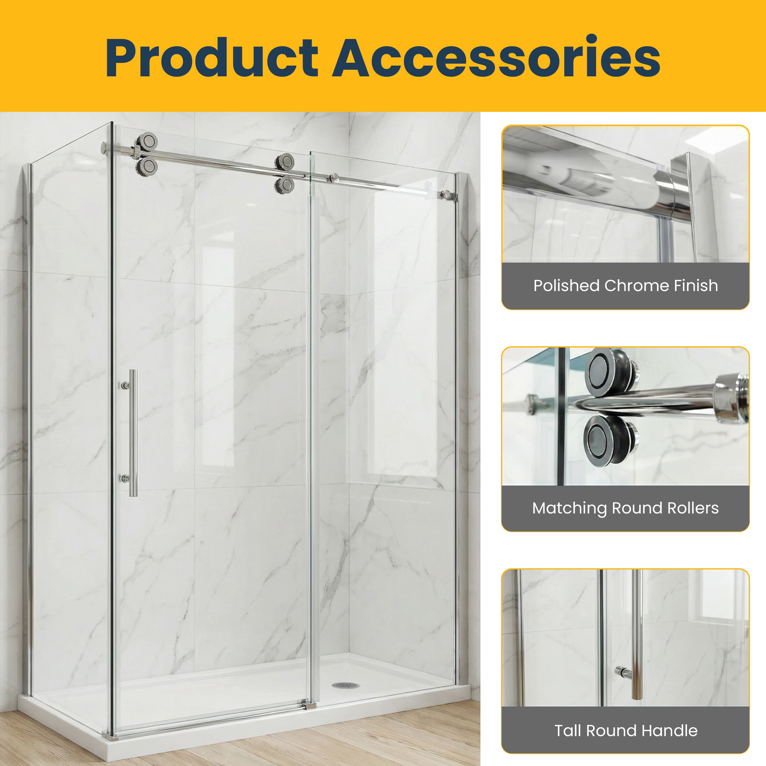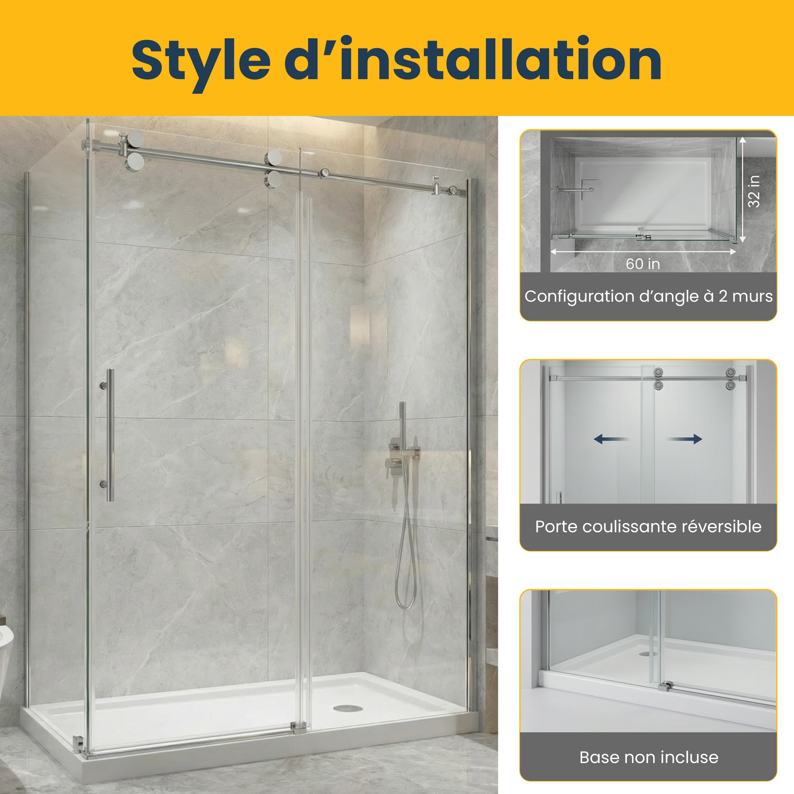 10 mm tempered glass sliding door, 5 years warranty. 60" x 32" x 75" without base and round style. Designed for a 2-wall setup. Chrome Round hardware