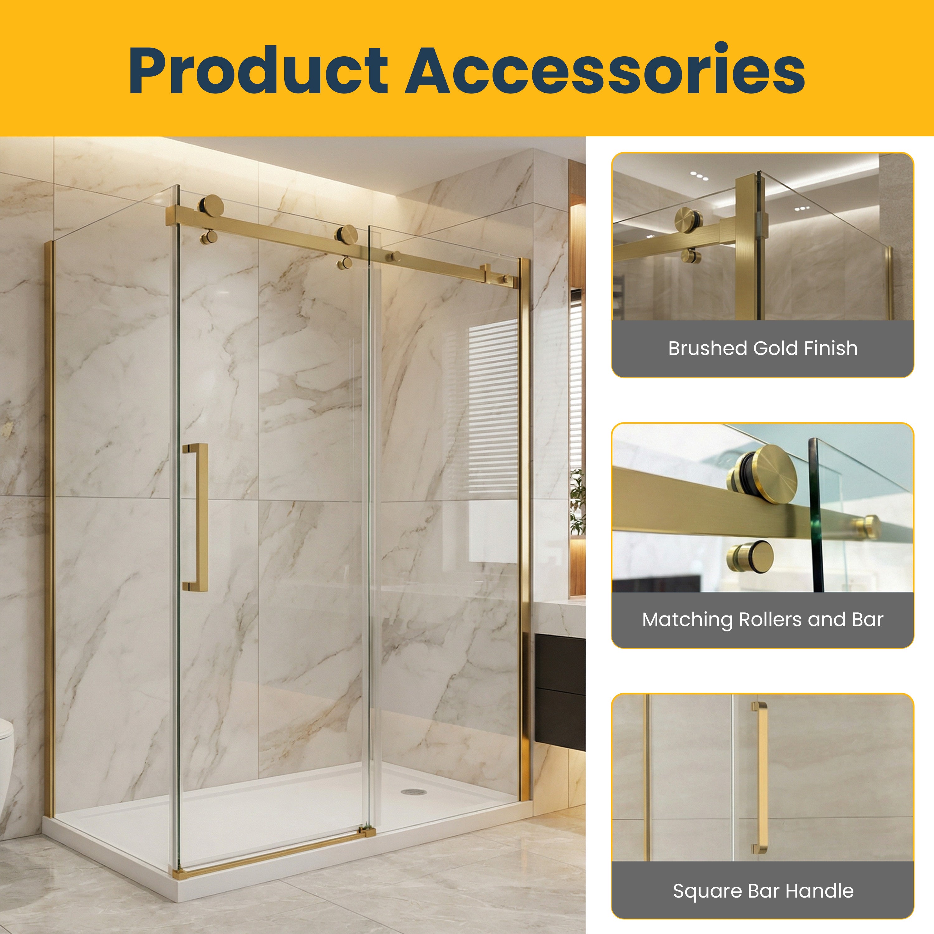 10 mm tempered glass sliding door, 5 years warranty. 60" x 36" x 75" without base and square Brushed Gold style. Designed for a 2-wall setup.