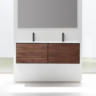 60" Walnut Wall Mount Double Sink Bathroom Vanity with Matte White Solid Surface Countertop