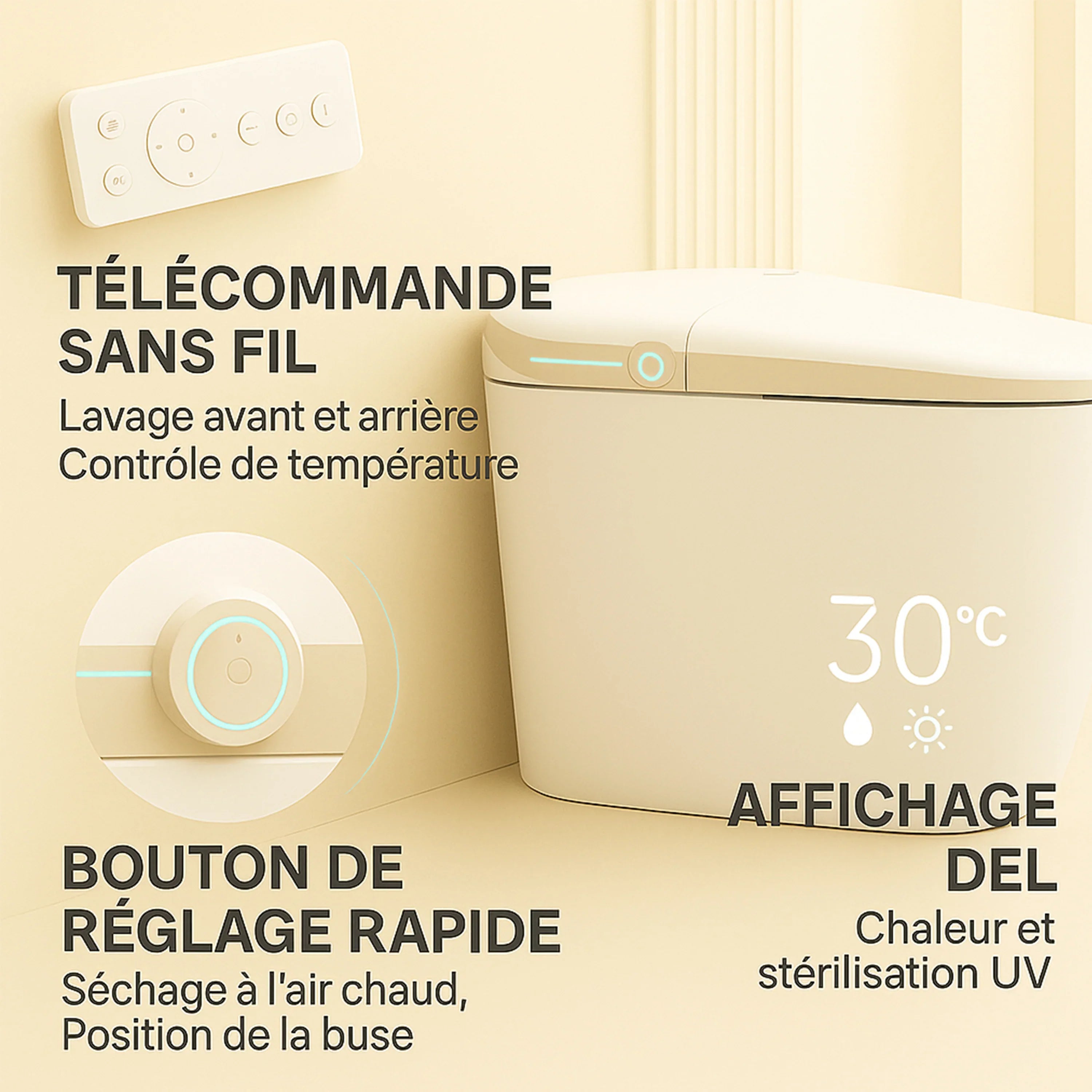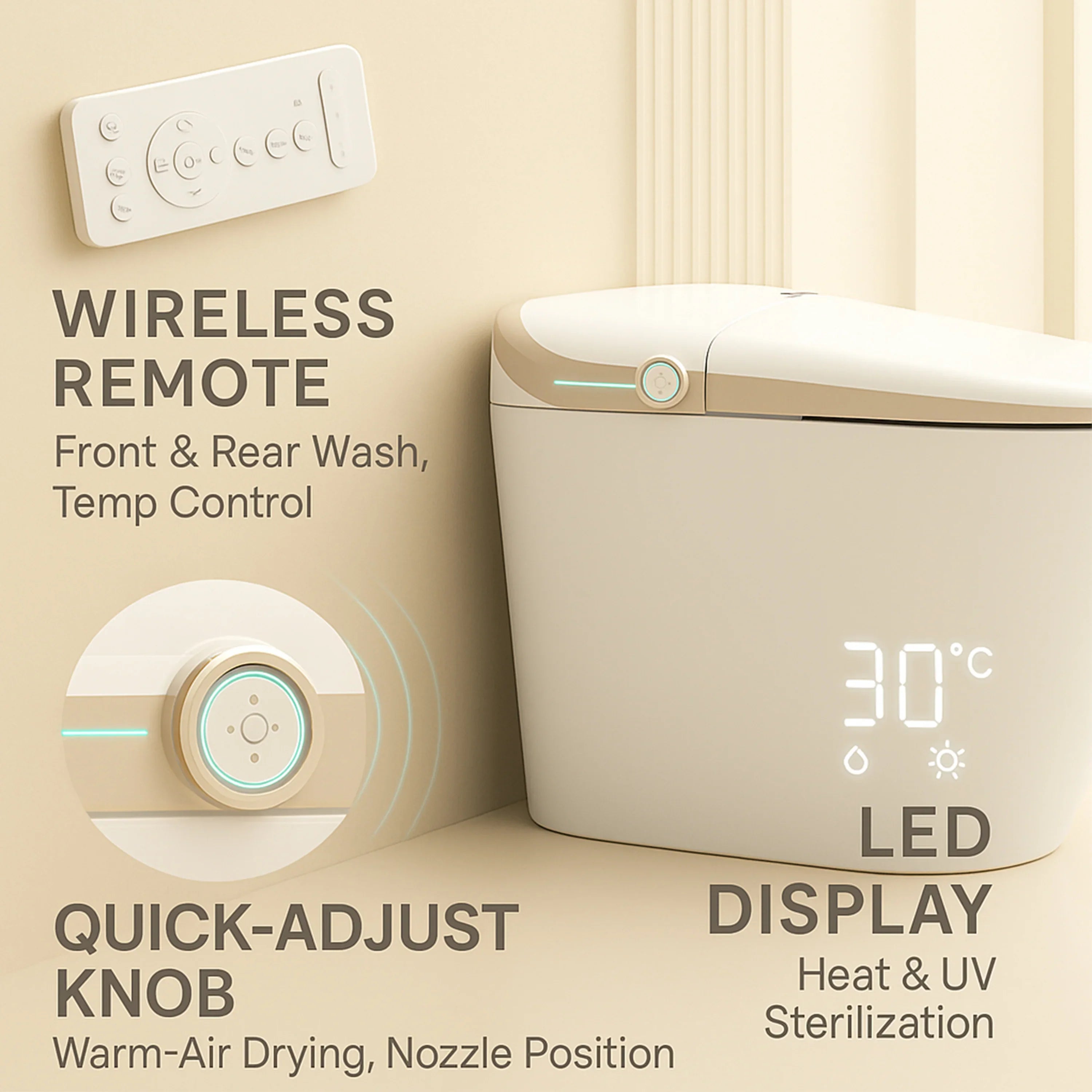 - Bidet with Temperature Control: Hip and feminine wash modes.