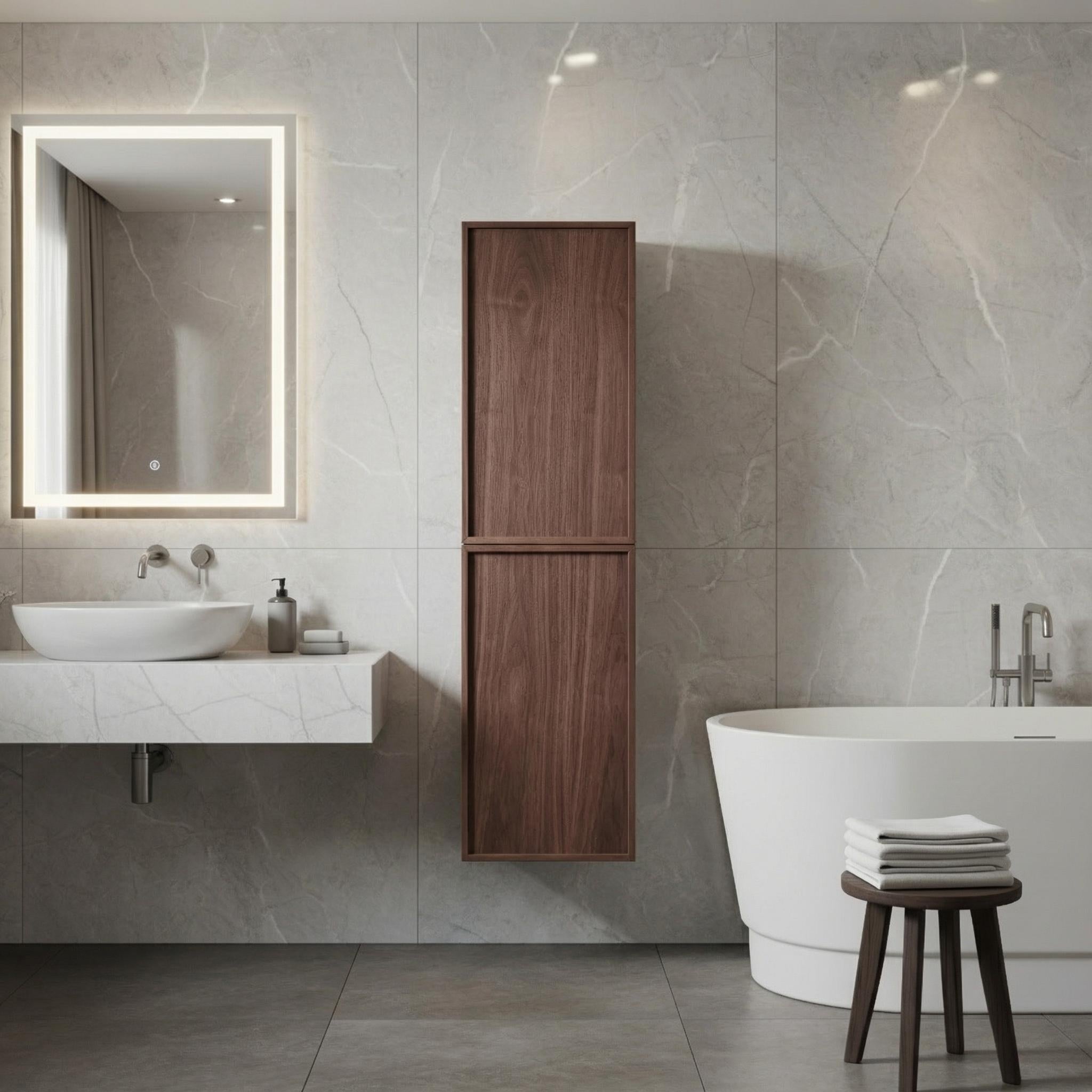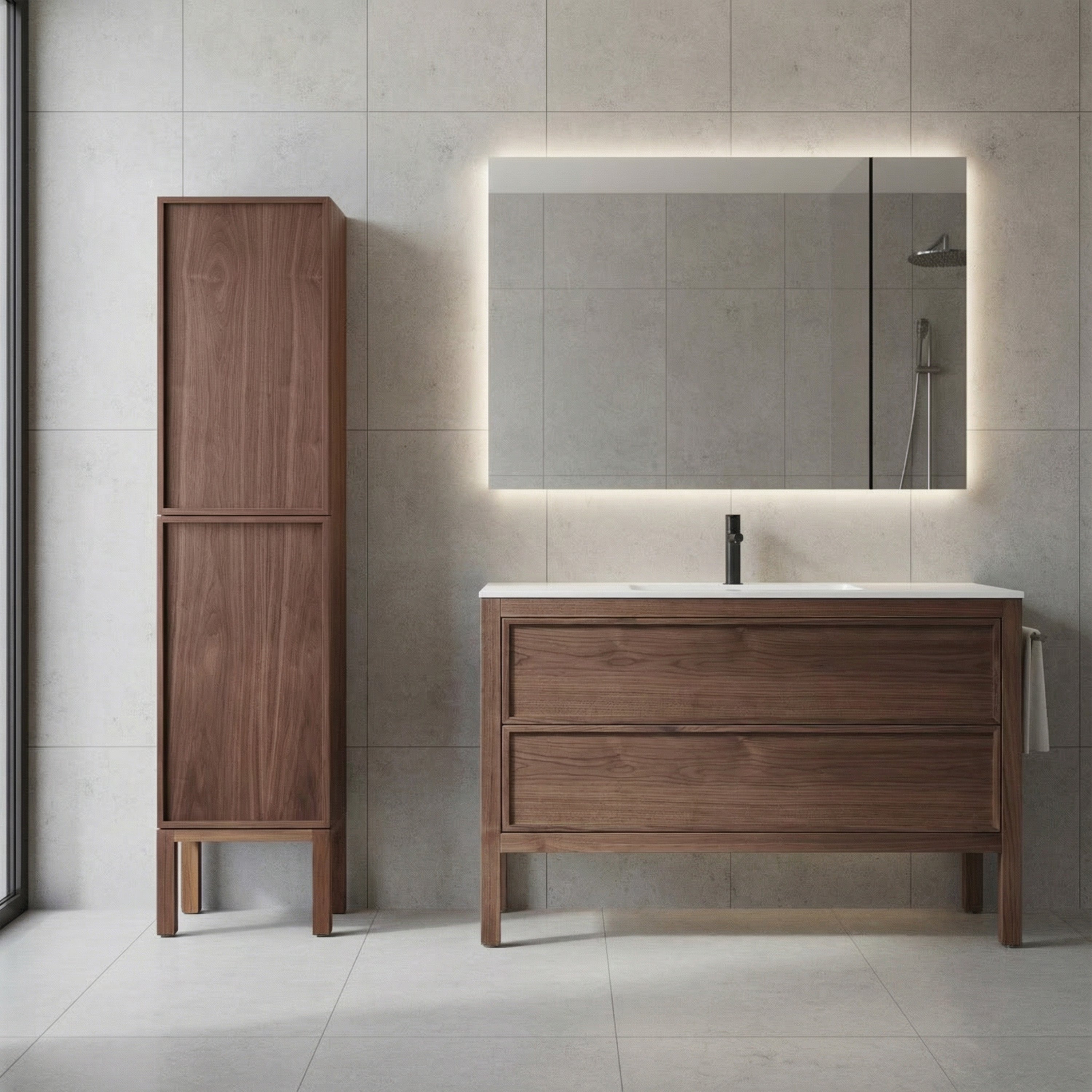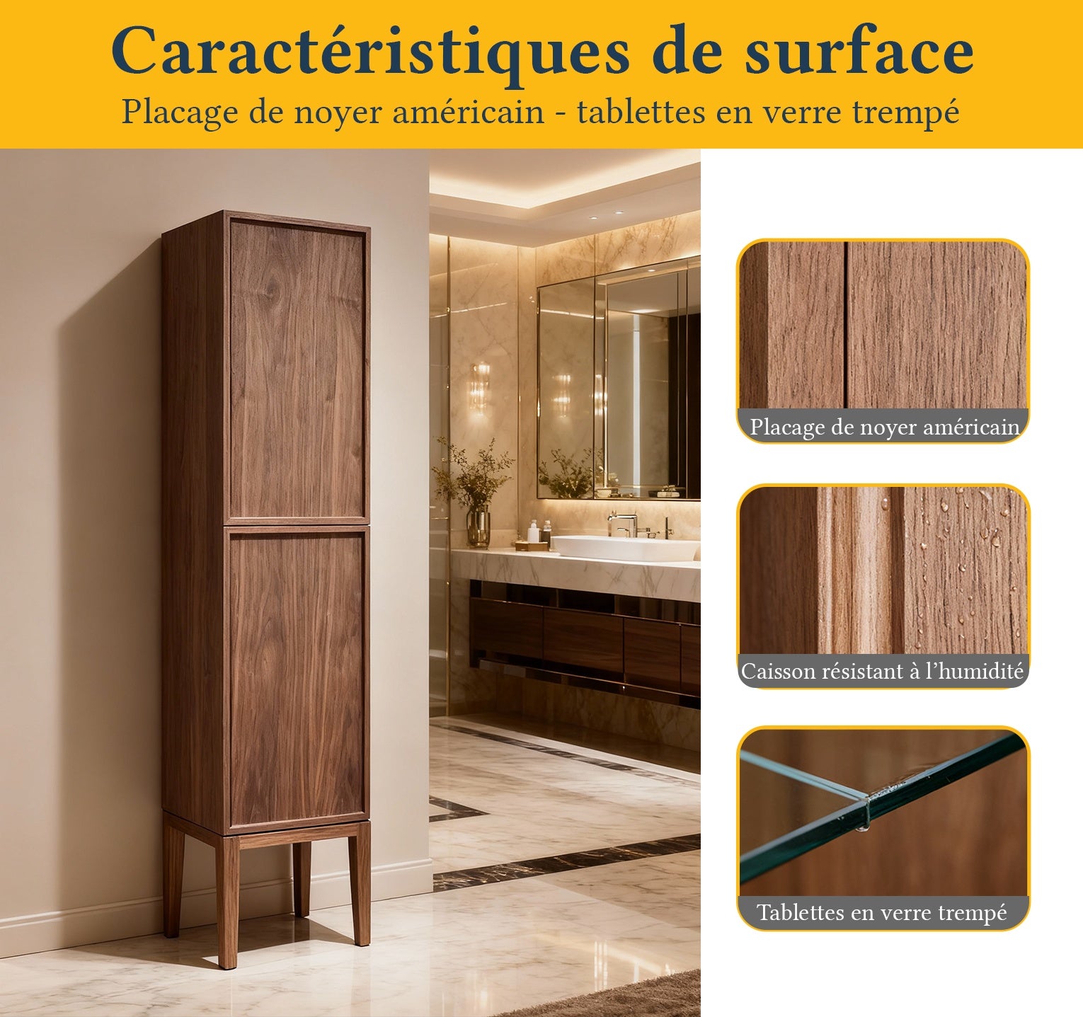 - Matériaux - Bois massif et contreplaqué résistant à l'humidité avec placage en noyer américain, assurant durabilité dans les conditions humides de la salle de bain tout en conservant une apparence luxueuse