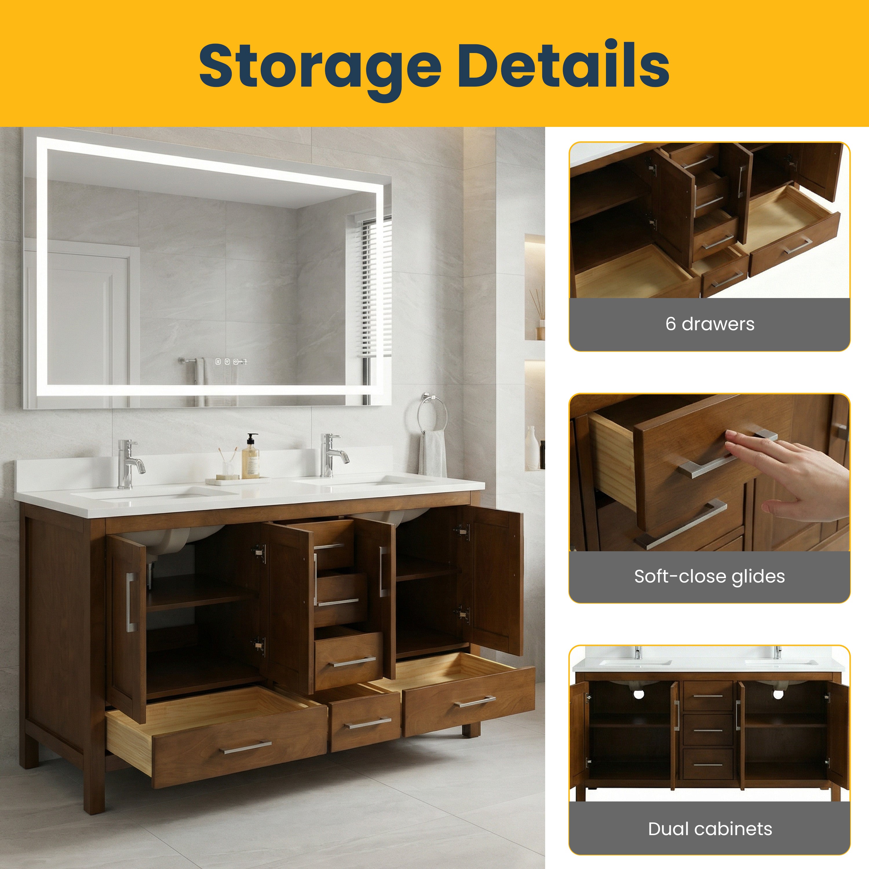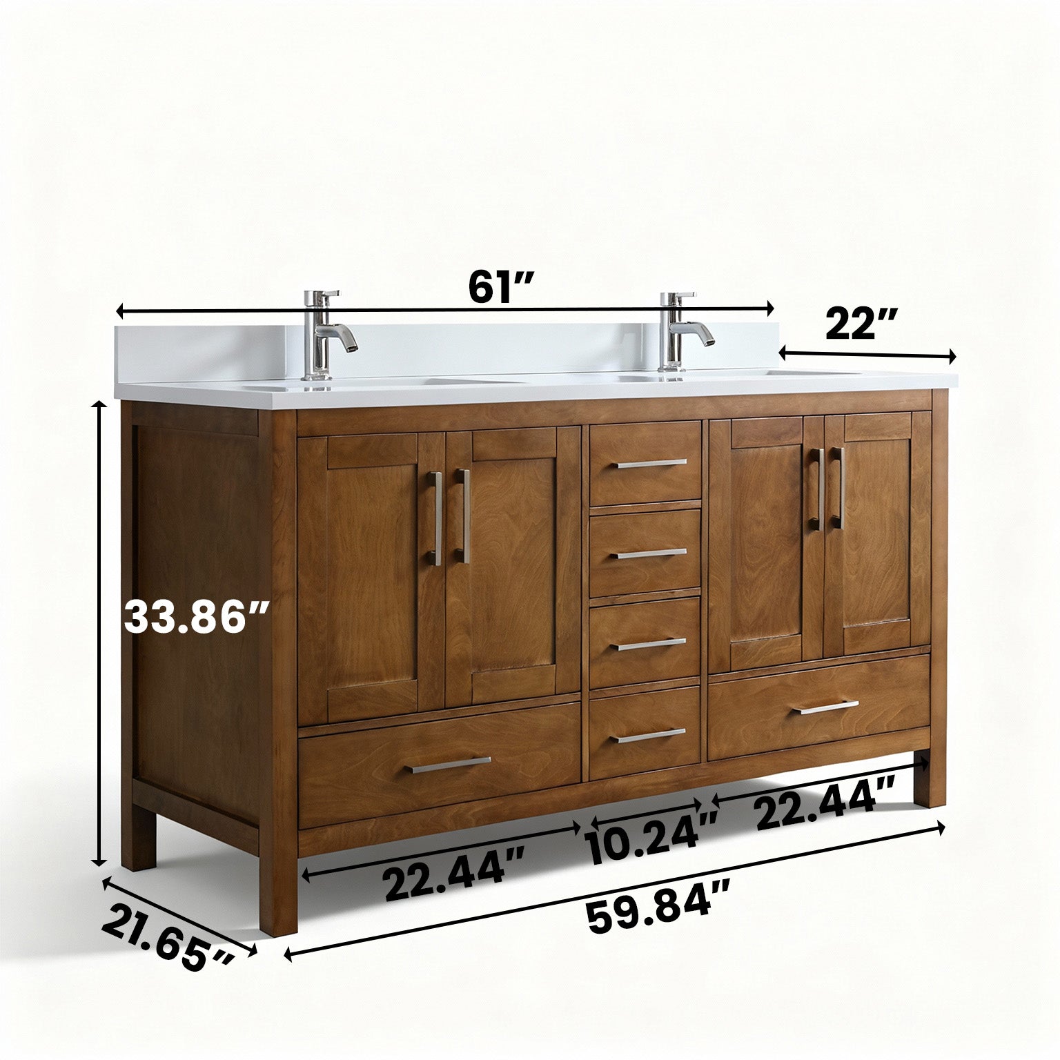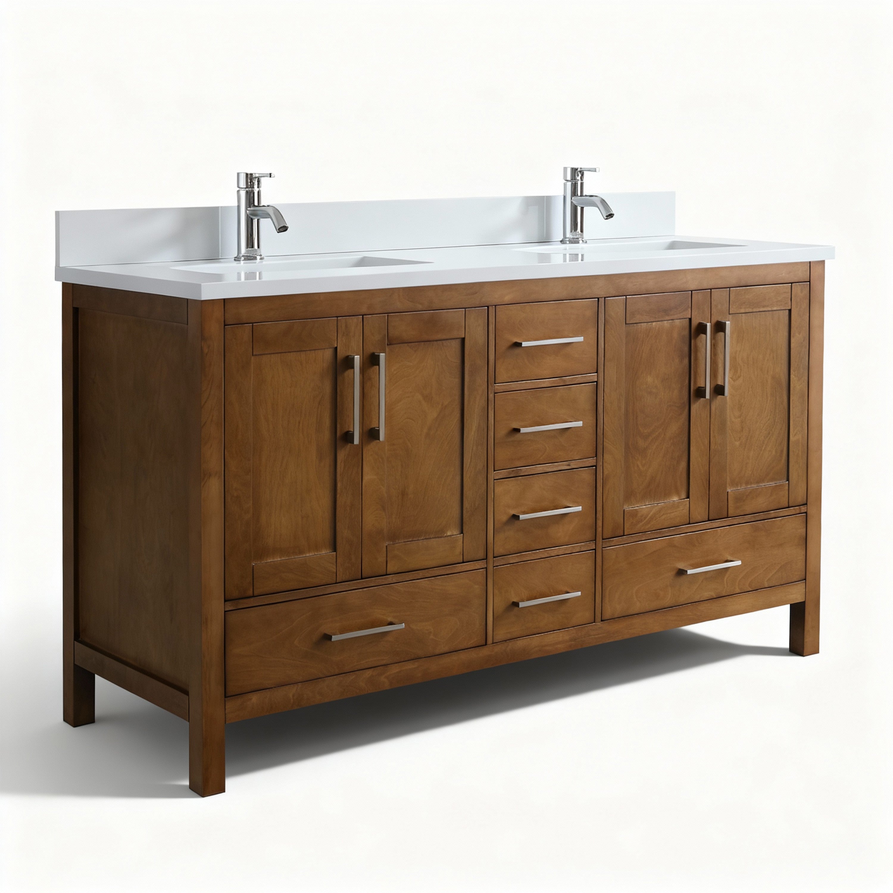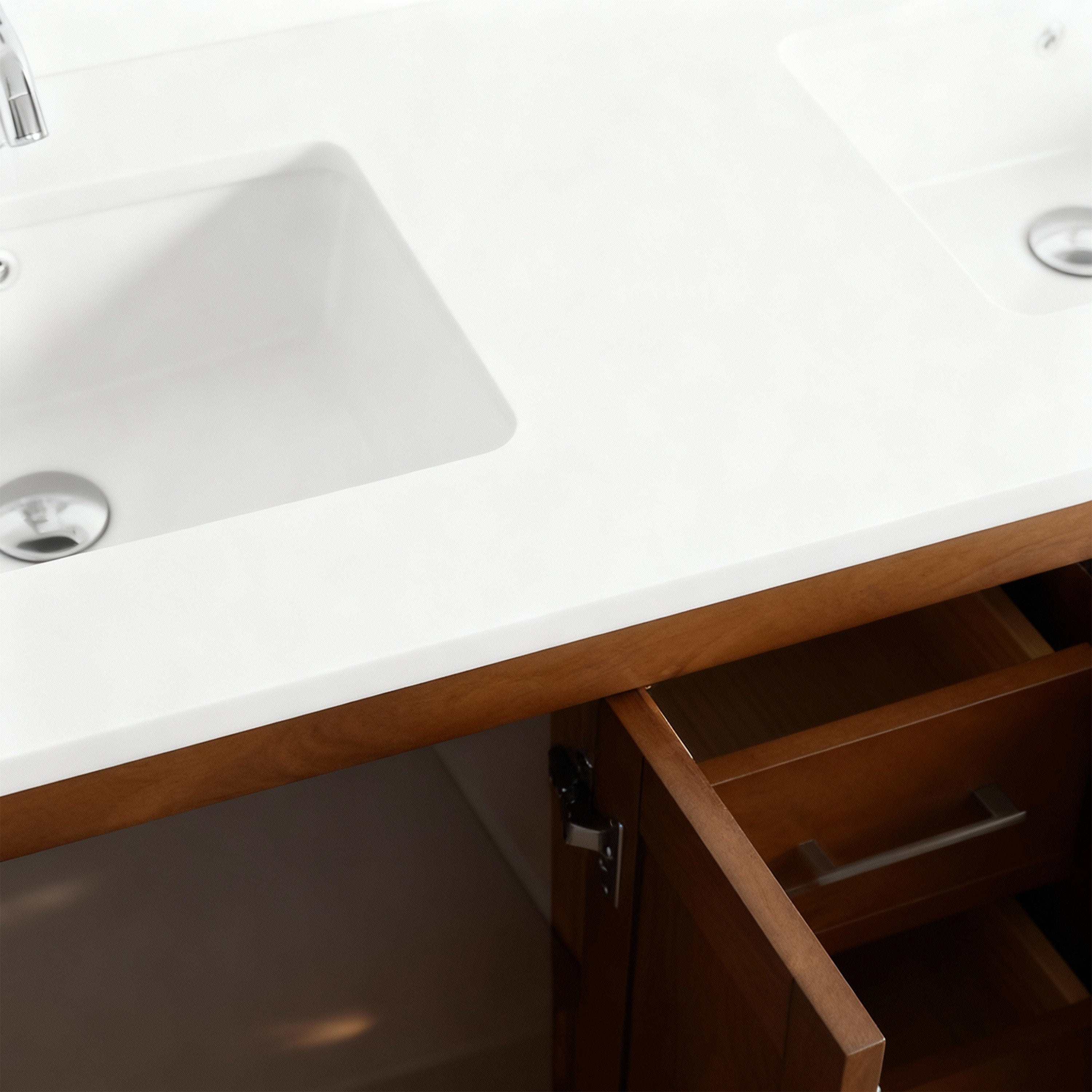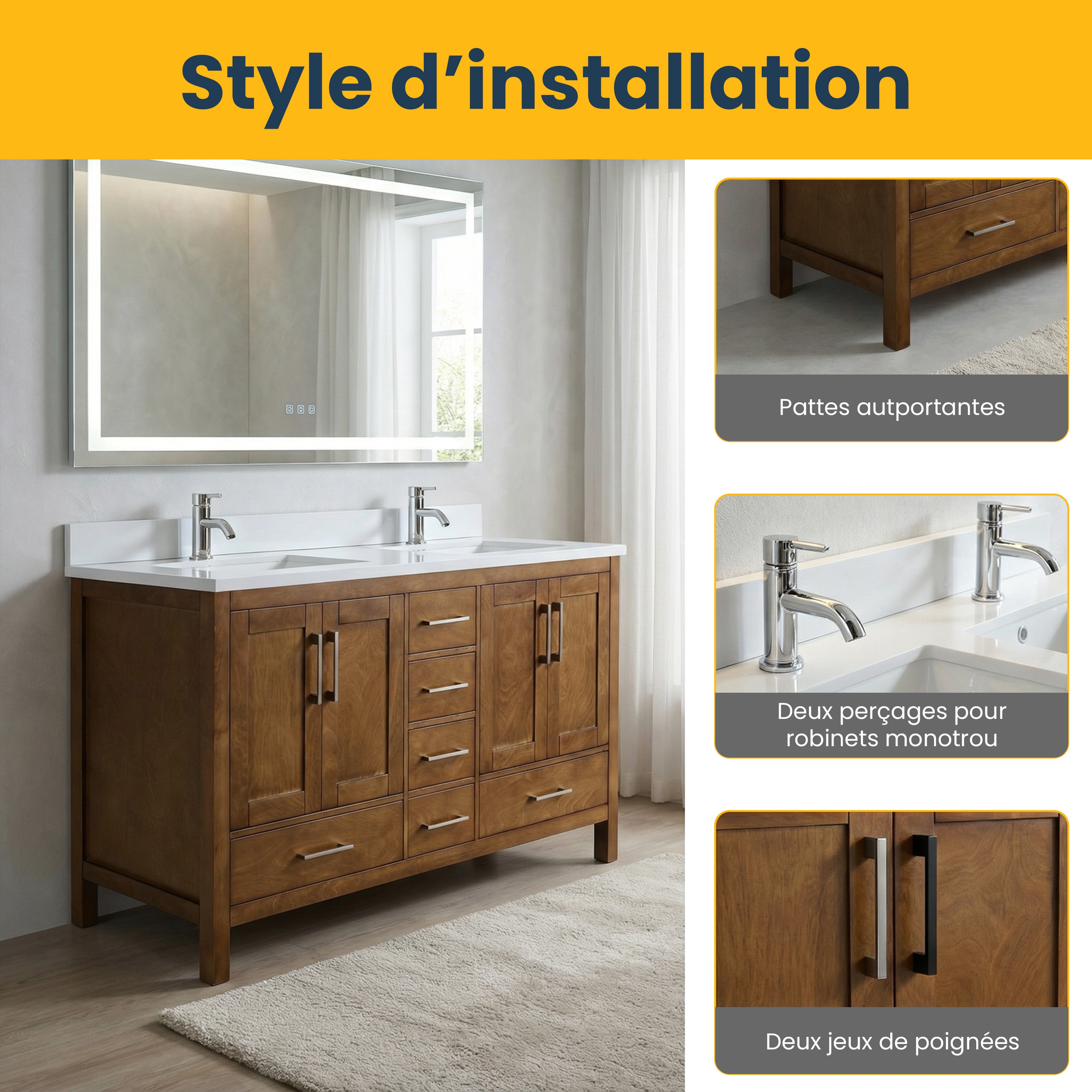 Meuble-lavabo double sur pied en noyer de 60 po avec comptoir en marbre blanc reconstitué