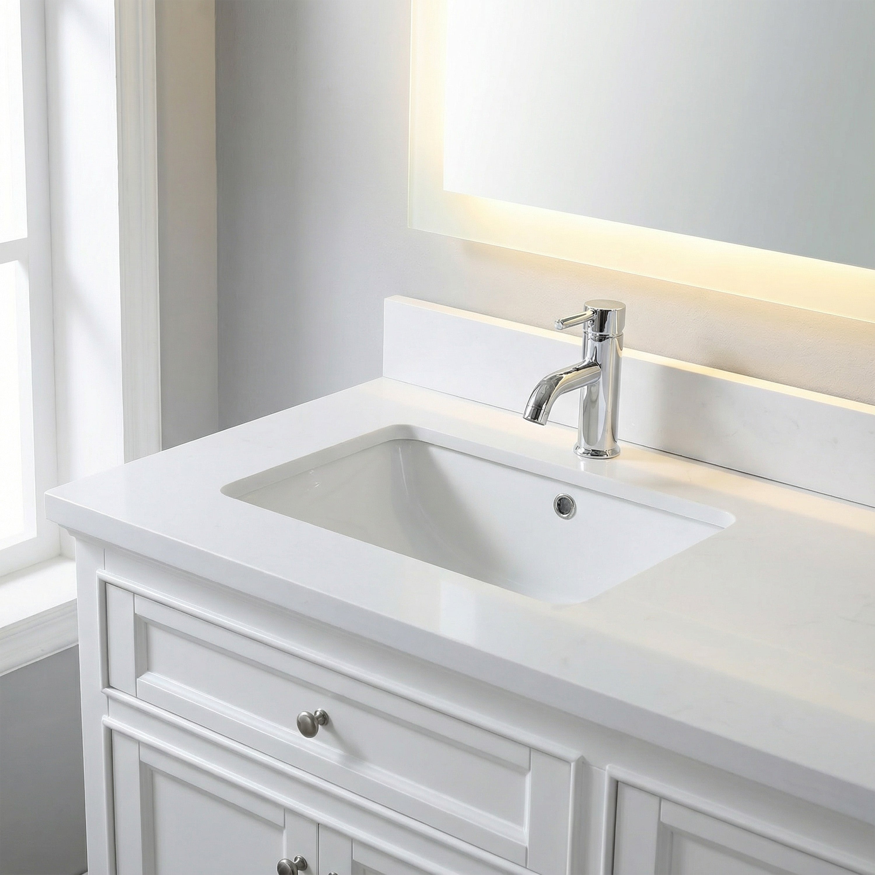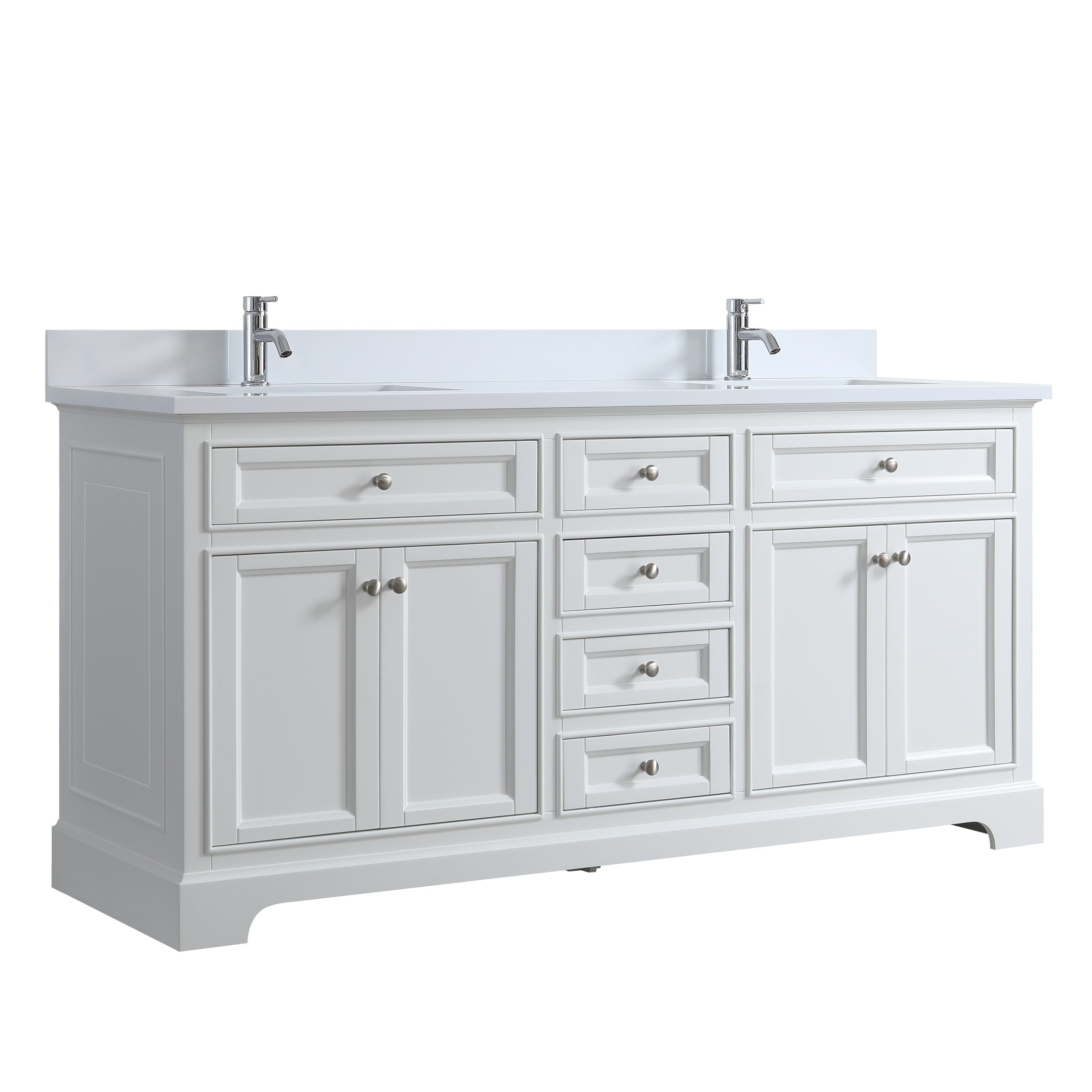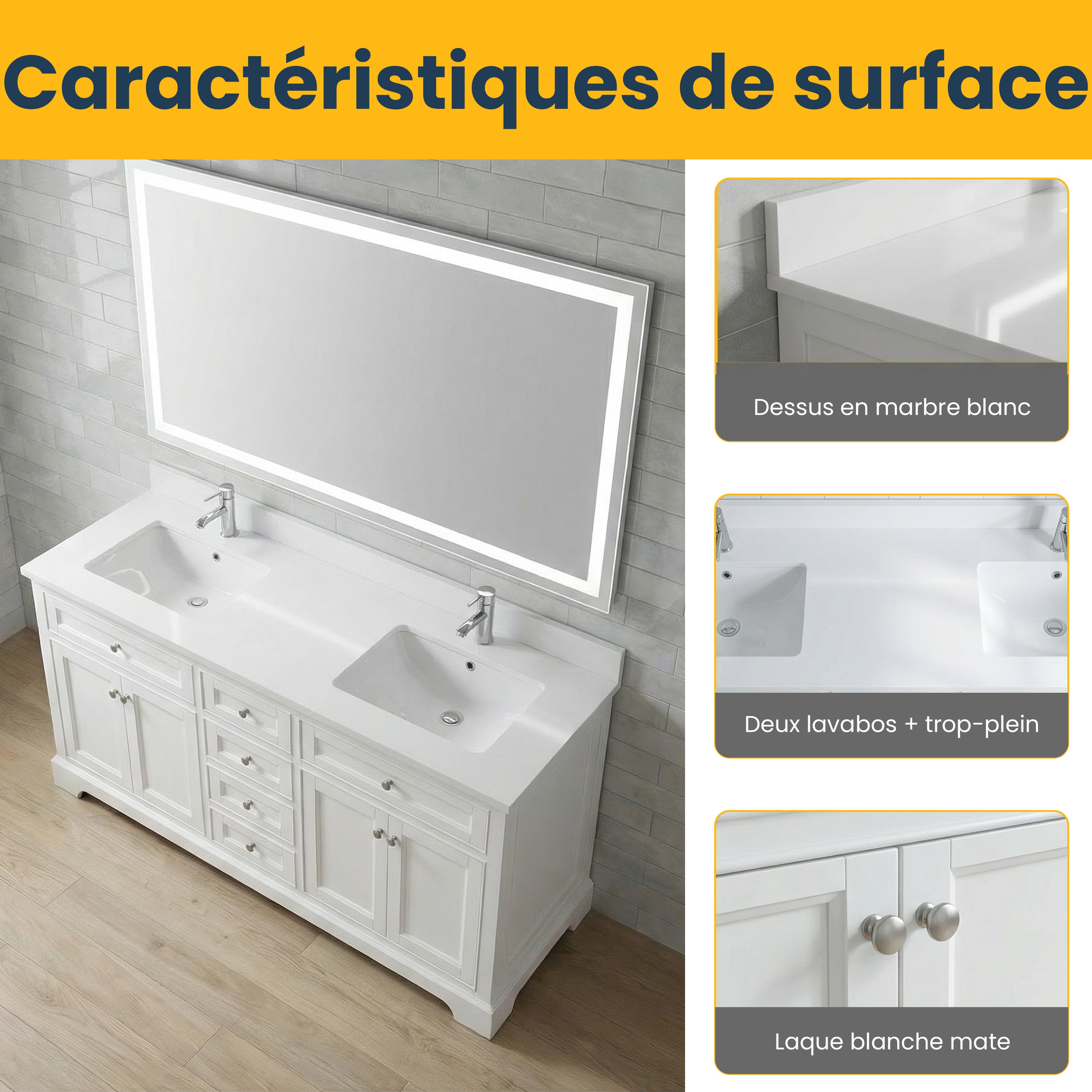 Meuble-lavabo autoportant blanc de 72 po avec comptoir en marbre blanc reconstitué