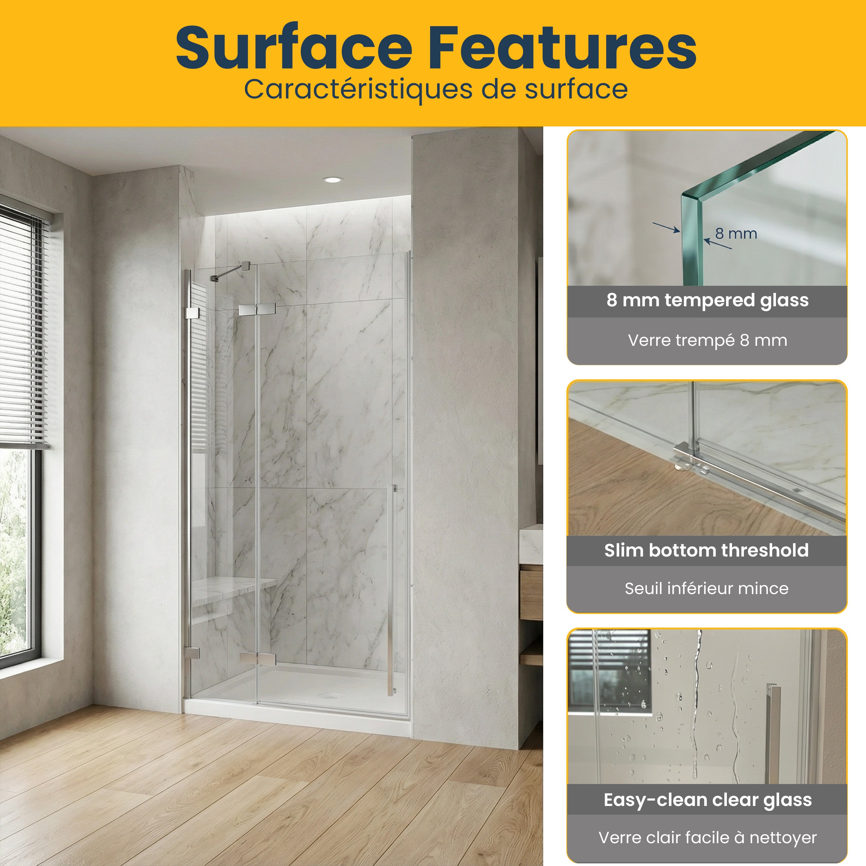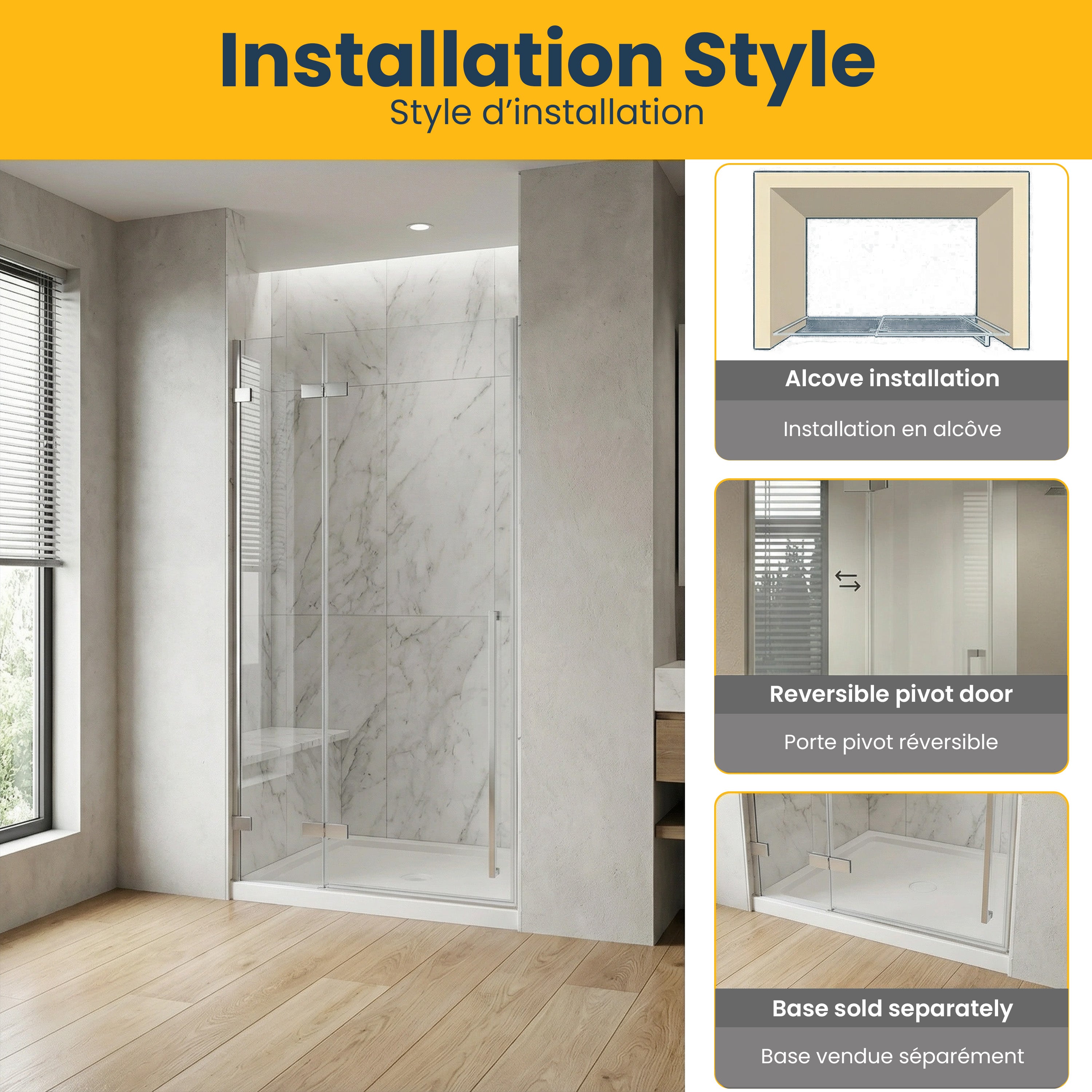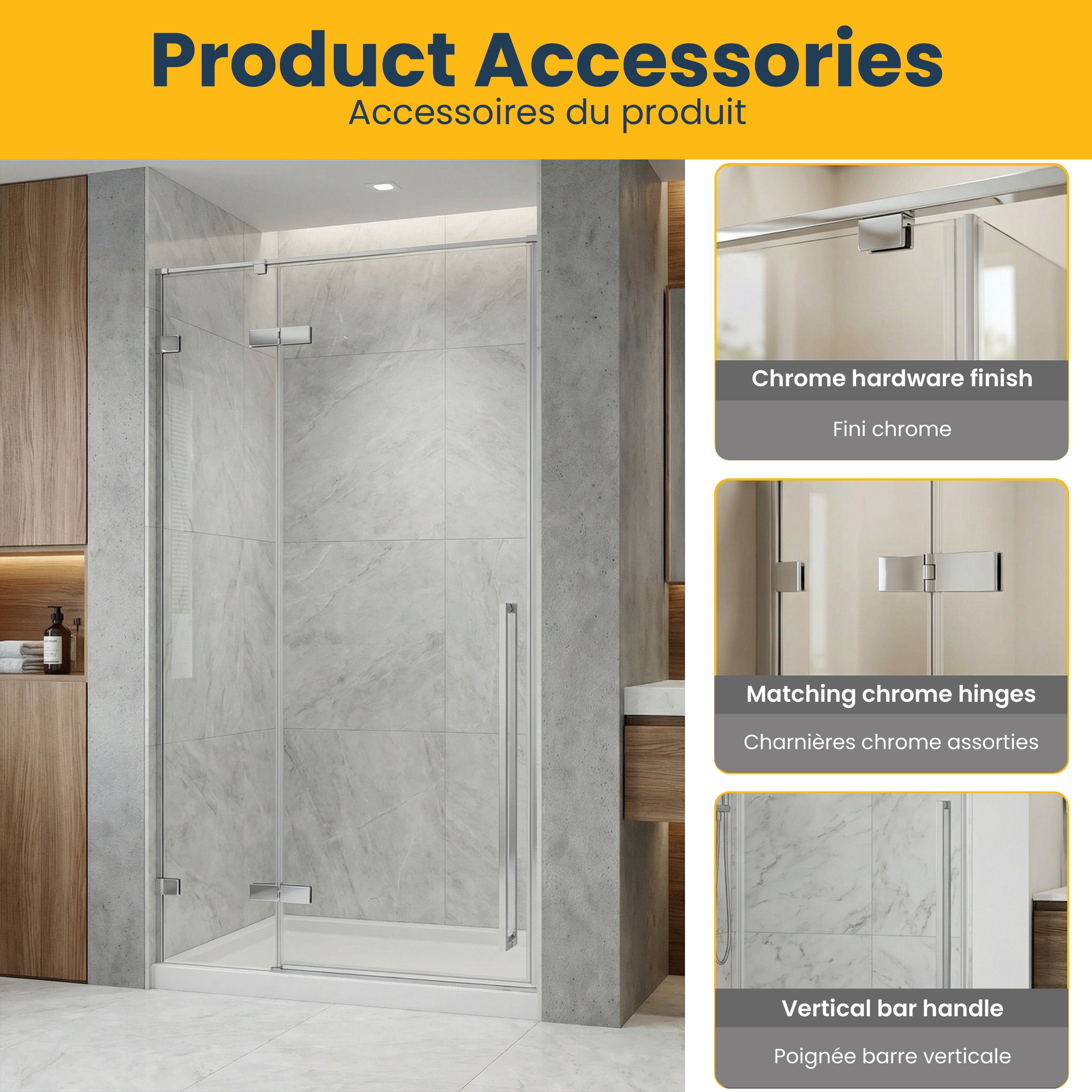 48 po x79 po Panneau de Porte de Douche Fixe/Pivotante Chrome Réversible avec Verre Clair sans base