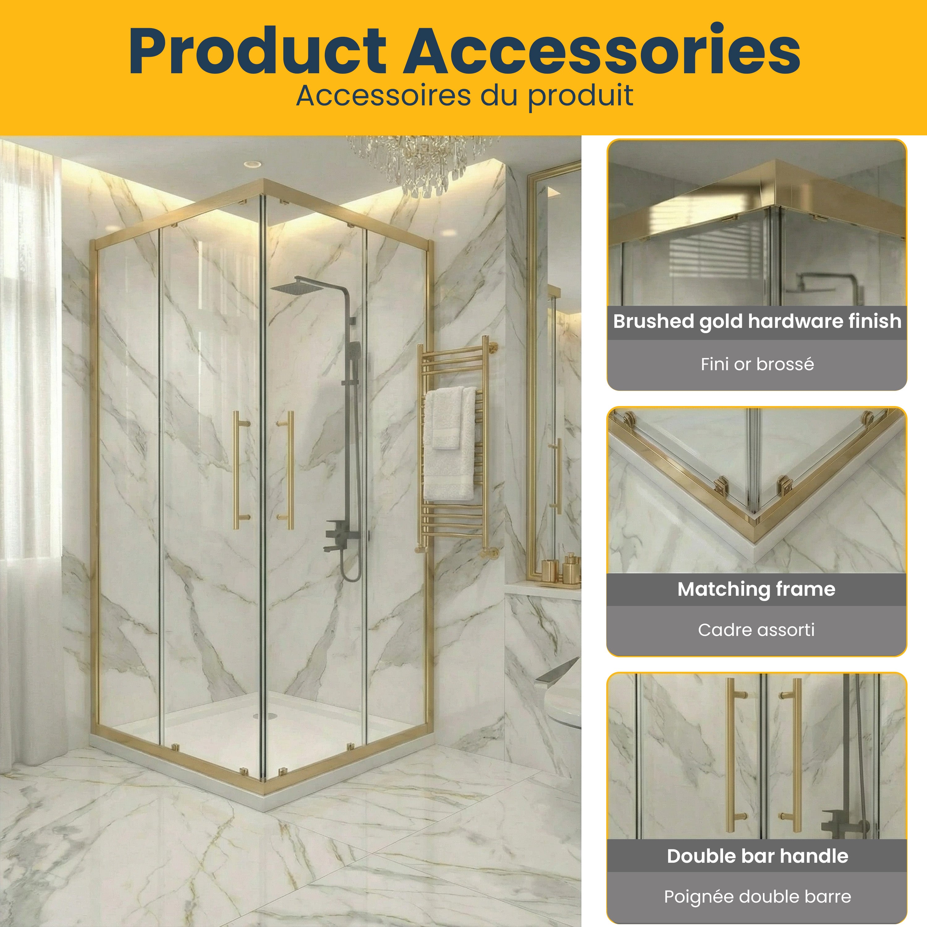 Transformez votre salle de bain avec la porte de douche d'angle coulissante réversible Byfield Collection 36 po x 36 po x 79 po, finition or brossé et verre clair. Conçue pour un mode de vie moderne, cette porte allie élégance et fonctionnalité.