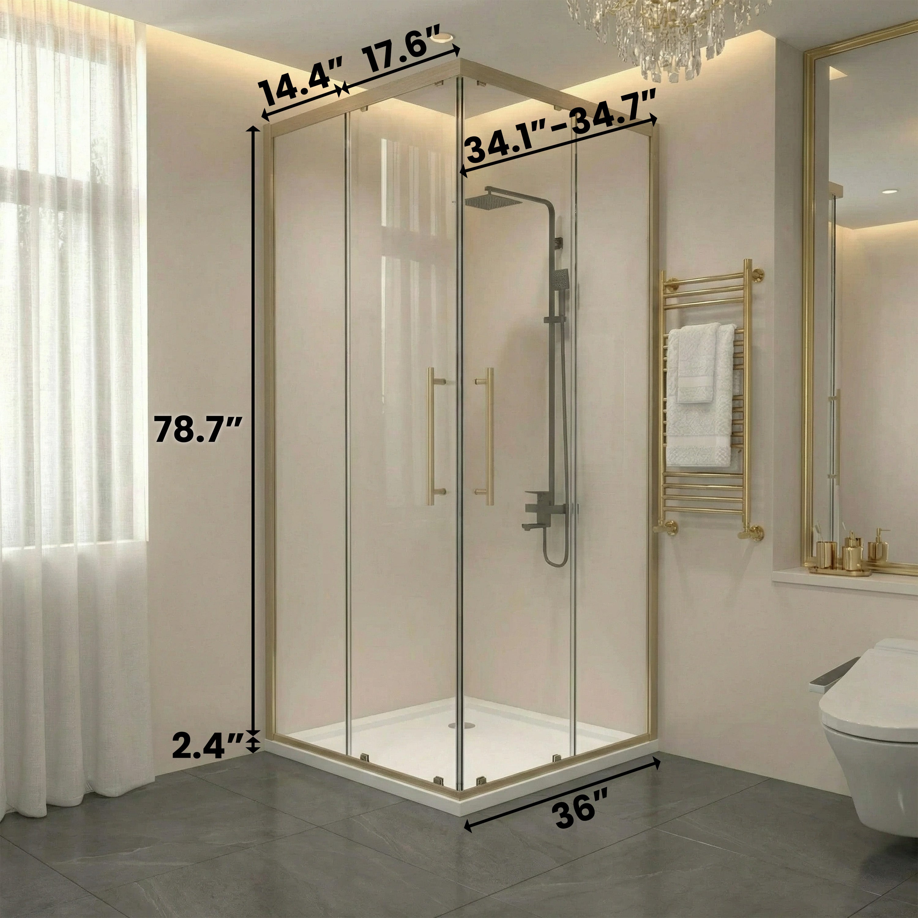 36 po x 36 po x 79 po Porte de Douche Or Brossé coulissant au coin Réversible avec Verre Clair et 36 po x 36 po Base de Douche en Acrylique Blanc Brillant avec Drain au Coin