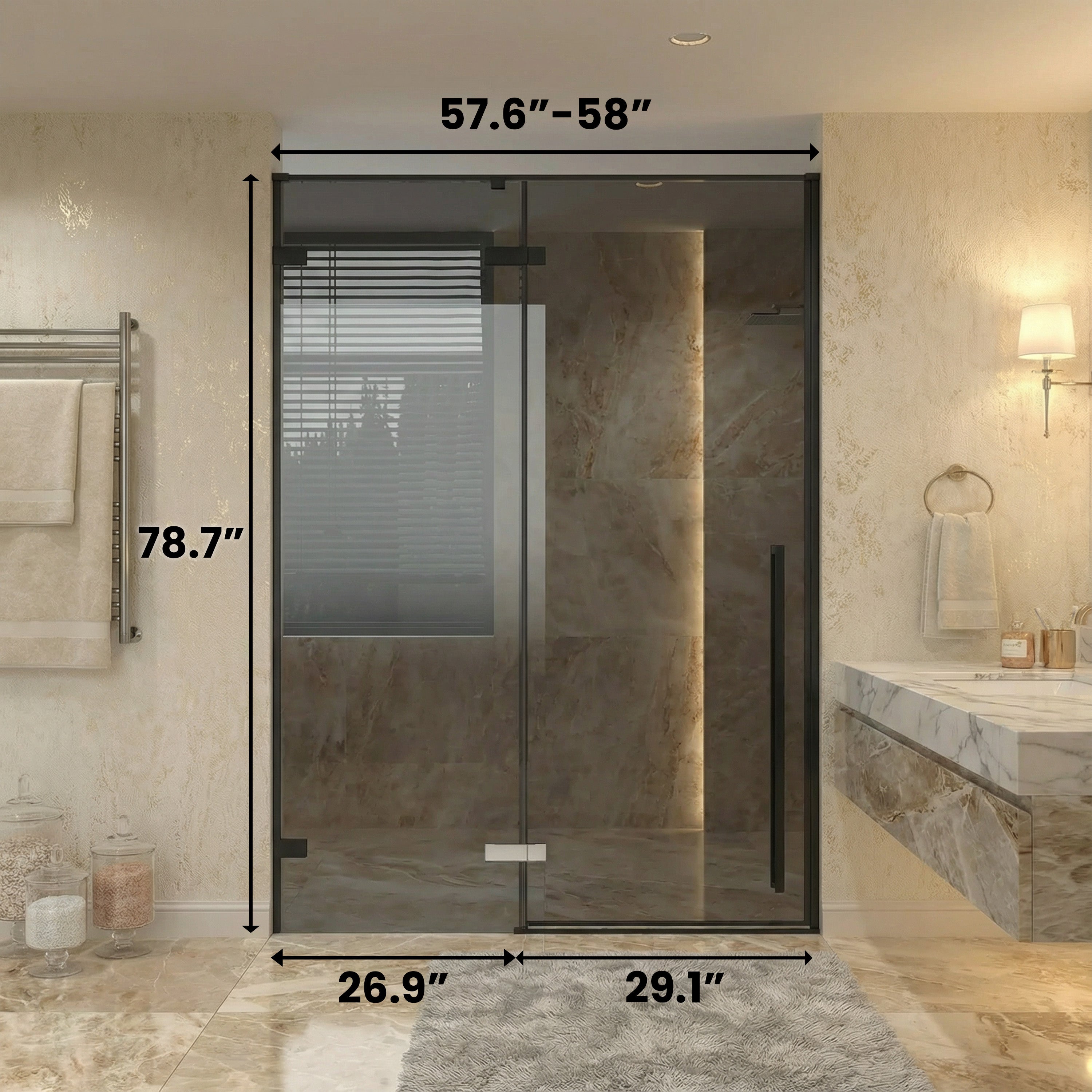 Apportez élégance et confort à votre quotidien avec la porte de douche pivotante fixe réversible Divine Collection de 60 po x 79 po. Son design minimaliste en verre noir mat et teinté noir ajoute une touche de luxe, tandis que son mécanisme pivotant fluide assure une utilisation facile et silencieuse.