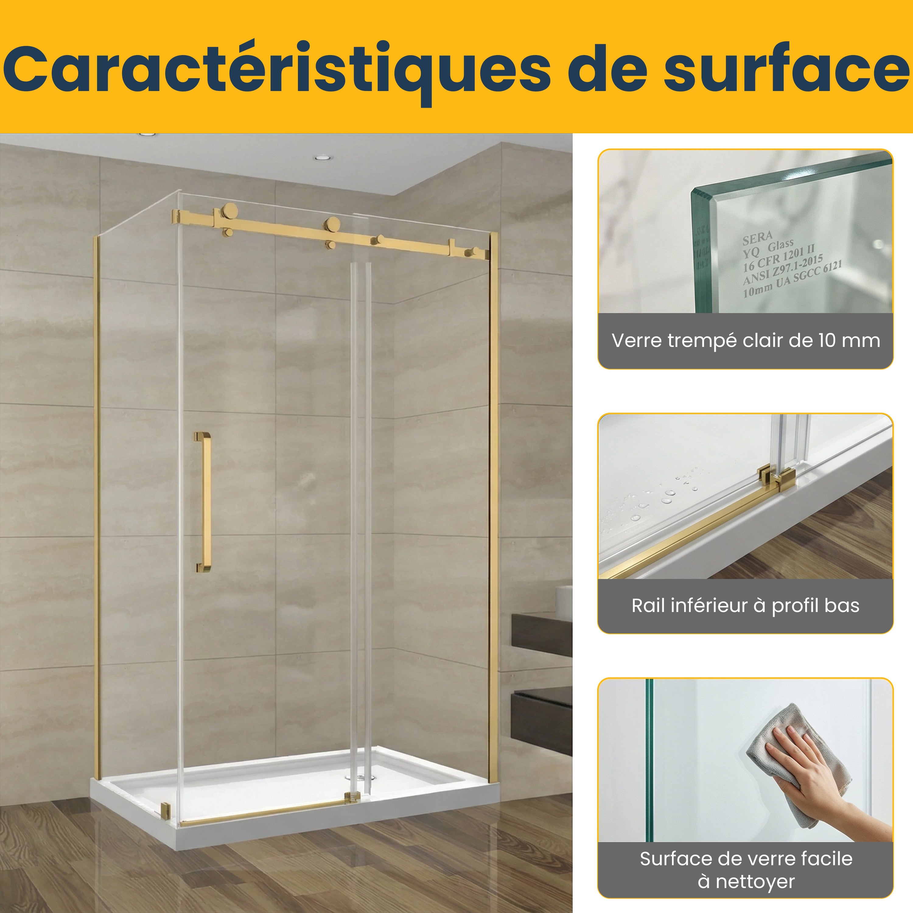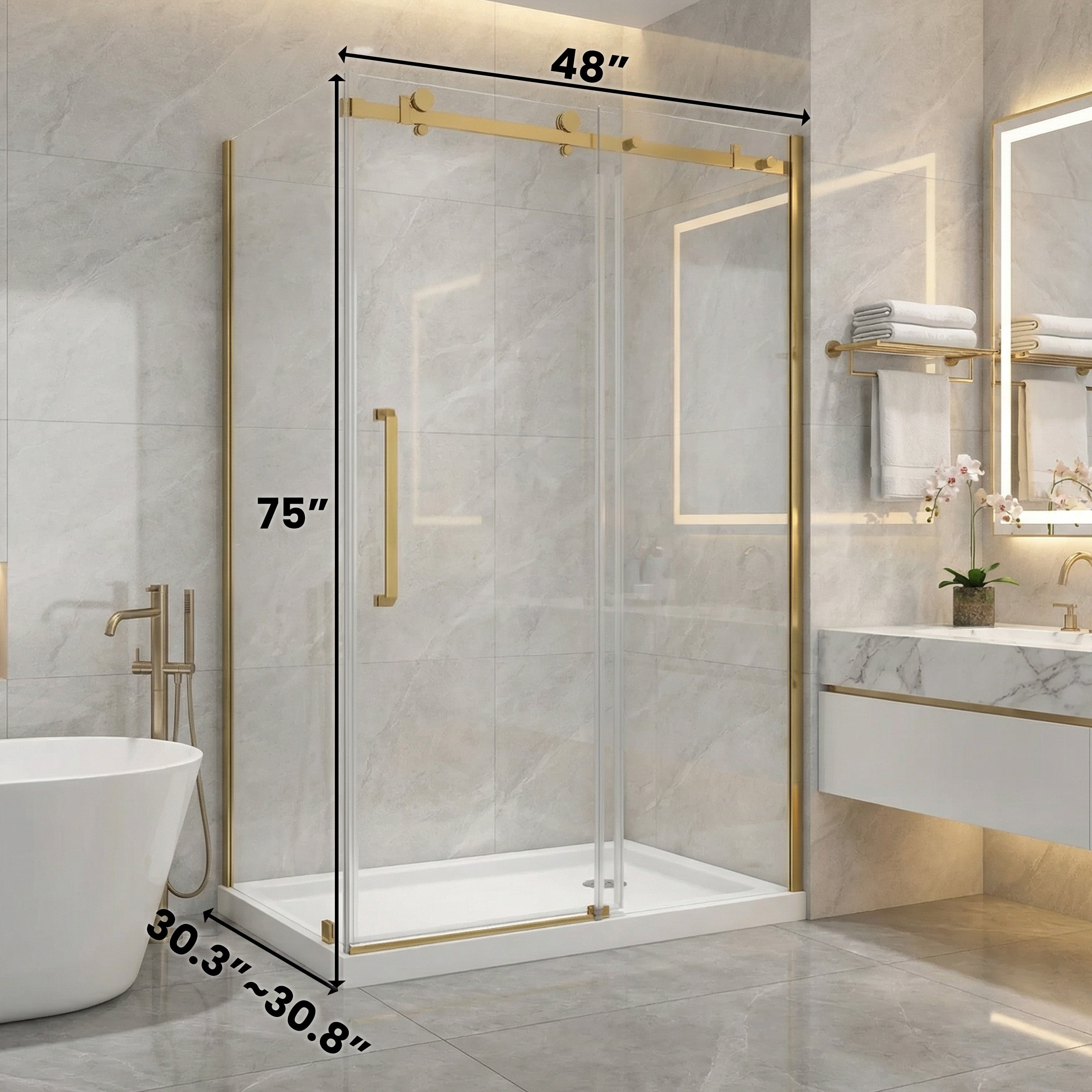 10 mm tempered glass sliding door, 5 years warranty. 48" x 32" x 75" without base. Designed for a 2-wall setup with square hardware.