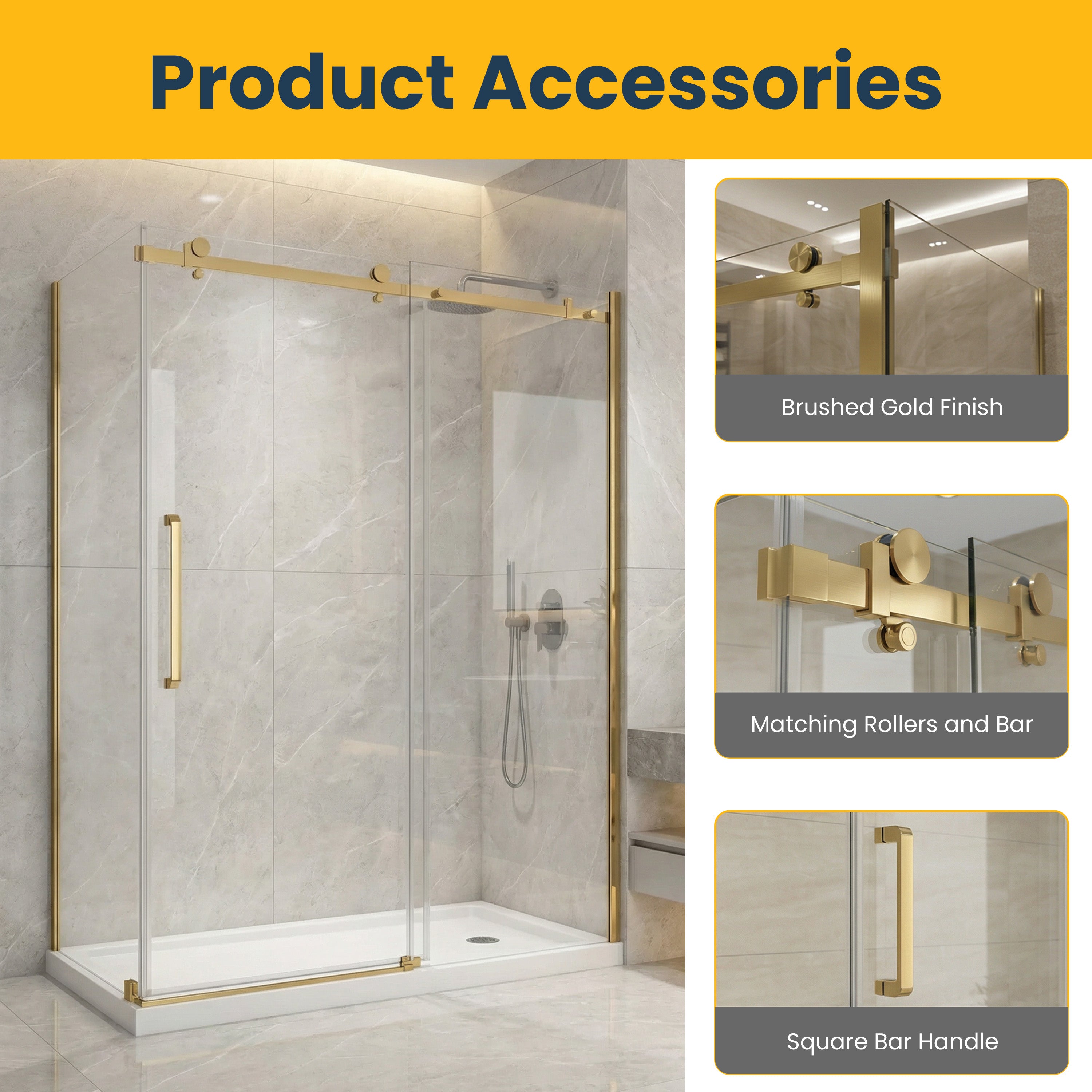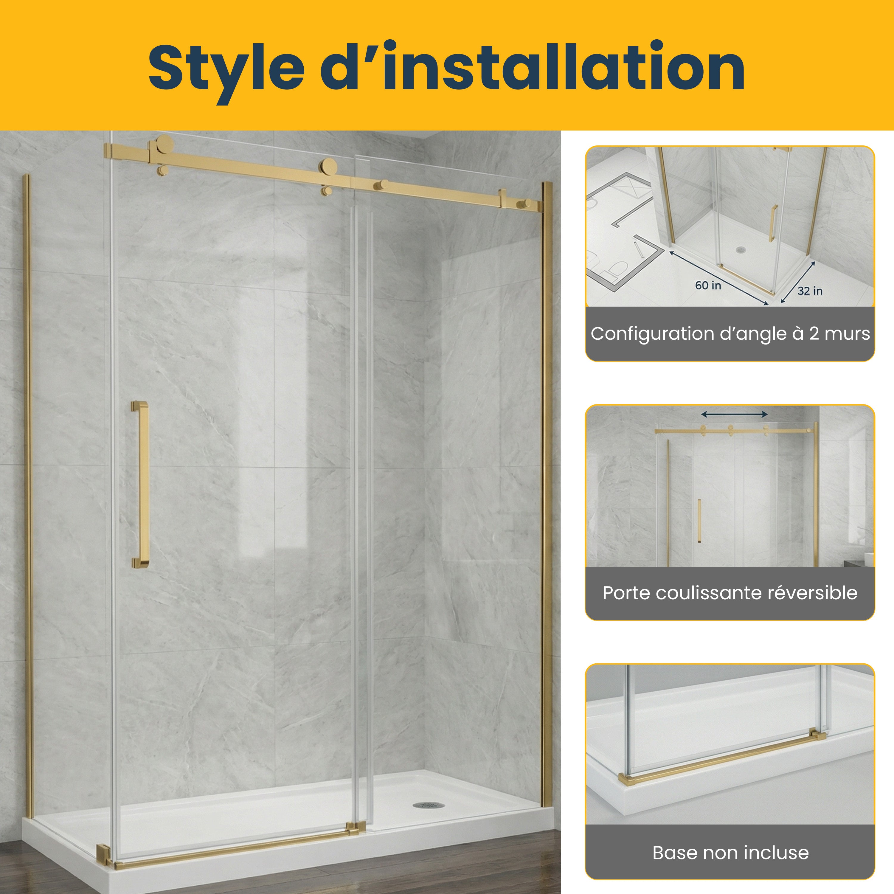 Porte coulissante en verre trempé de 10 mm , garantie 5 ans. Dimensions : 60 po x 32 po x 75 po (sans base) et forme carrée. Conçue pour une installation sur deux murs. Quincaillerie carrée or brossé.