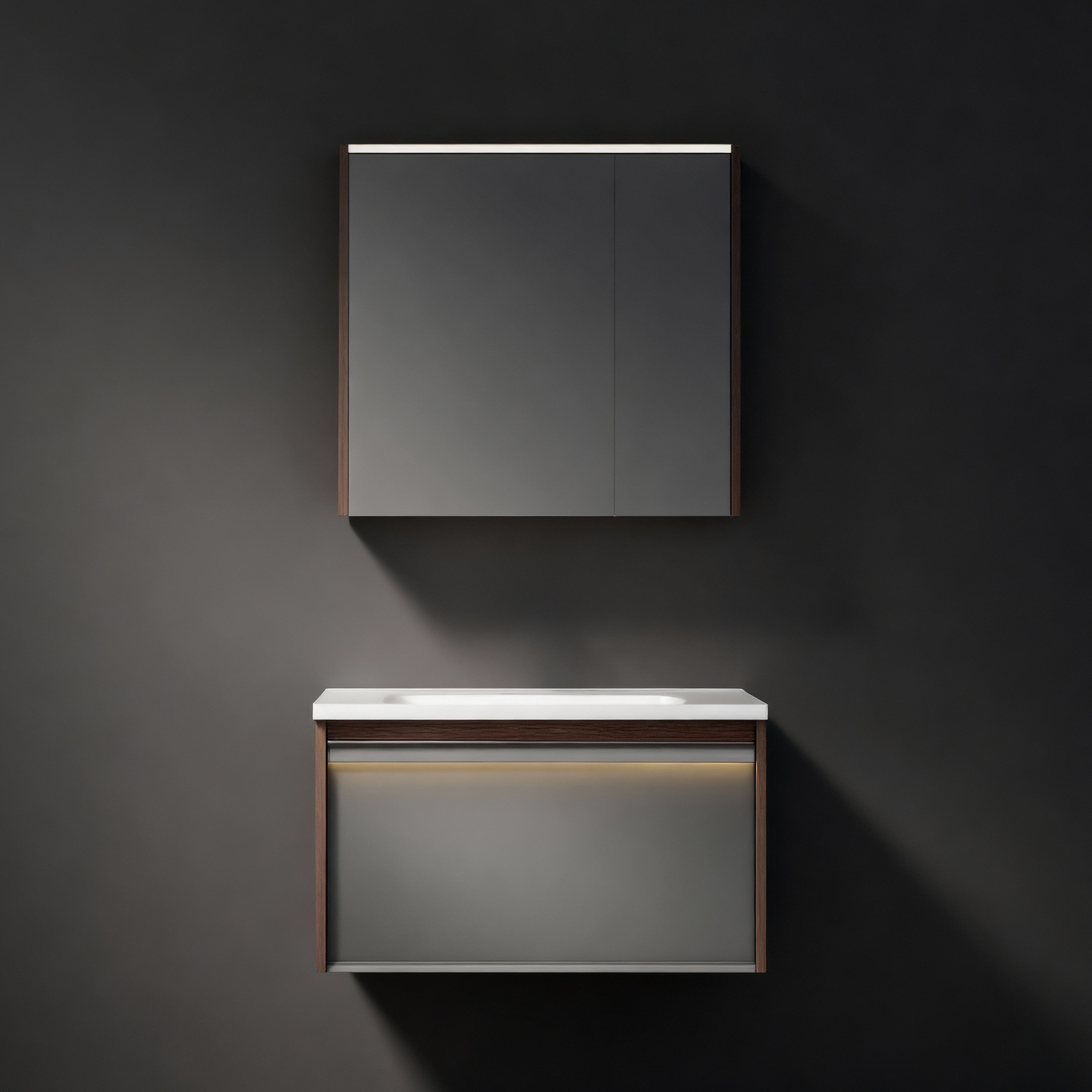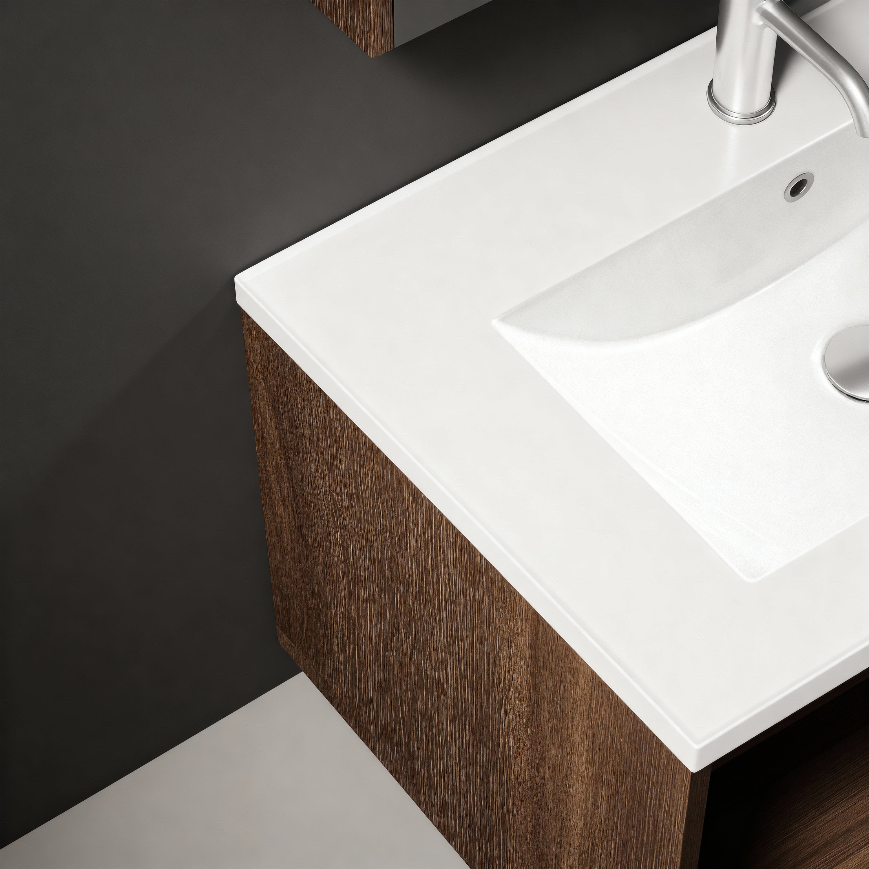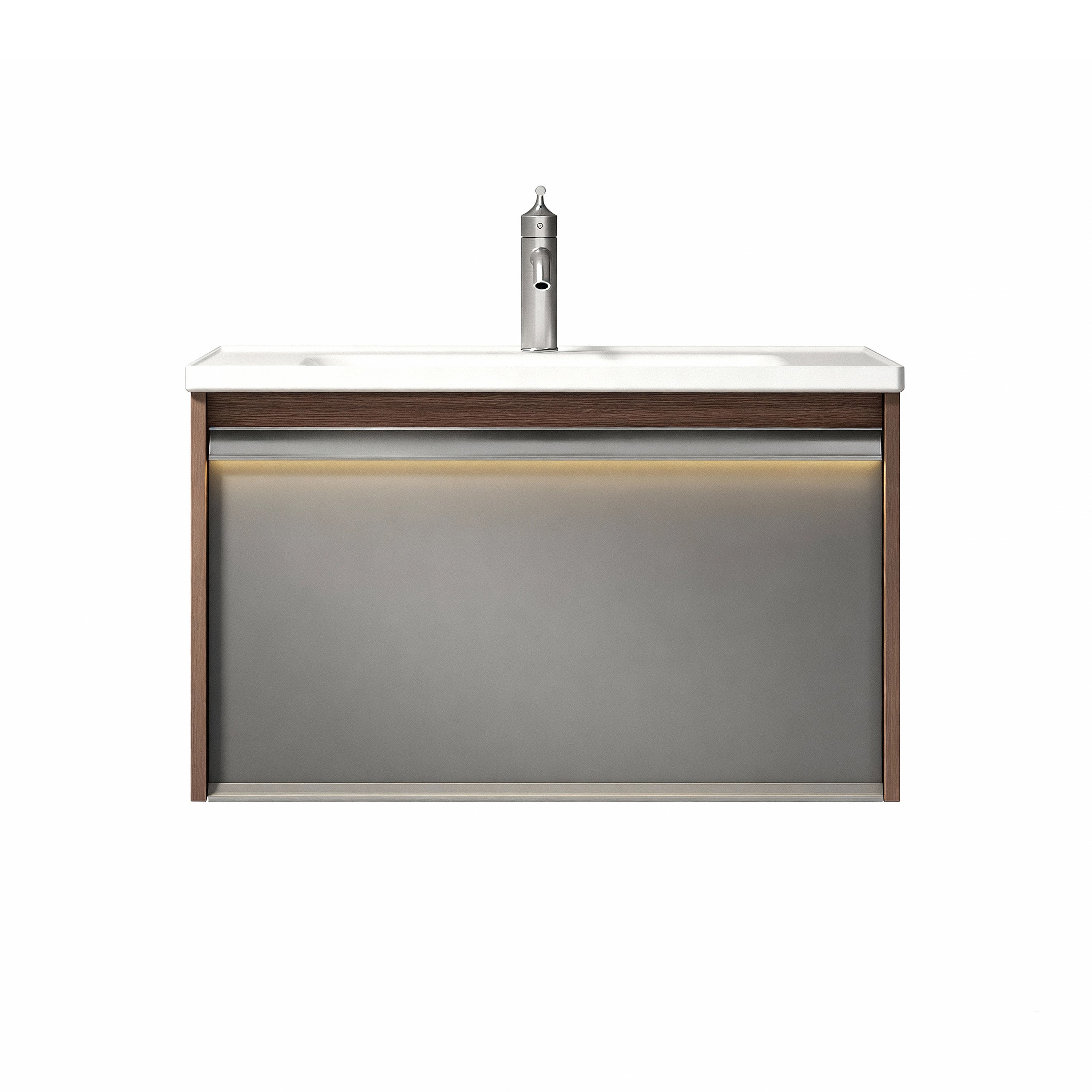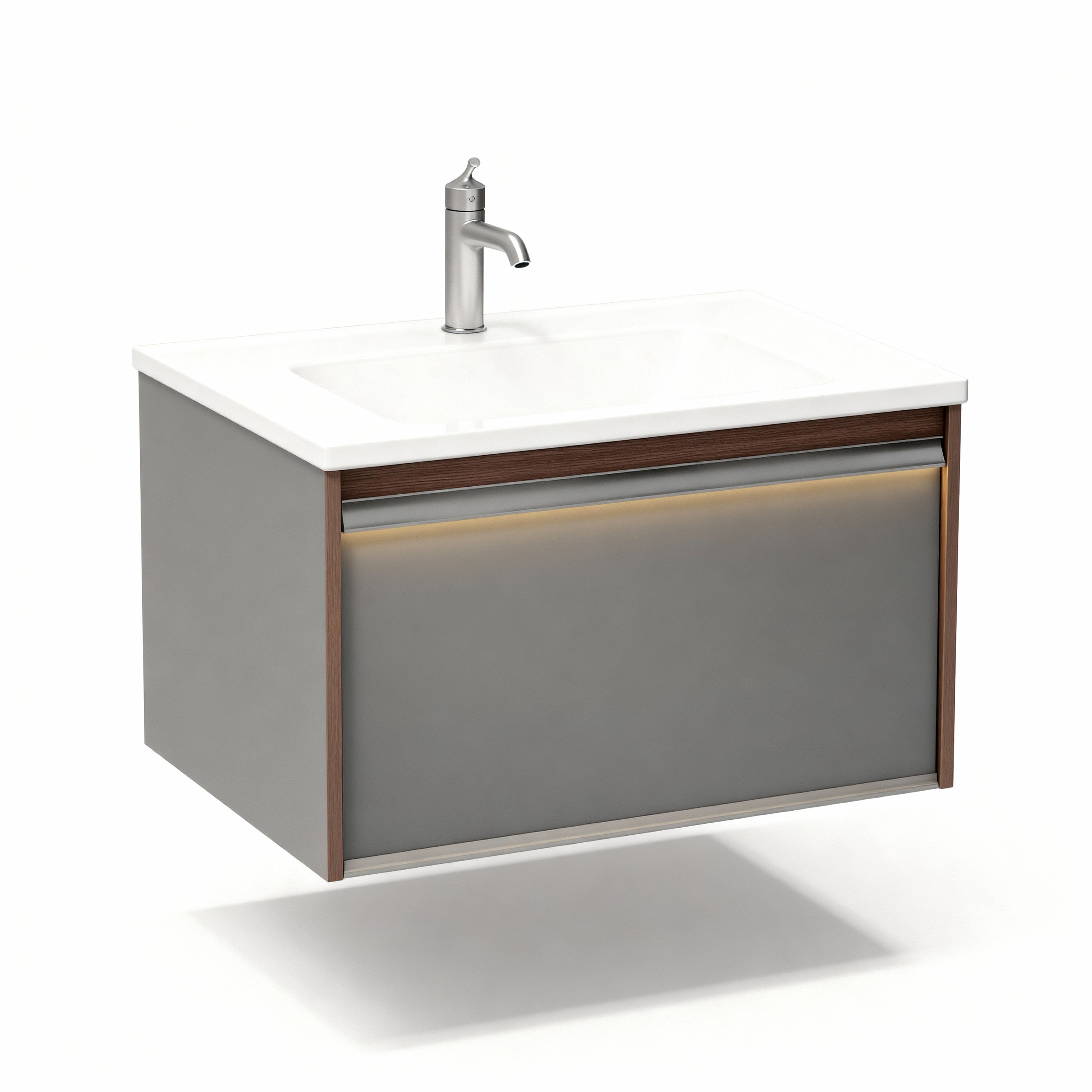 Sublimez votre salle de bain avec le minimalisme moderne et le design innovant de cette superbe vasque suspendue brun-gris, dotée de panneaux en mélamine et d'un comptoir intégré en céramique blanche.