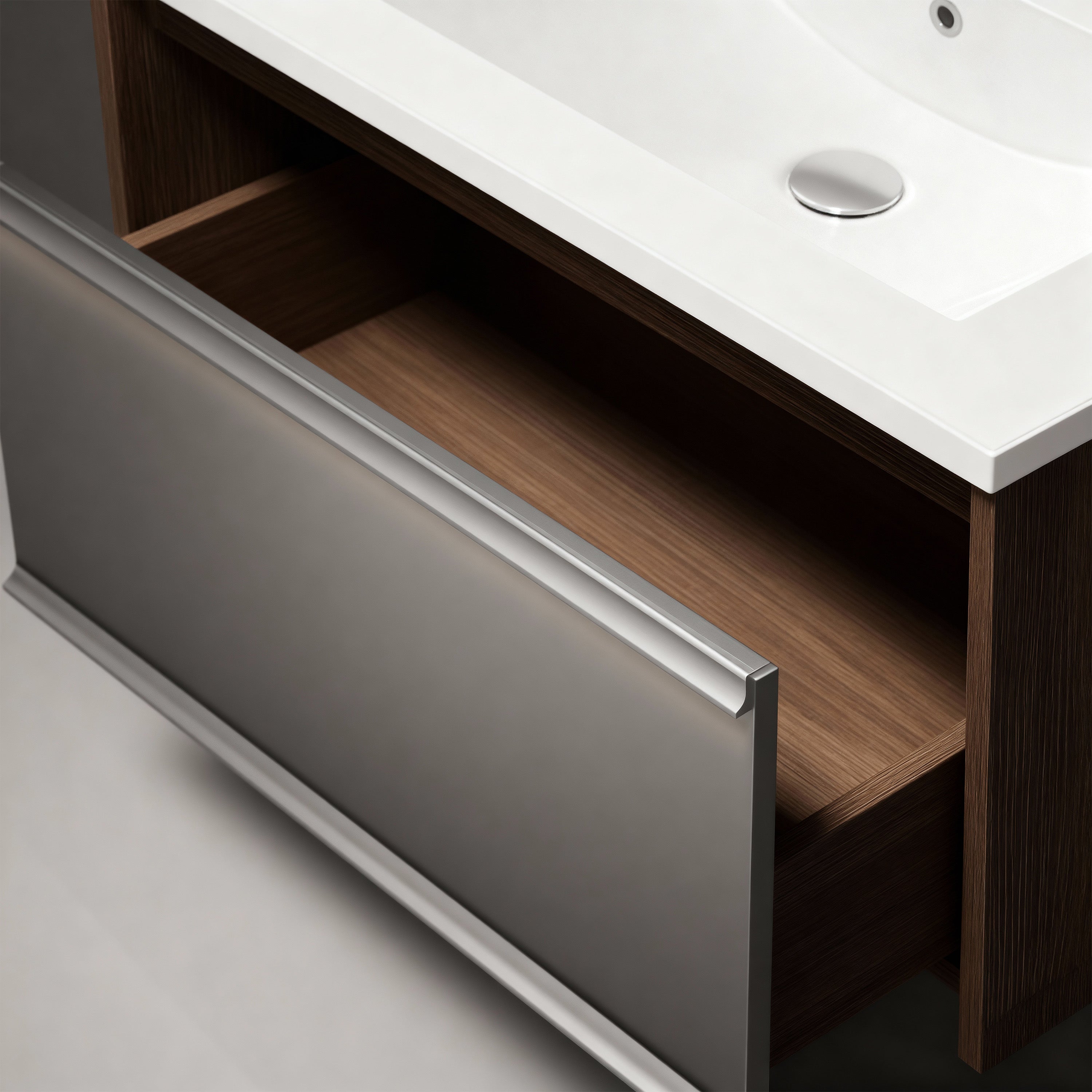 - Deux tiroirs à fermeture amortie, façades de tiroirs couleur gris fer et un tiroir avec éclairage LED à capteur (UL)
