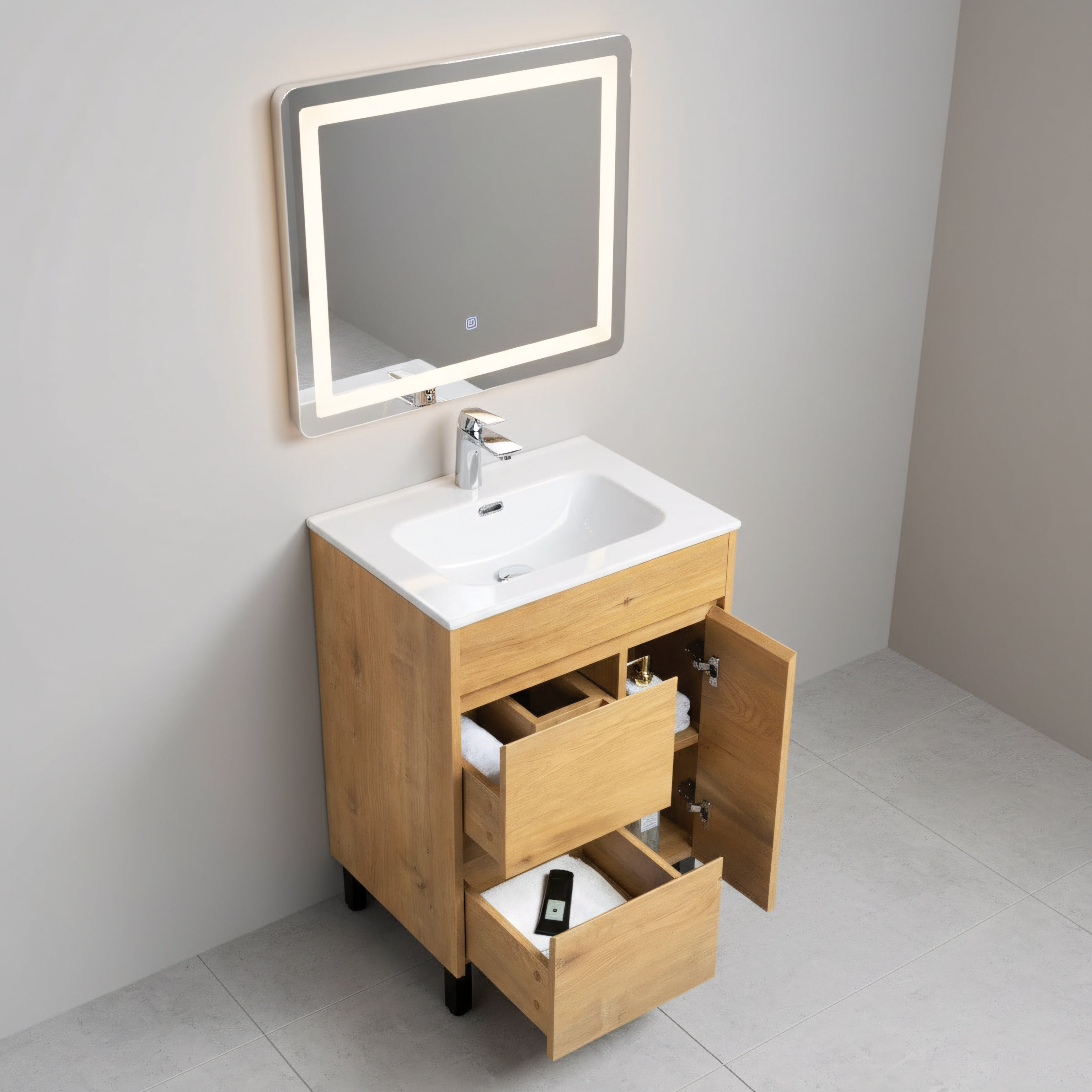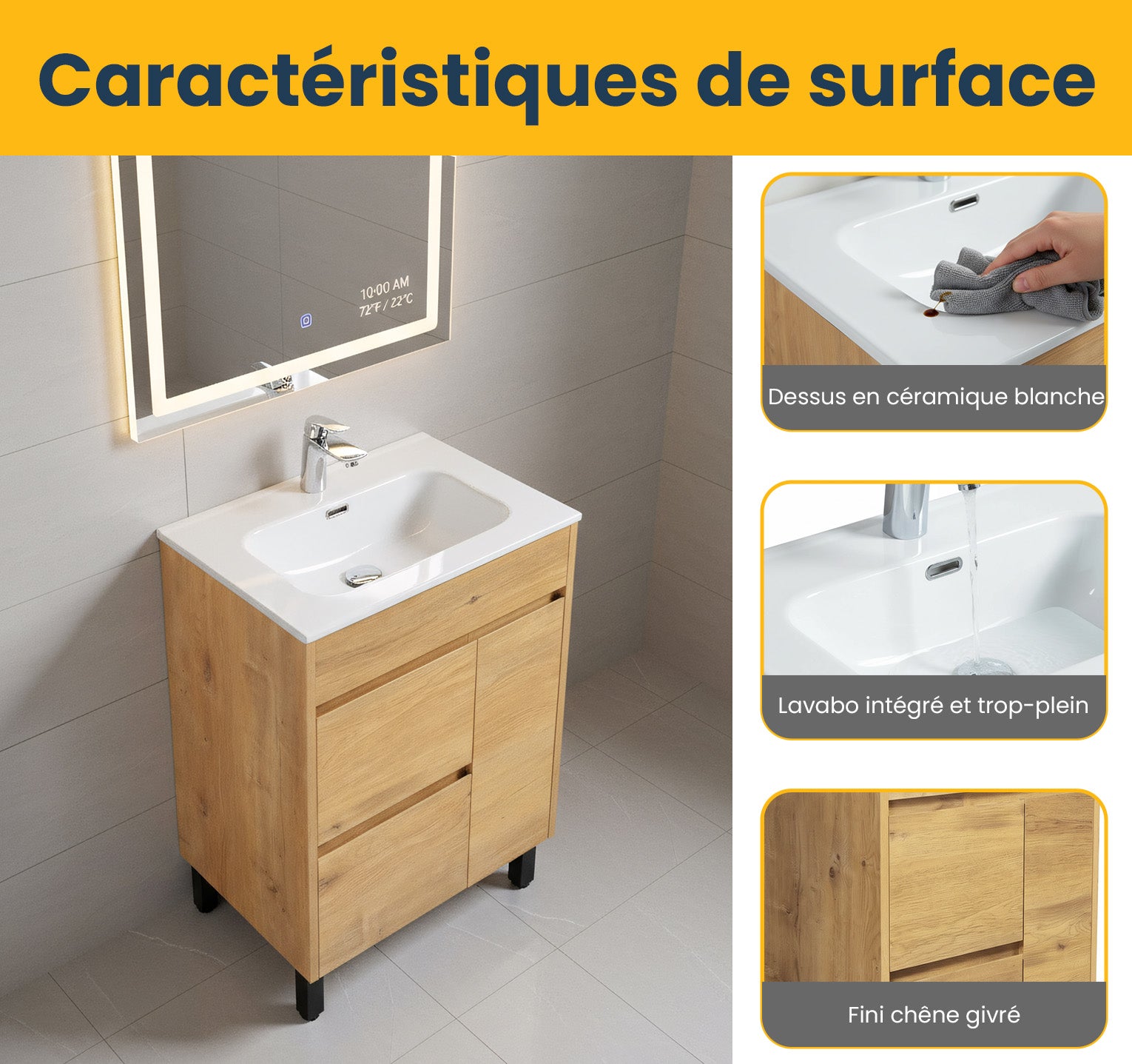Meuble-Lavabo Autoportant 24po Chêne Givré avec Comptoir de Céramique Blanc