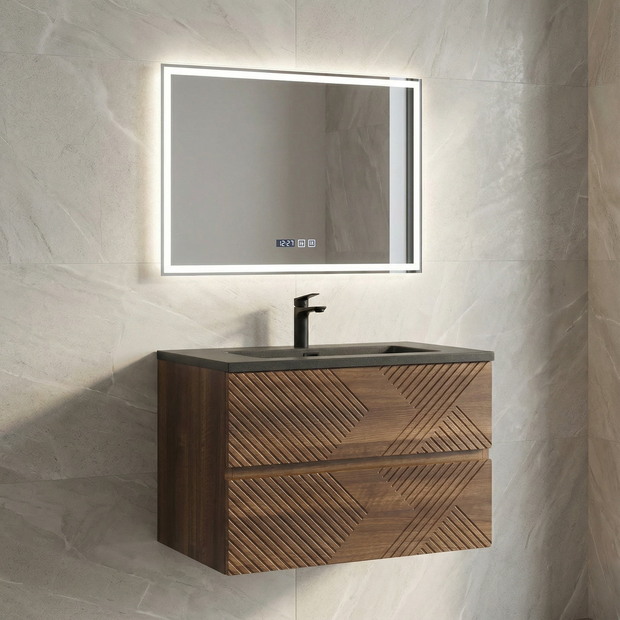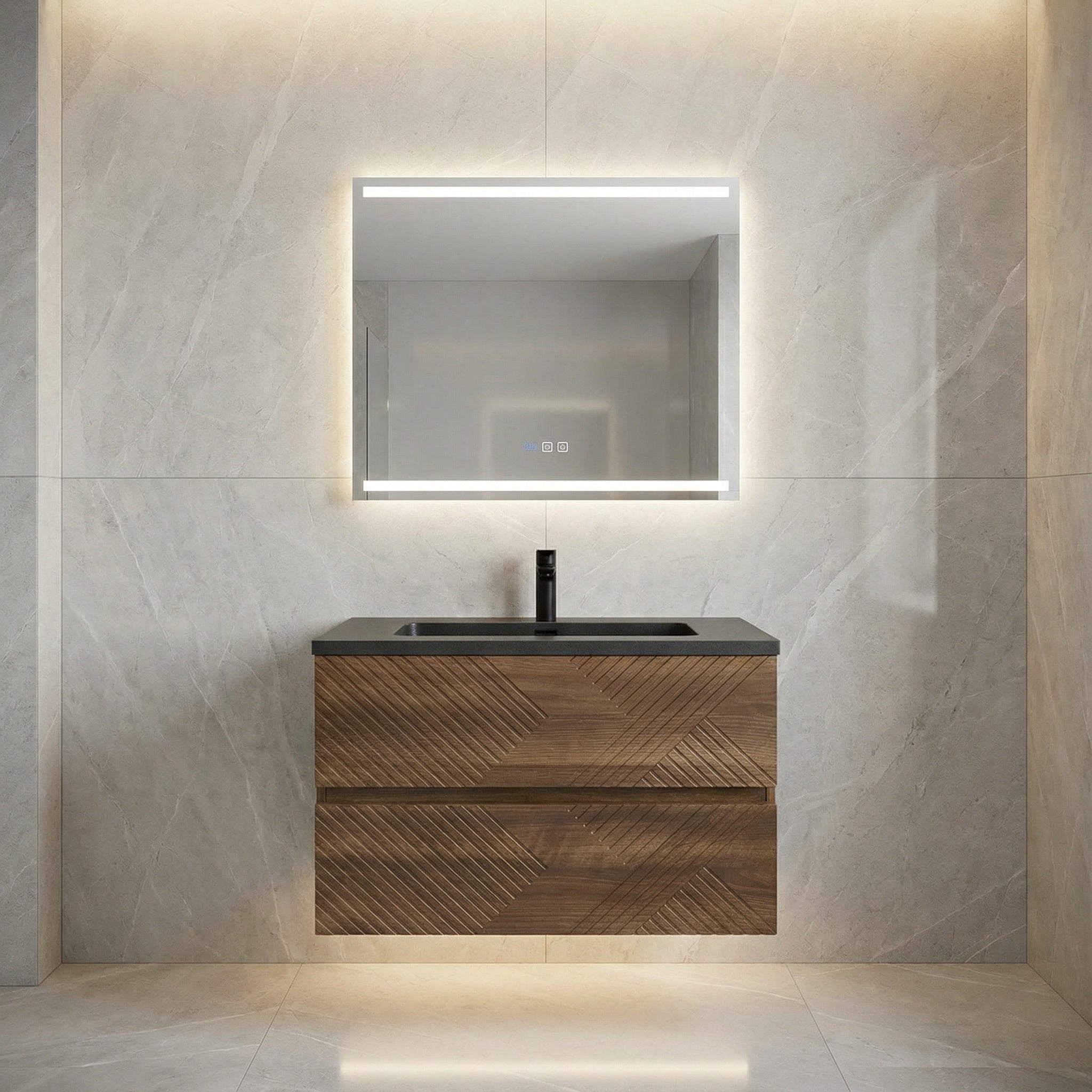 • Armoire finition noyer — texture chaleureuse du grain du bois avec noyau d'ingénierie résistant à l'humidité et façades en MDF pour des performances durables
