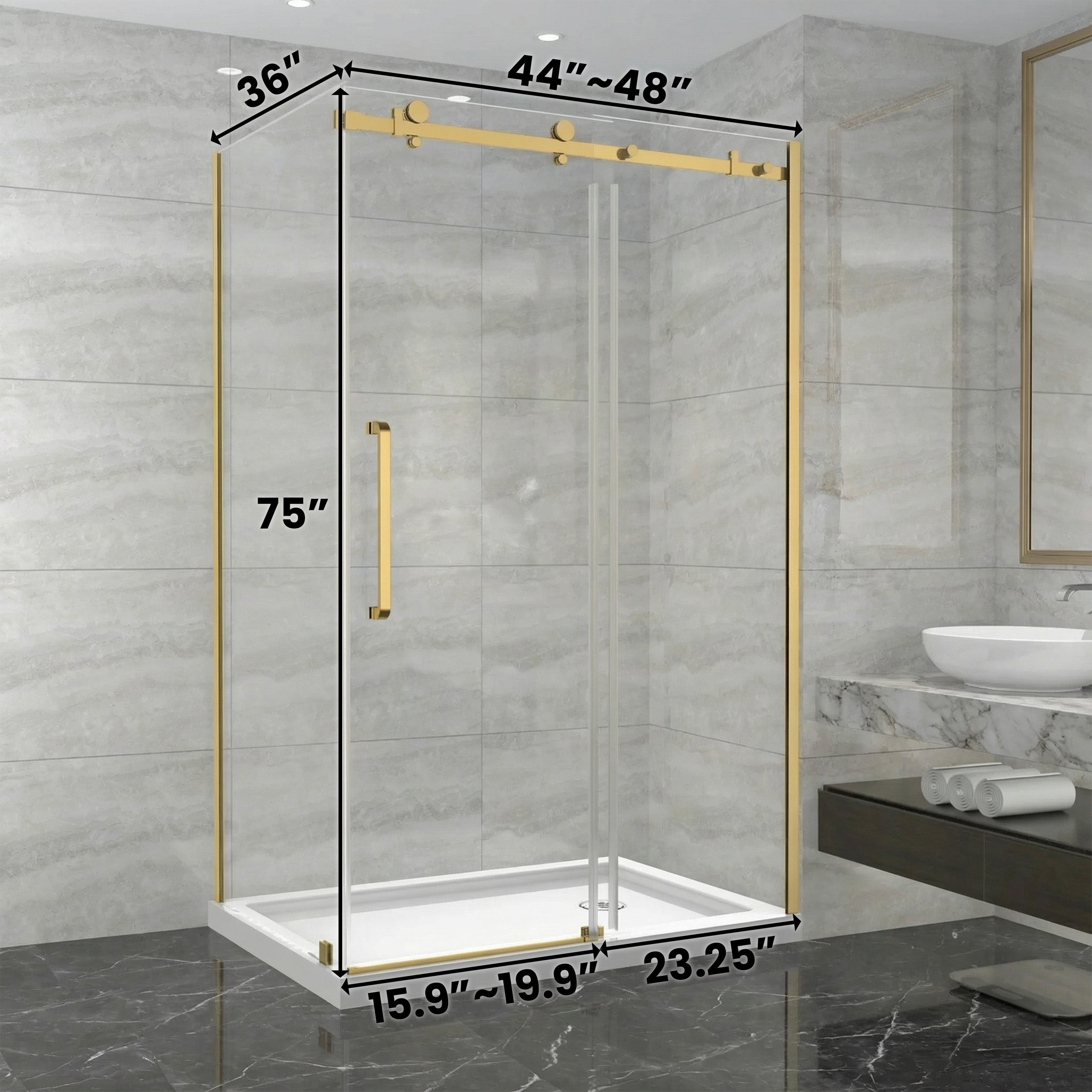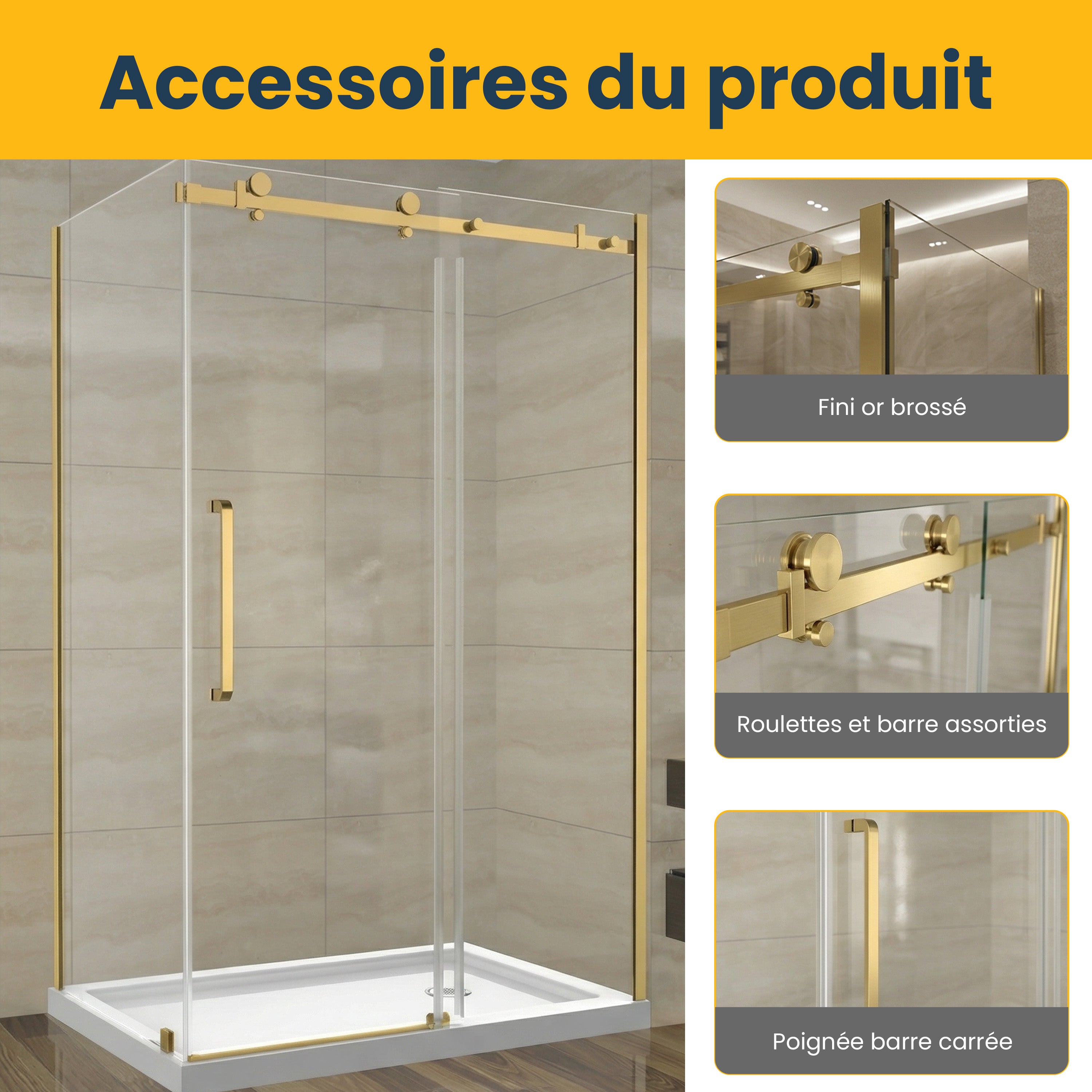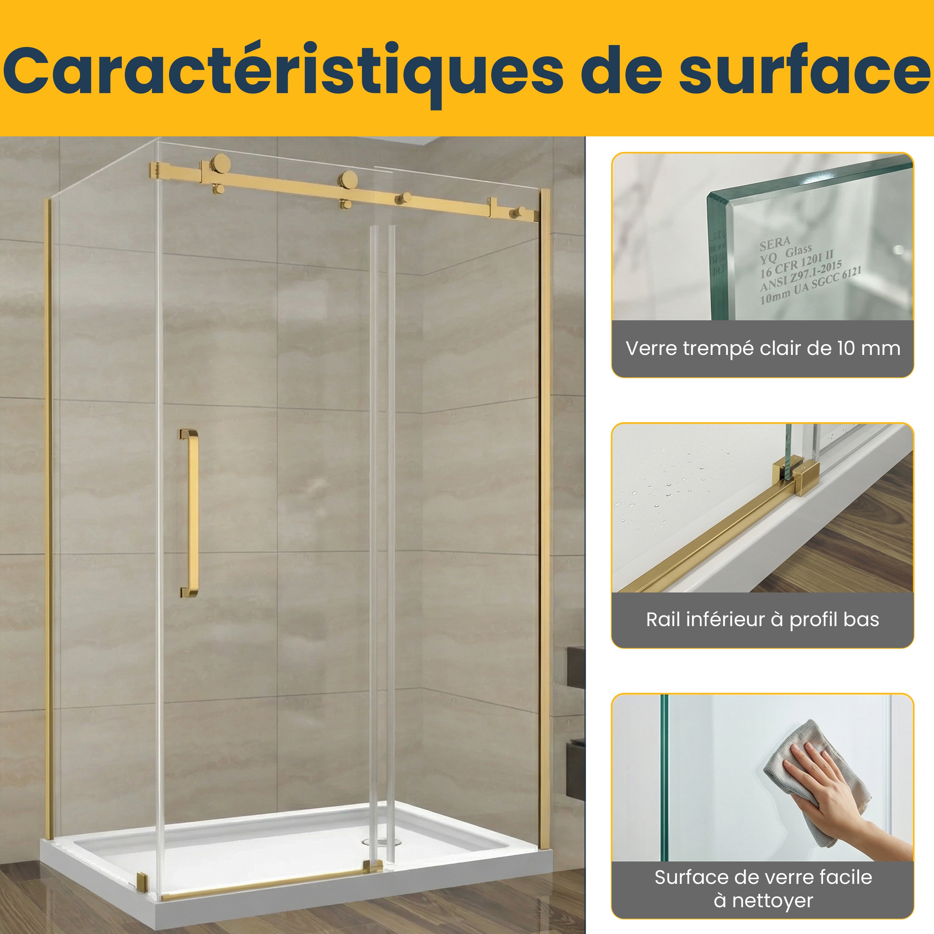 Porte coulissante en verre trempé de 10 mm, garantie 5 ans. 48"L x 36"P x 75"H sans base. Conçue pour une configuration à 2 murs avec quincaillerie carrée.