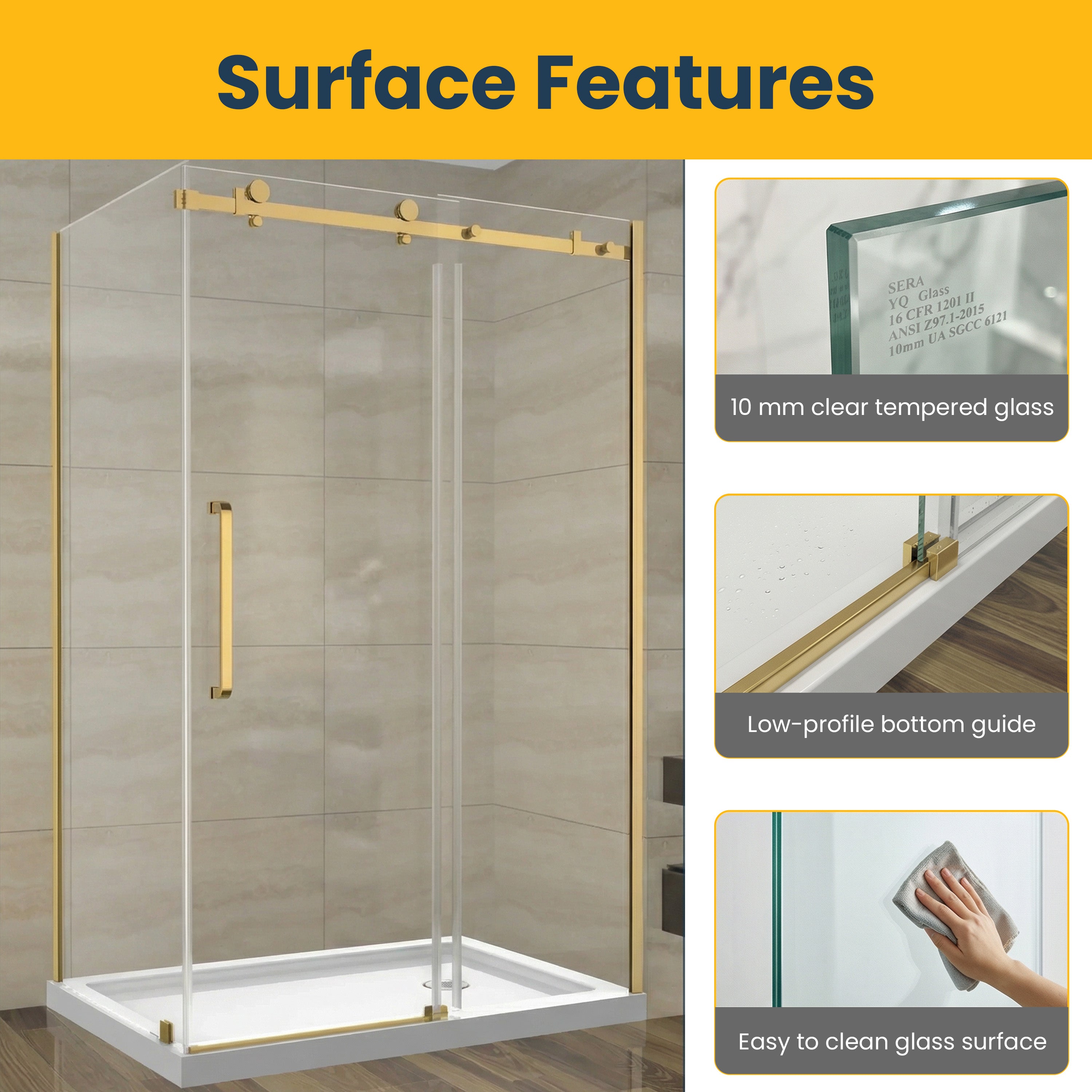 Porte de douche coulissante réversible 48" x 36" x 75" x 10mm avec design carré, quincaillerie en or brossé et panneau latéral 36"
