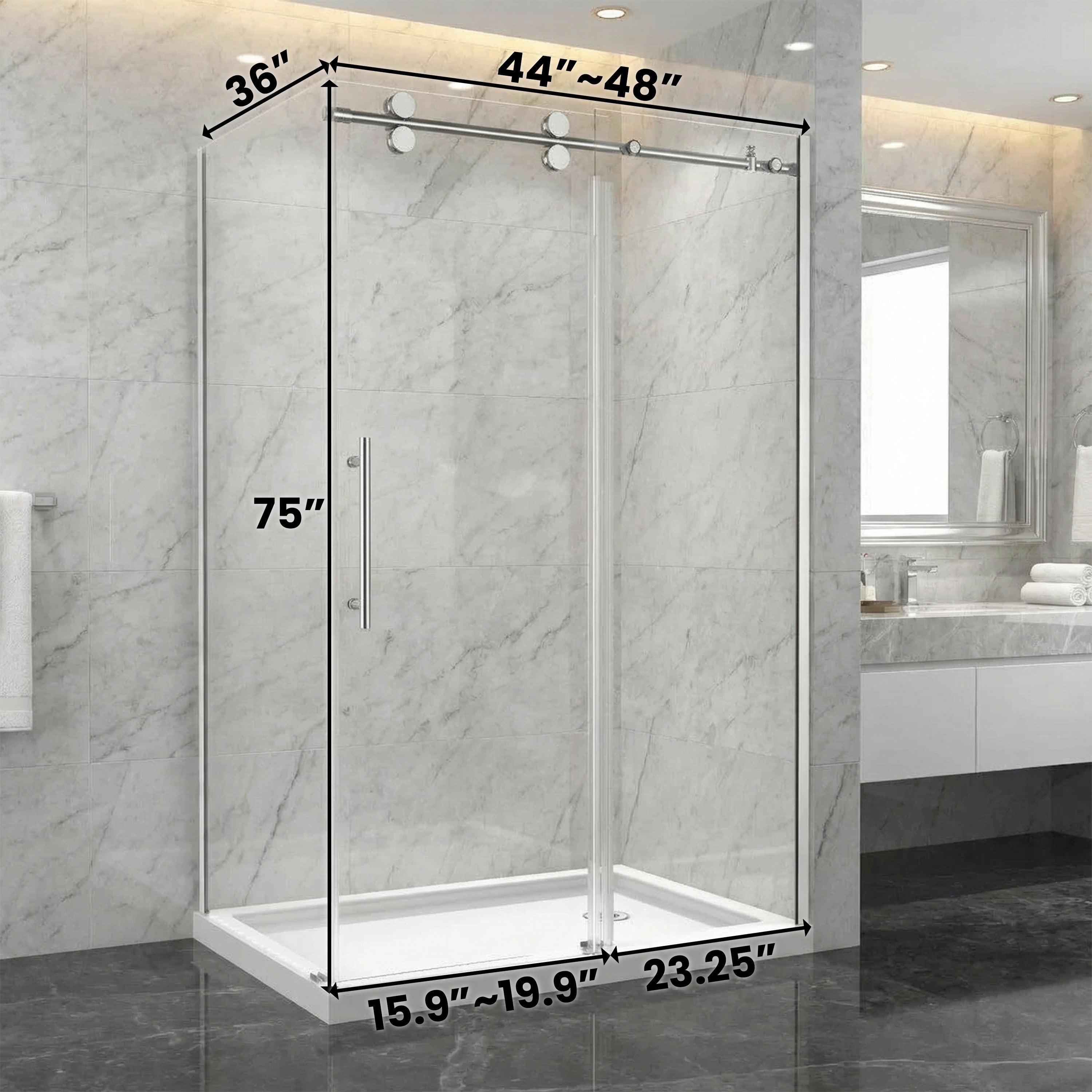 Porte de Douche Coulissante Réversible Chromée de 48 po x 36 po x 75 po - Verre de 10mm, Installation à 2 Murs avec Panneau Latéral de 36 po