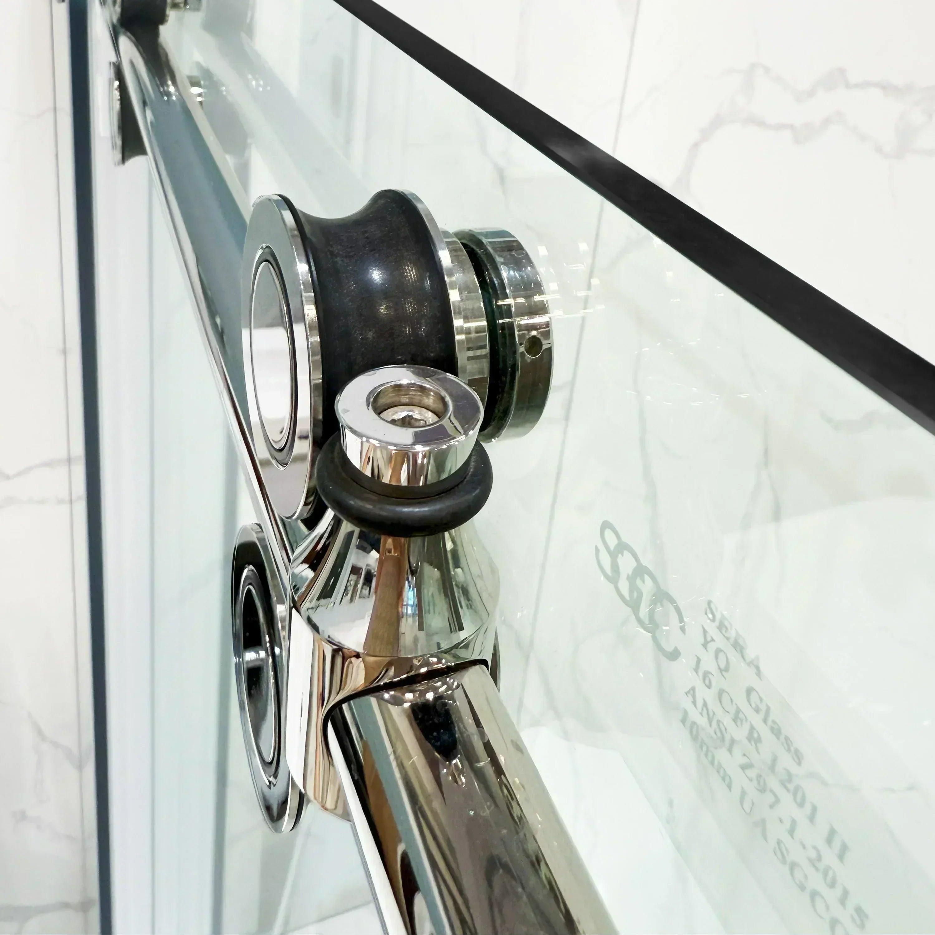 Conçue pour apporter lumière, ouverture et luxe à votre espace, cette porte est dotée d'une quincaillerie chromée de forme ronde qui adoucit sa silhouette et rehausse son design moderne. Que vous rénoviez ou construisiez, elle constitue une solution élégante et pratique pour les installations à deux murs.