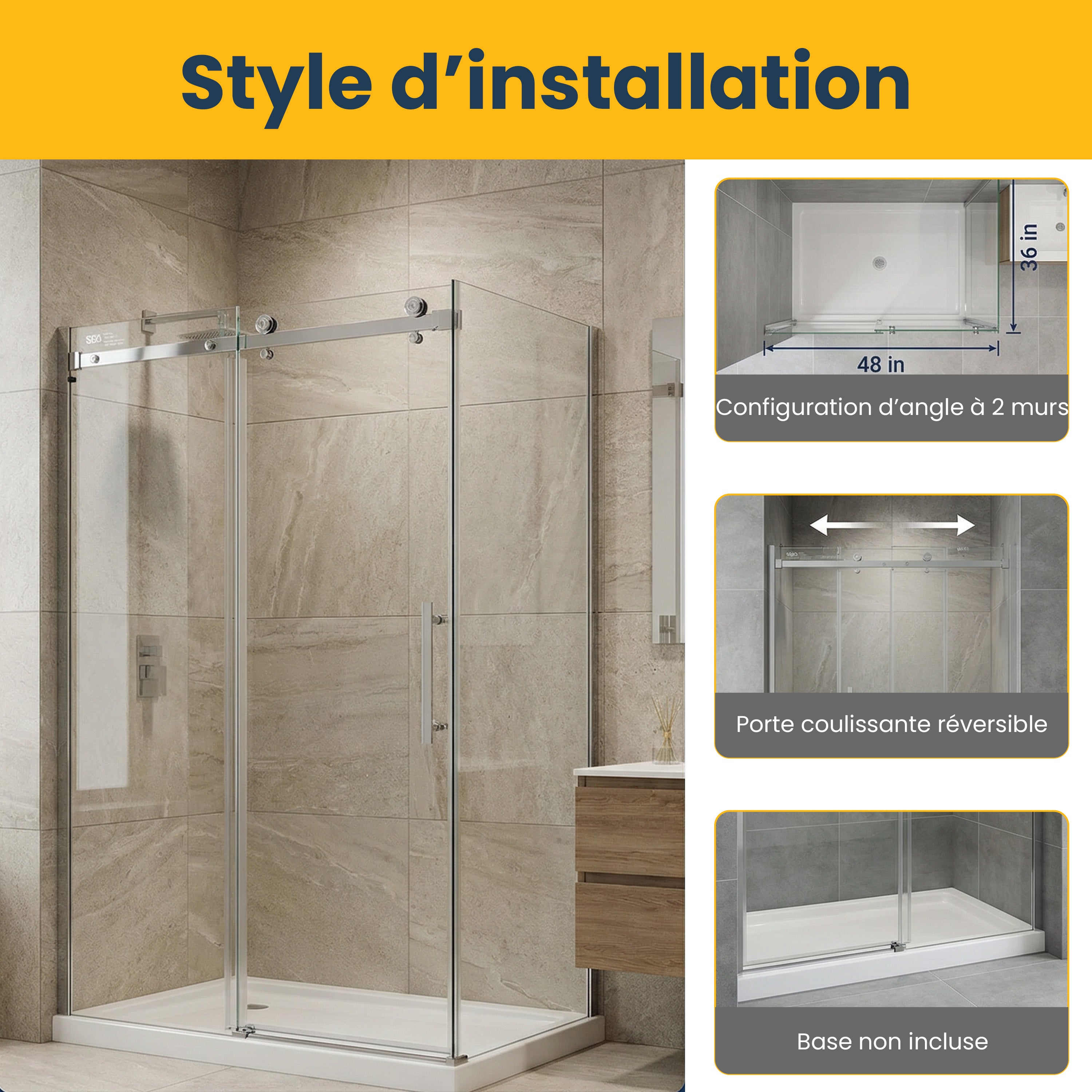 Maximisez le style et la fonctionnalité de votre salle de bain avec notre porte de douche coulissante réversible de 48", avec un panneau latéral de 36".