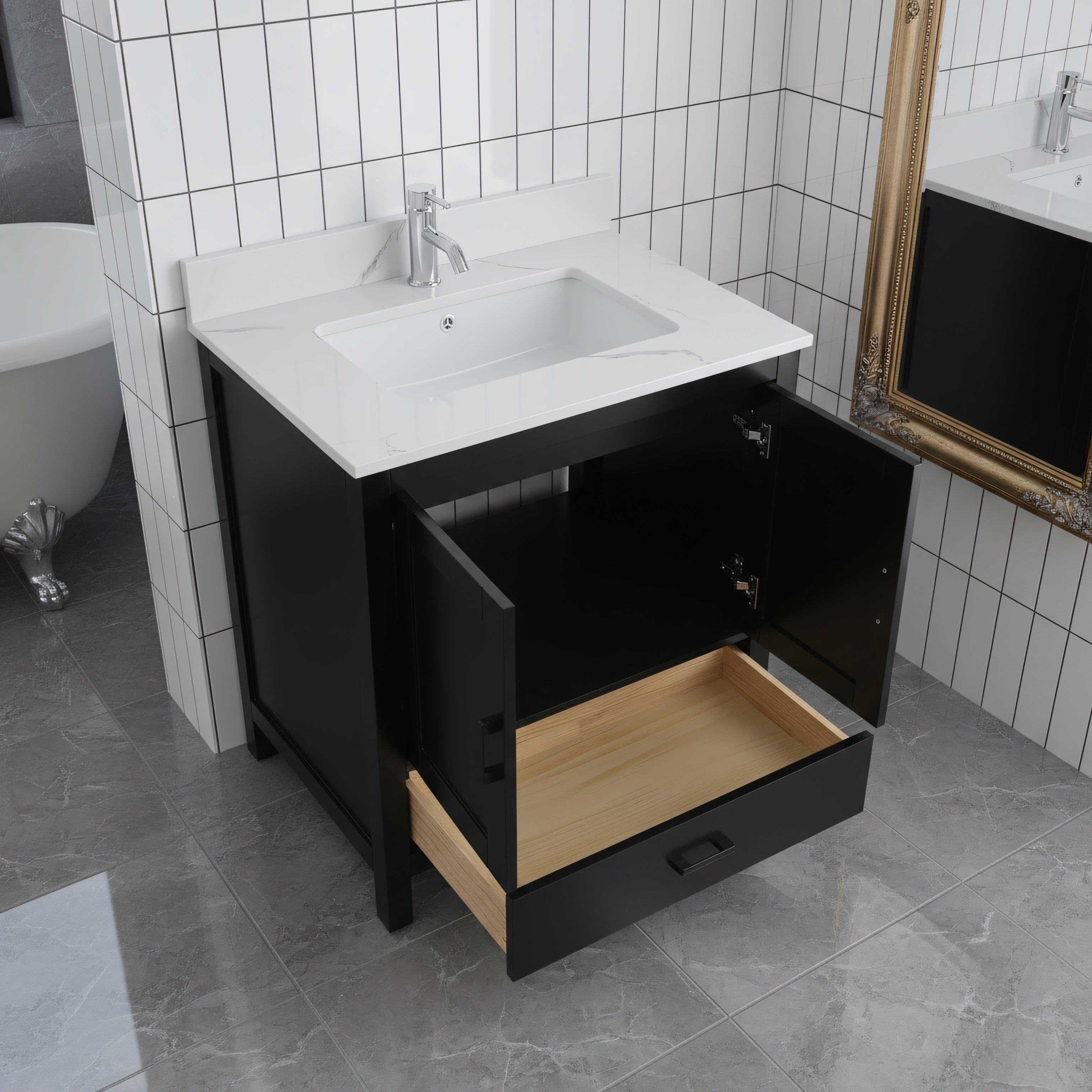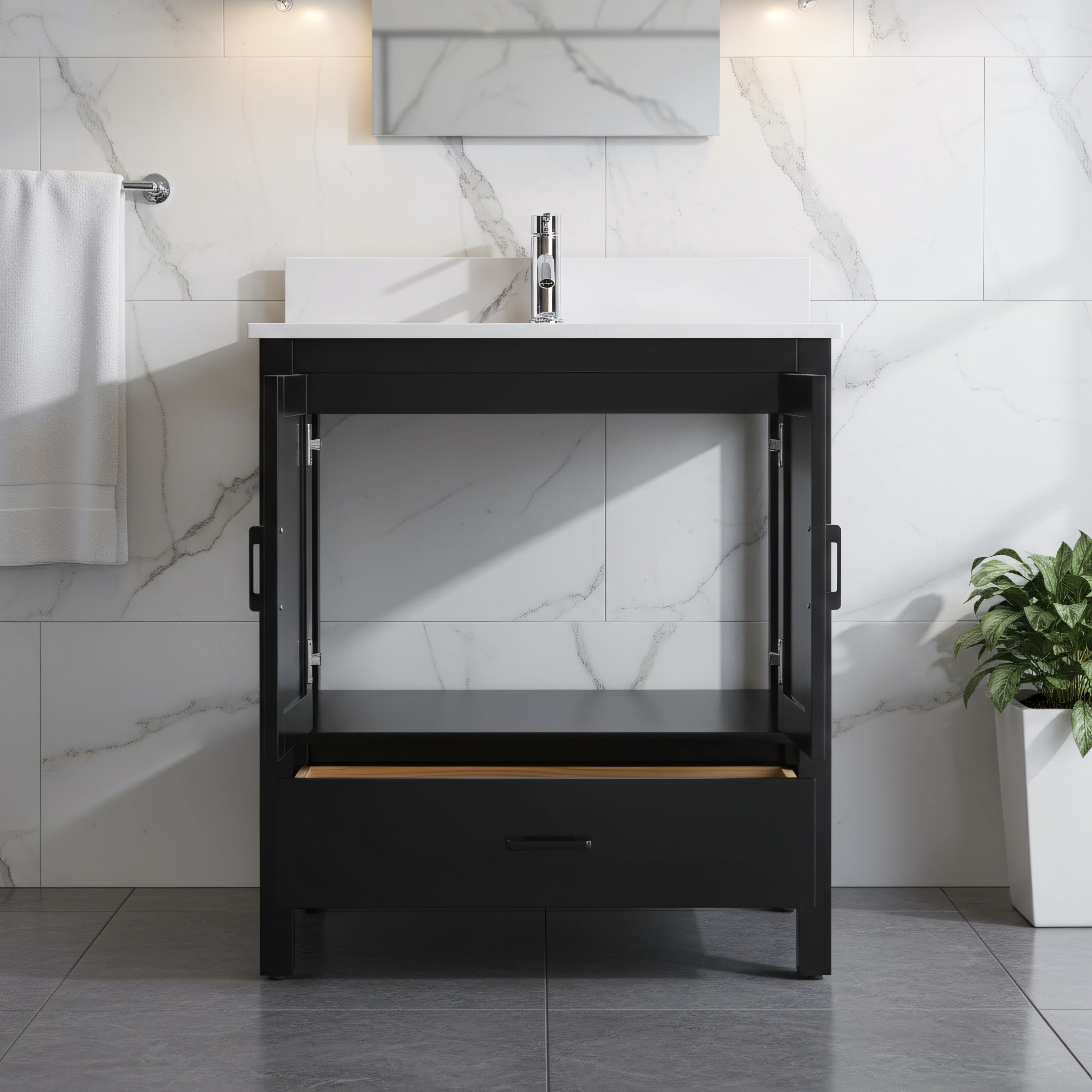 Meuble-Lavabo Autoportant 30po Noir avec Comptoir de Polymarbre Ingénierie Calcutta