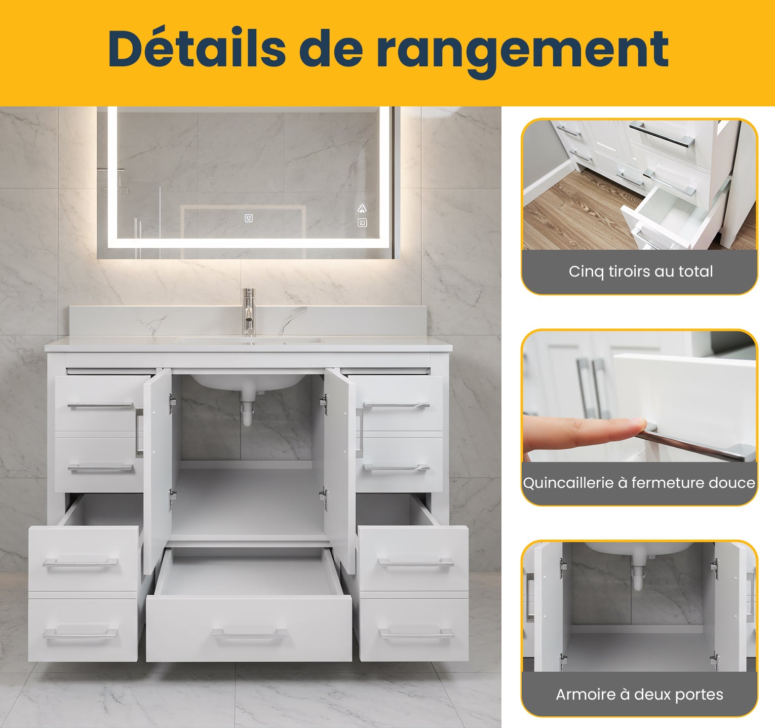 Chaque meuble-lavabo est entièrement équipé d'un évier en porcelaine sous plan pré-monté et certifié CUPC, d'un dosseret en marbre assorti de 4 pouces de hauteur, de trous de robinet mono-percés, de pieds réglables et d'un drain escamotable pour une installation facile.