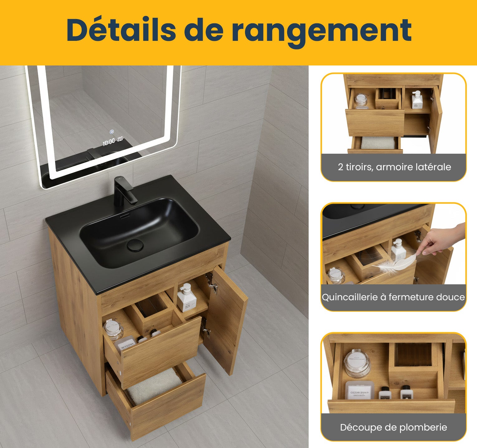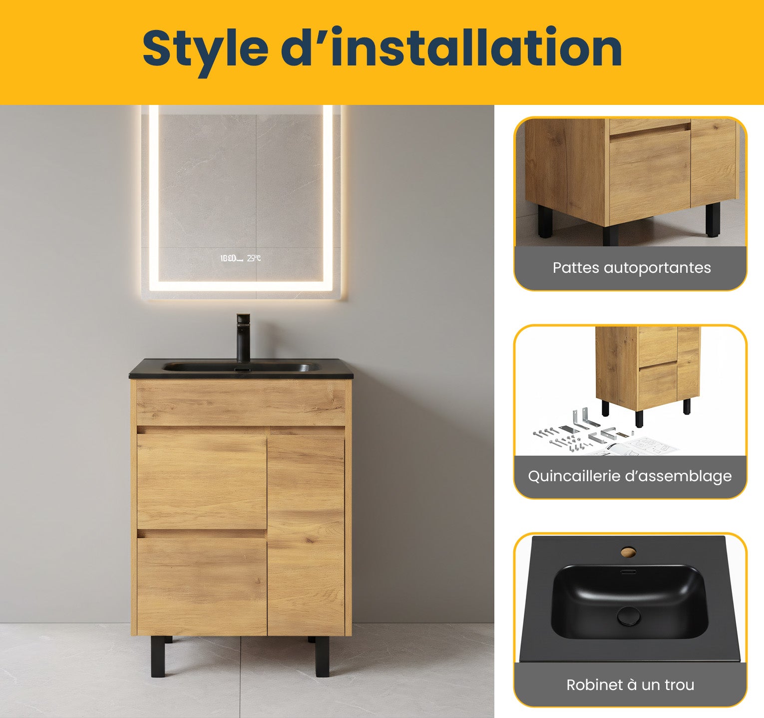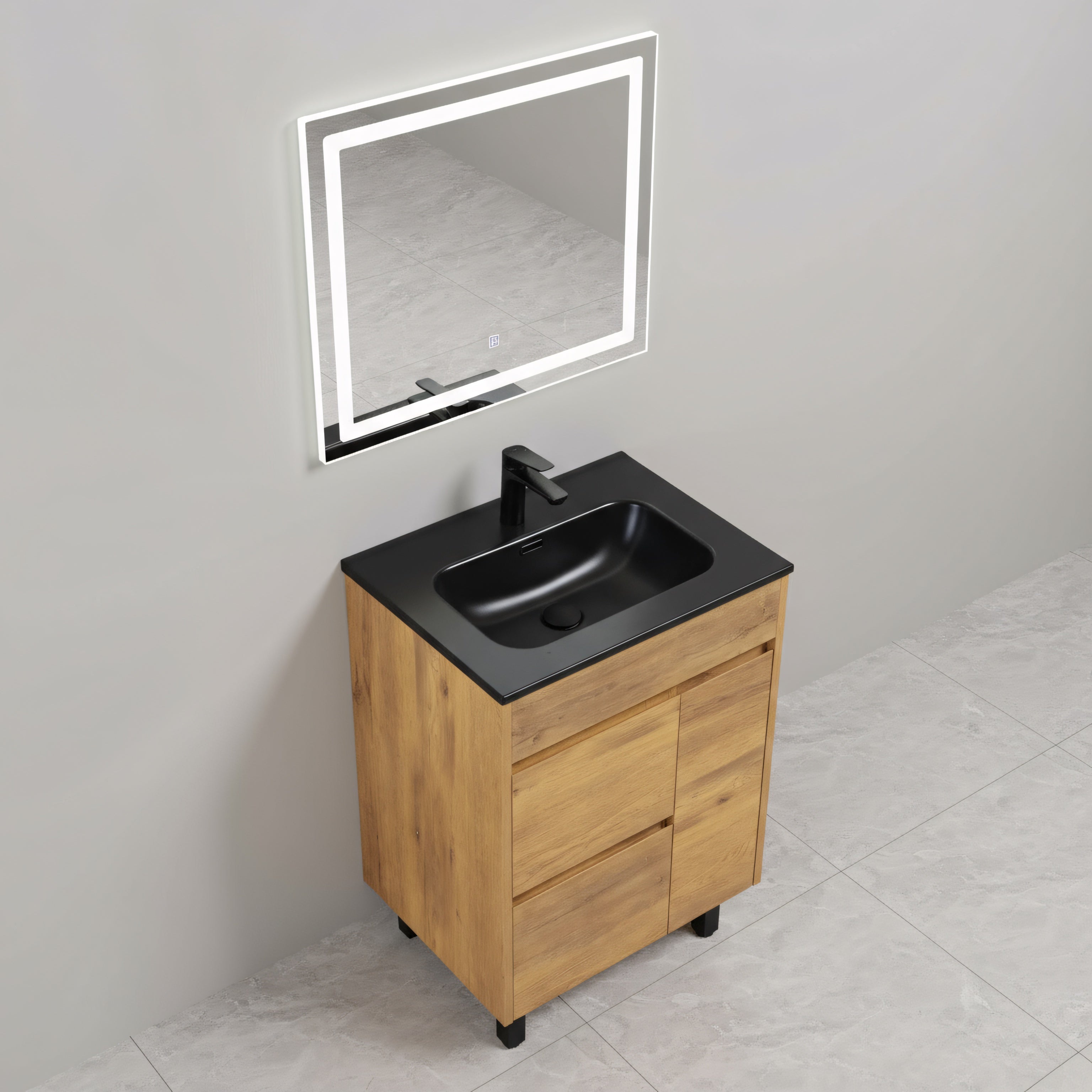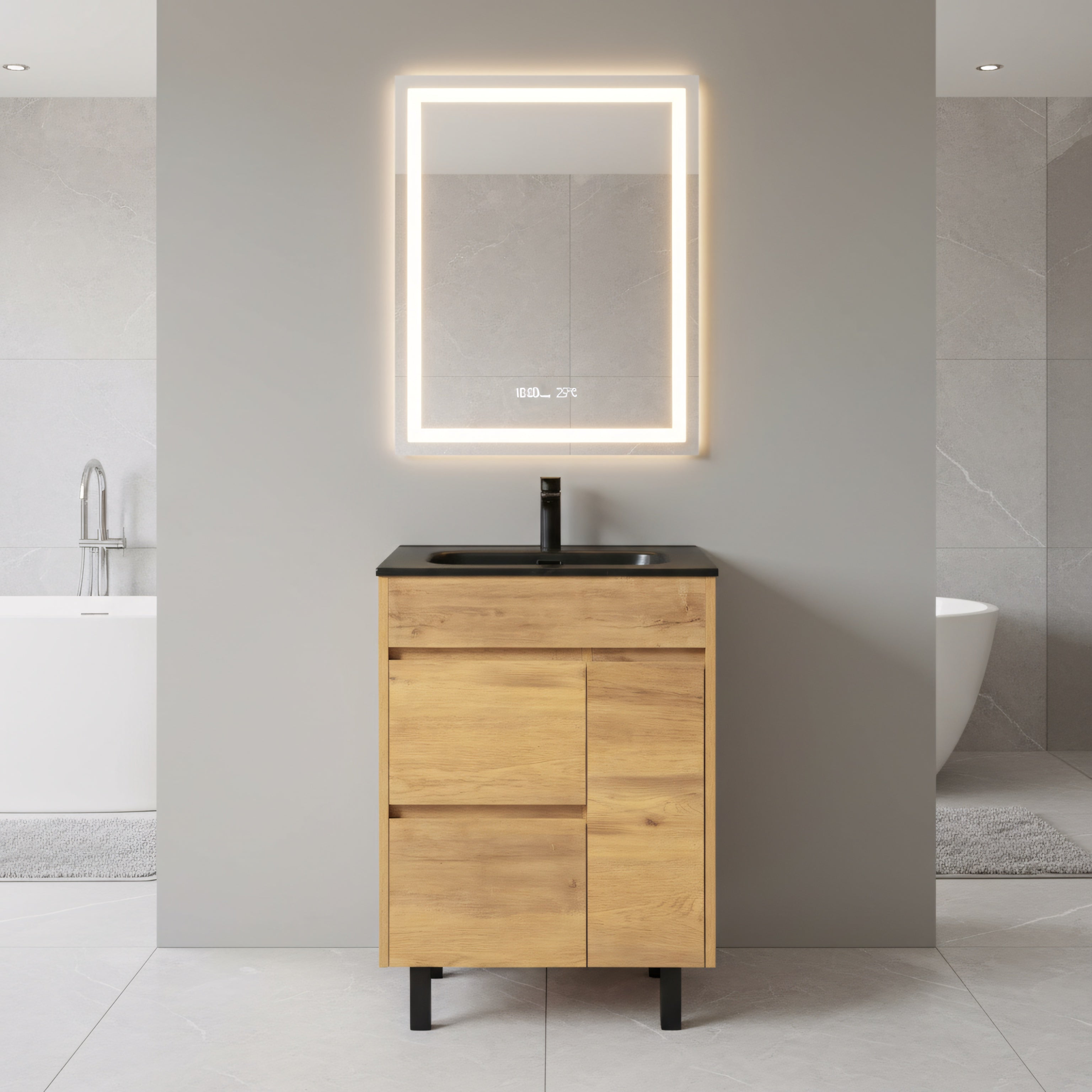 Meuble-Lavabo Autoportant 24po Chêne Givré avec Comptoir de Céramique Noir