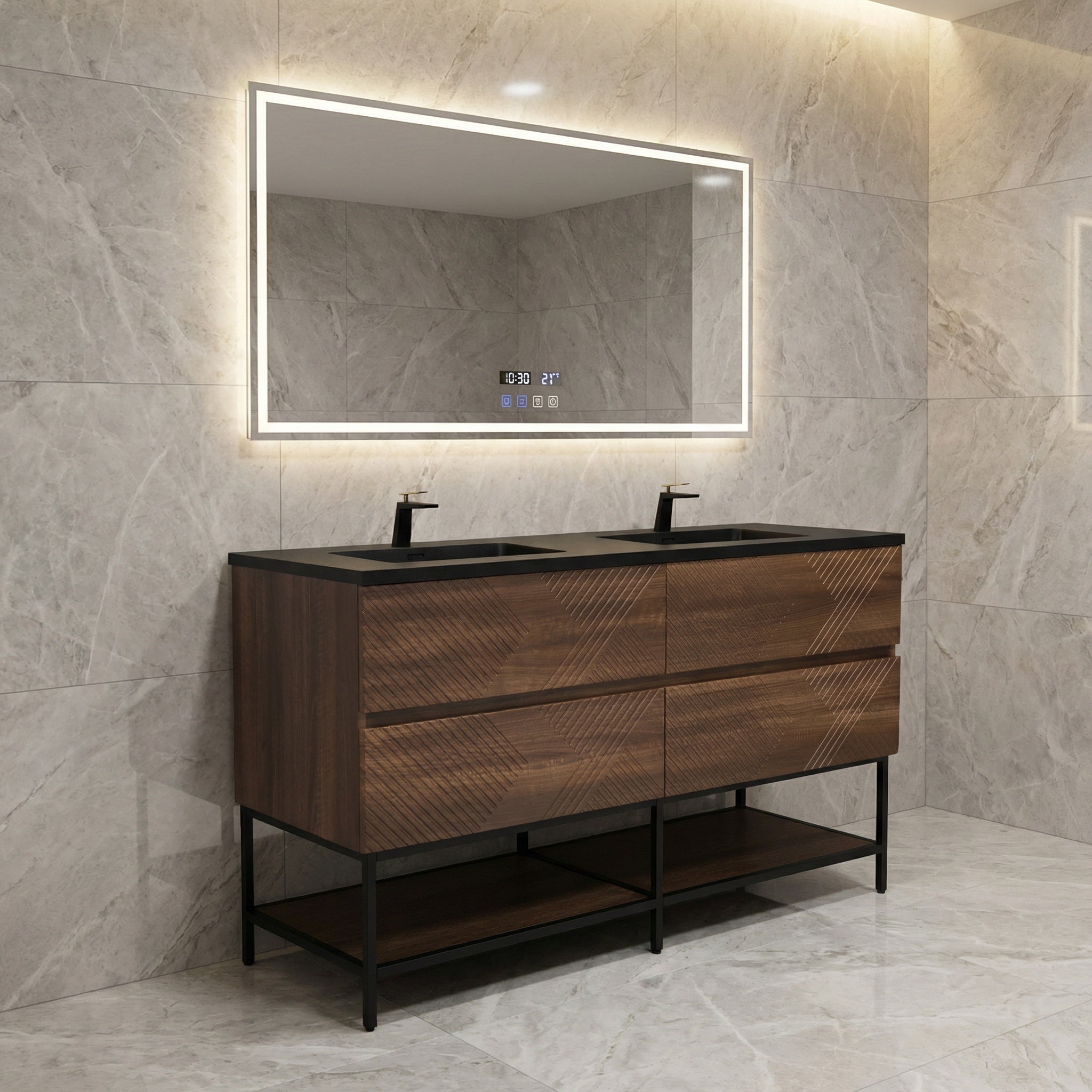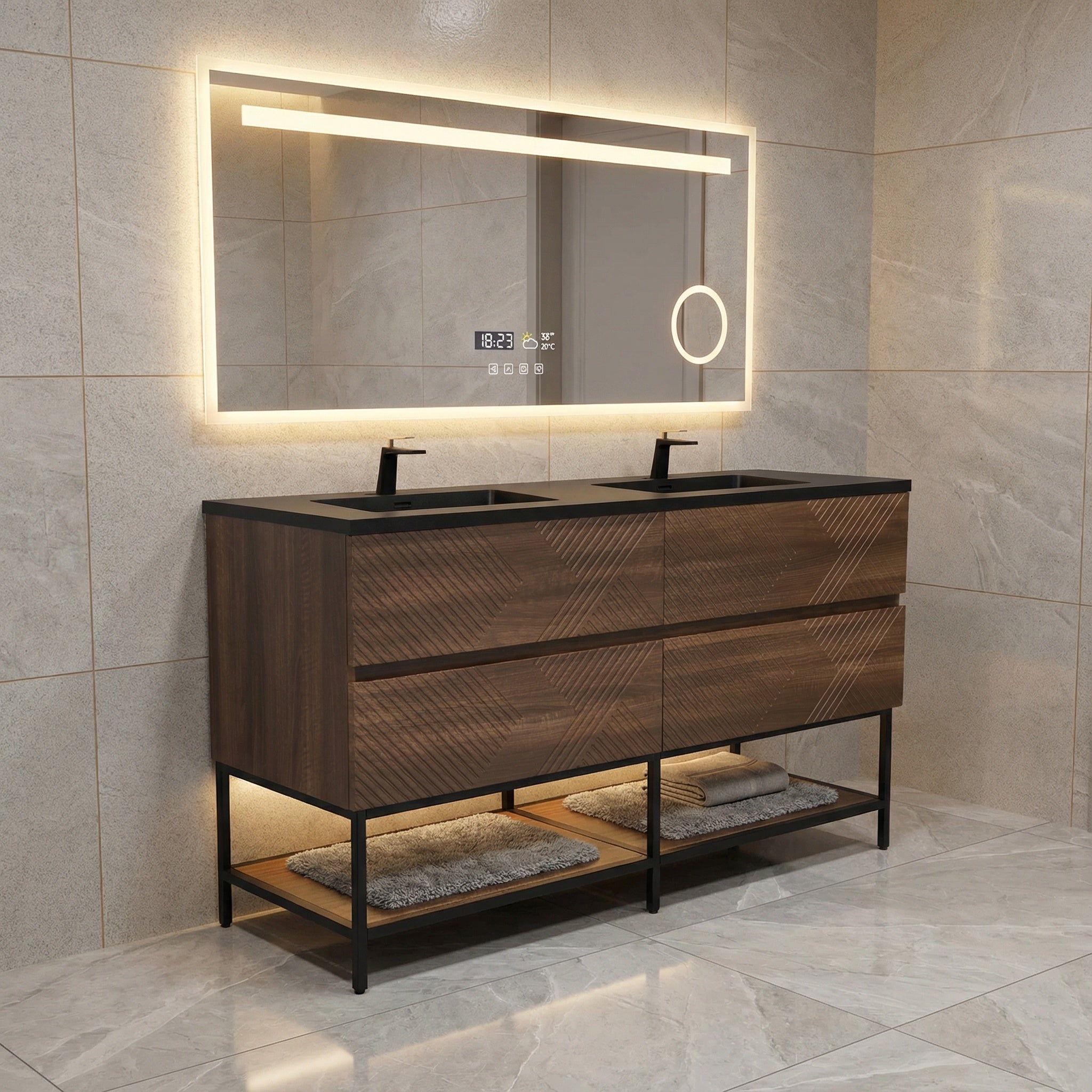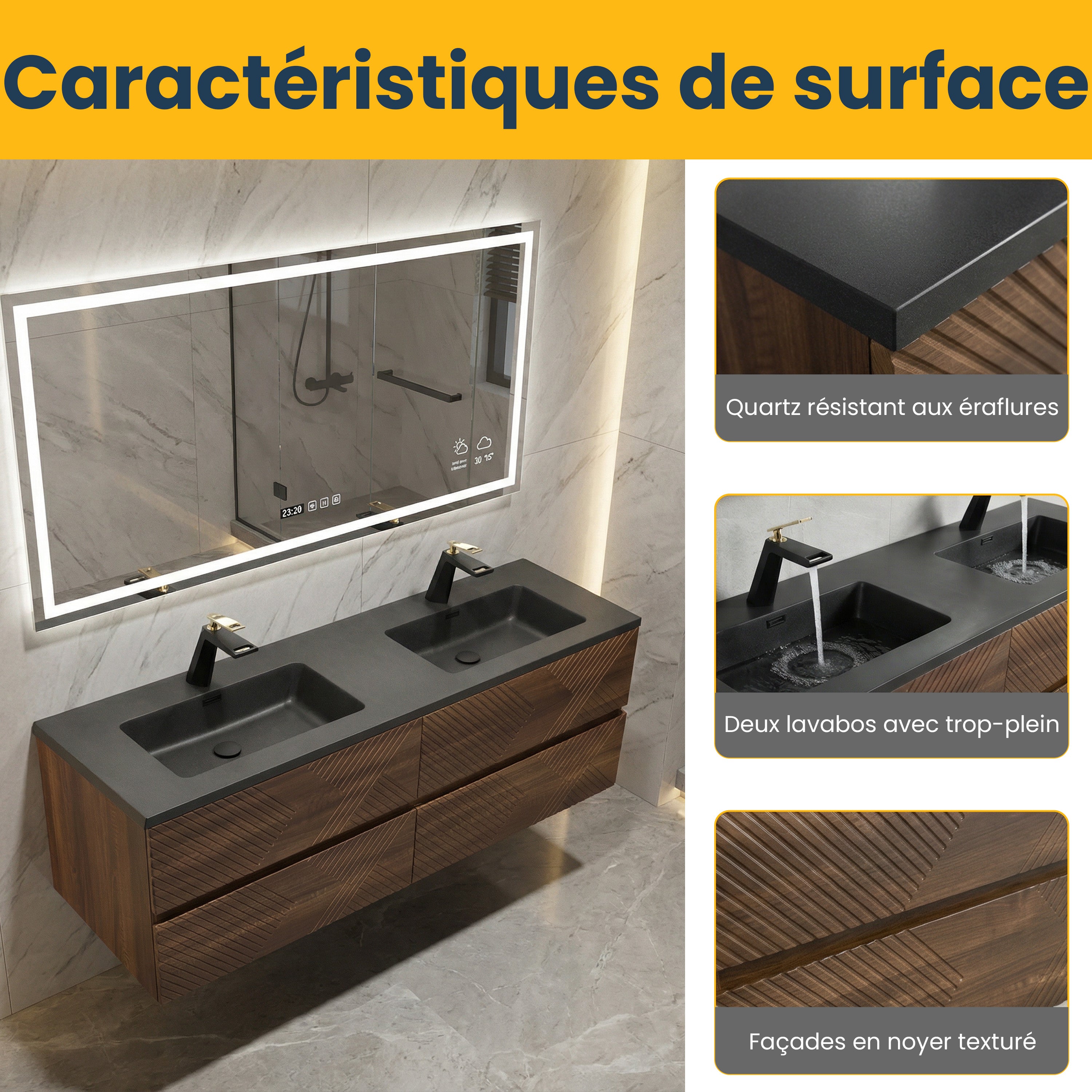 Adoptez un minimalisme audacieux avec ce meuble-lavabo mural à double vasque de 152 cm (60 po) au riche fini noyer, surmonté d'un superbe Comptoir en quartz noir. Il est idéal pour les salles de bains modernes en quête de chaleur, de contraste et d'élégance fonctionnelle.
