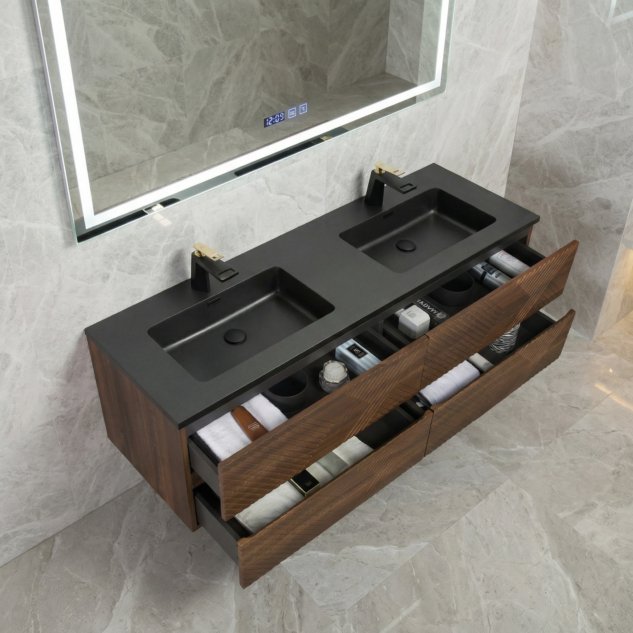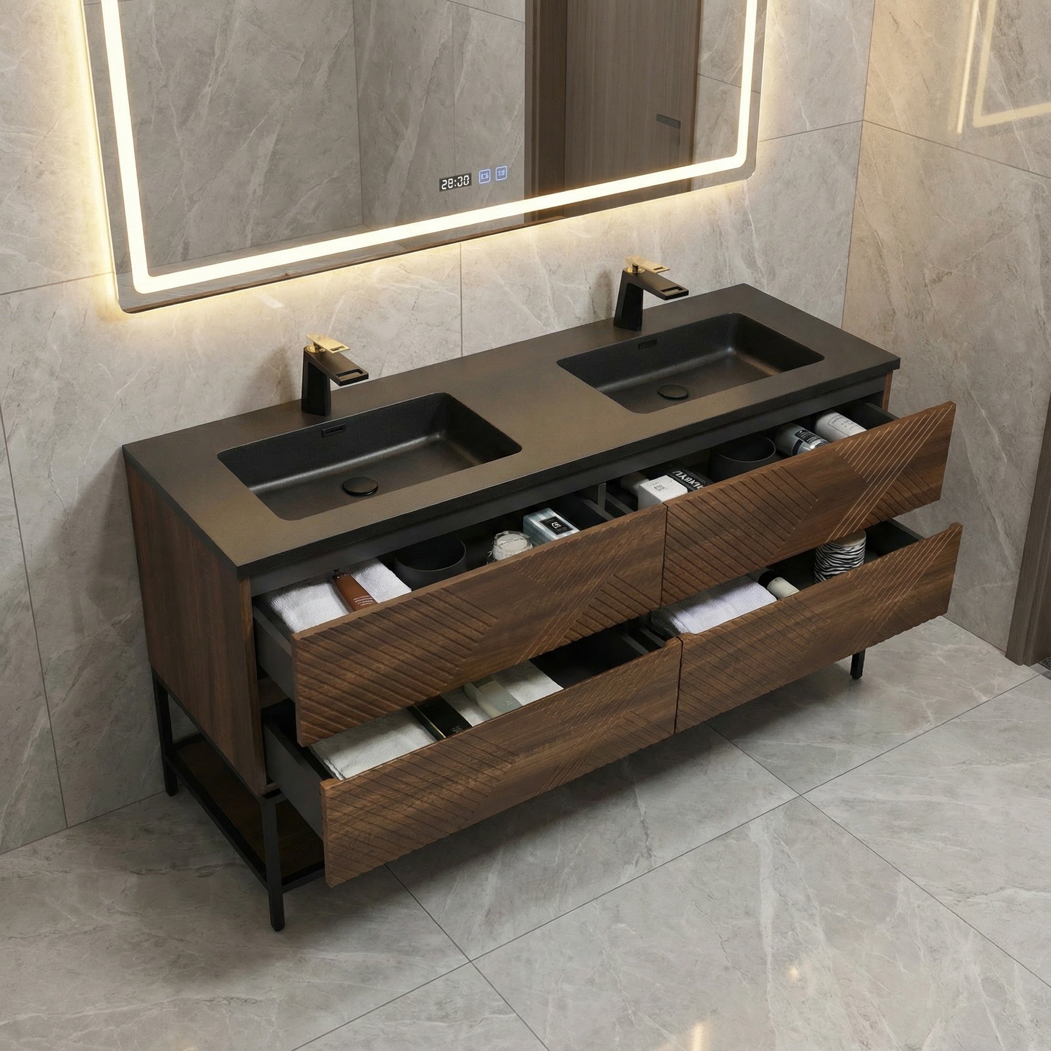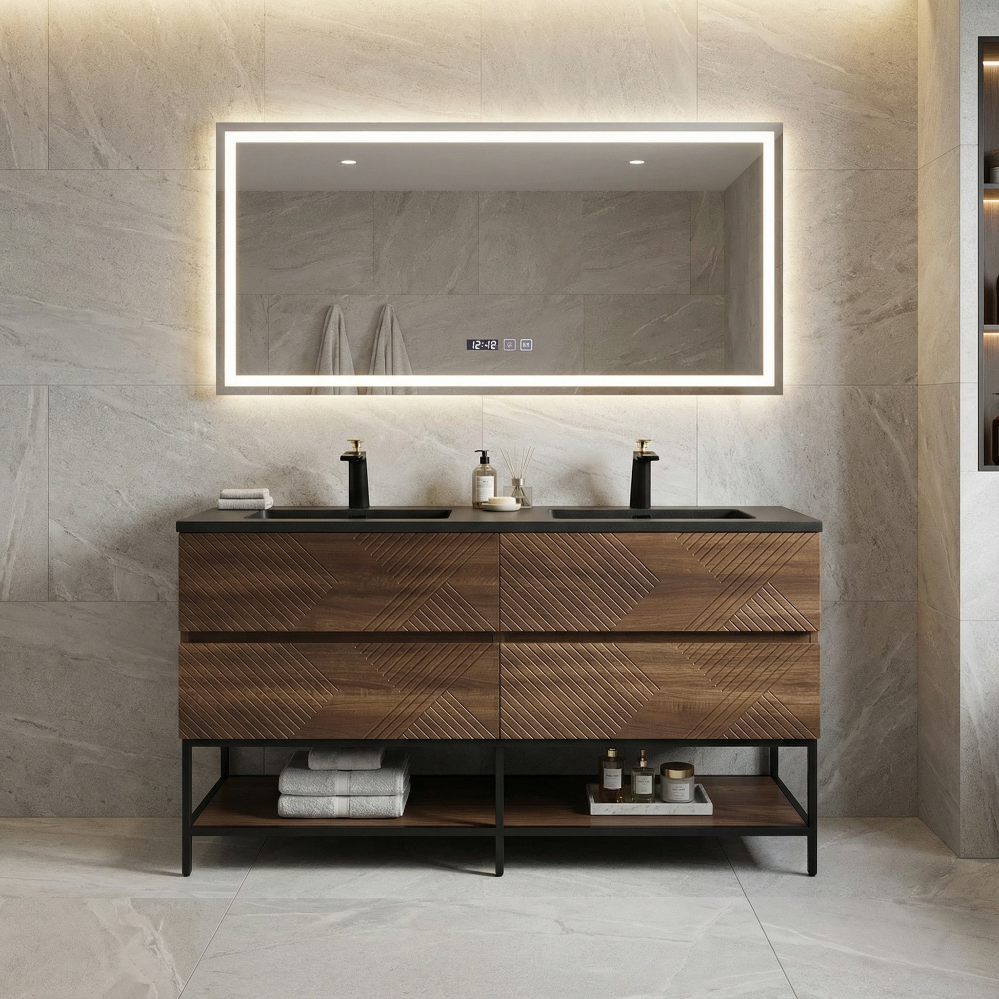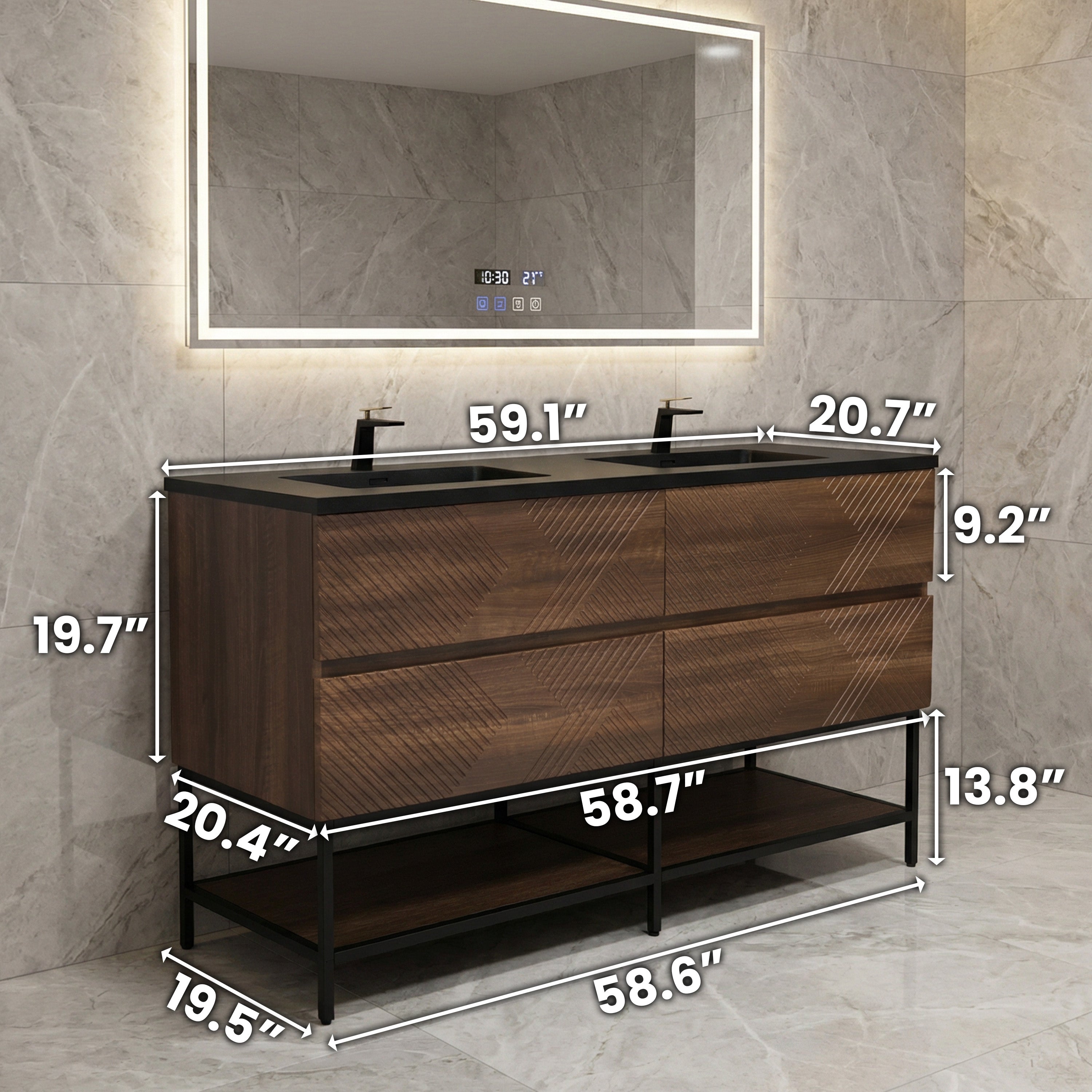 Adoptez un minimalisme audacieux avec ce meuble-lavabo mural à double vasque de 152 cm (60 po) au riche fini noyer, surmonté d'un superbe Comptoir en quartz noir. Il est idéal pour les salles de bains modernes en quête de chaleur, de contraste et d'élégance fonctionnelle.