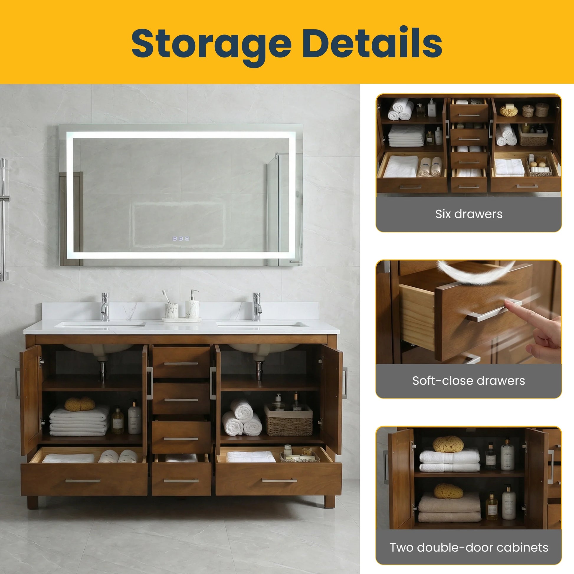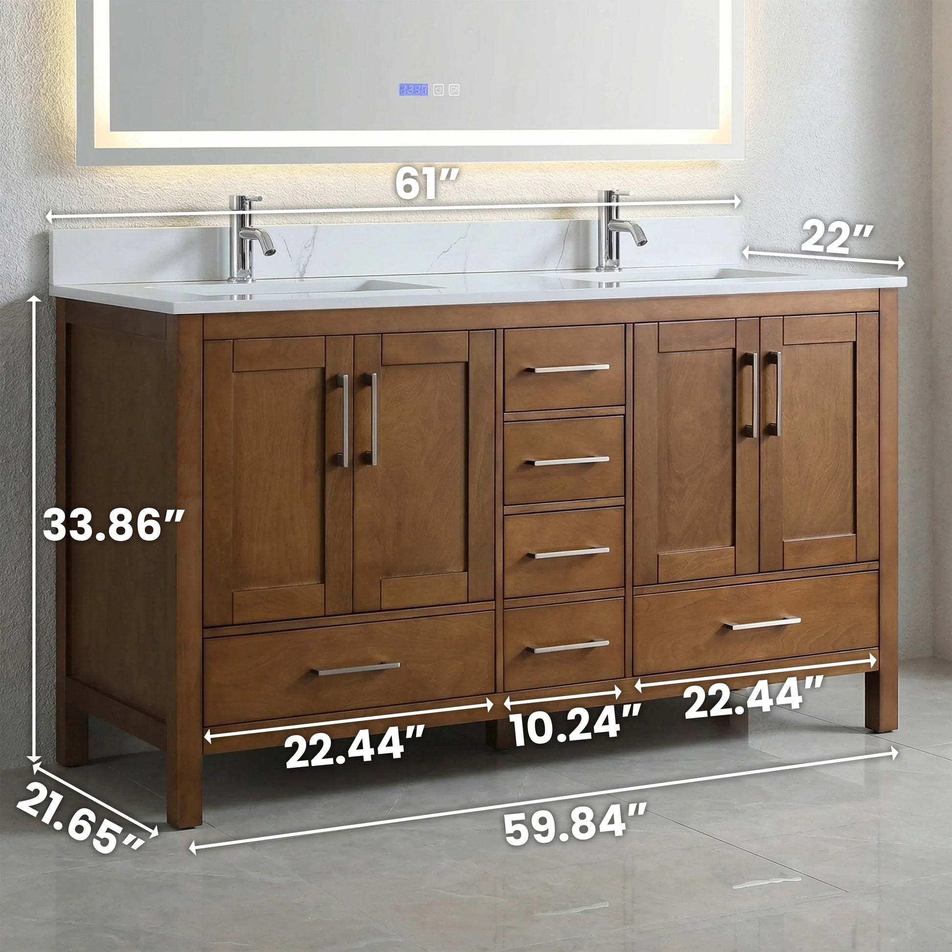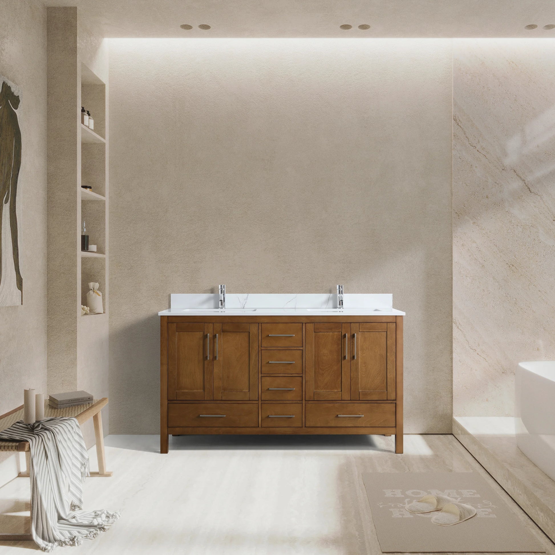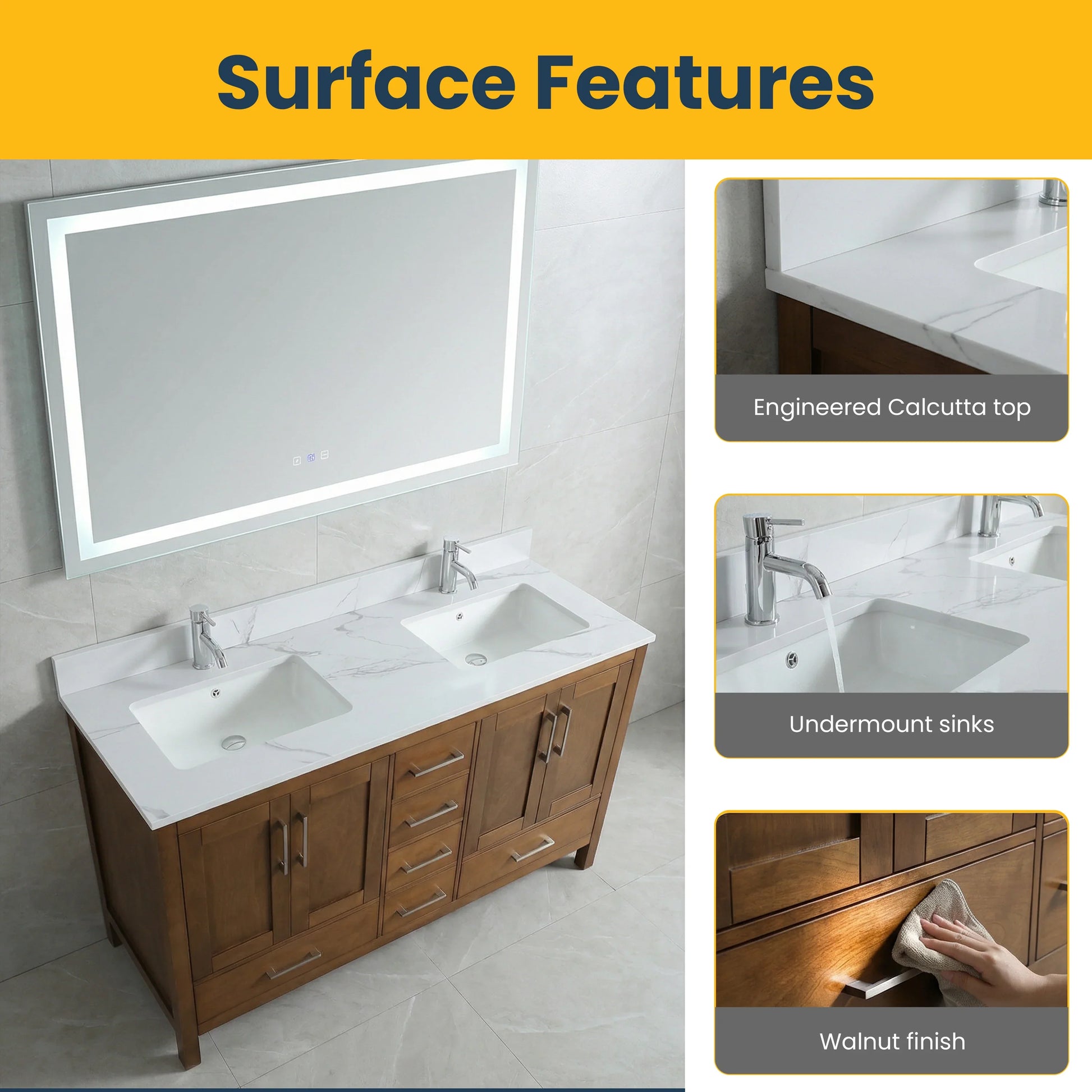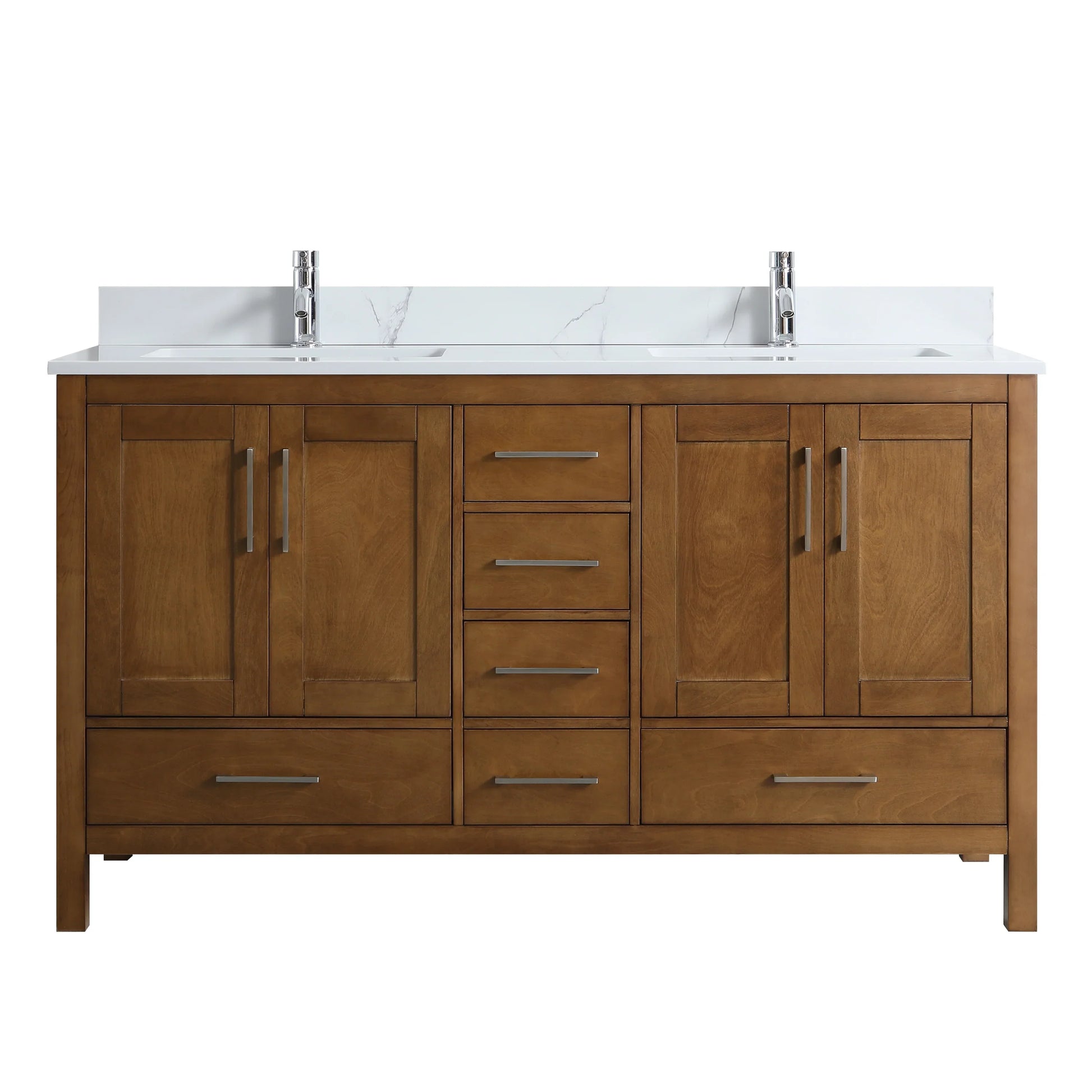Meuble-lavabo double sur pied en noyer de 60 pouces avec comptoir en marbre reconstitué de Calacatta