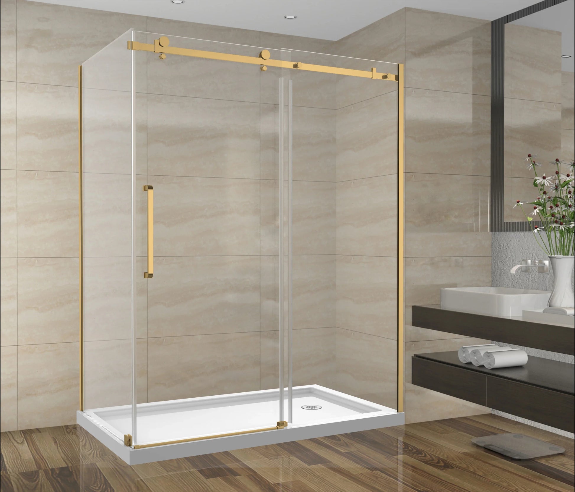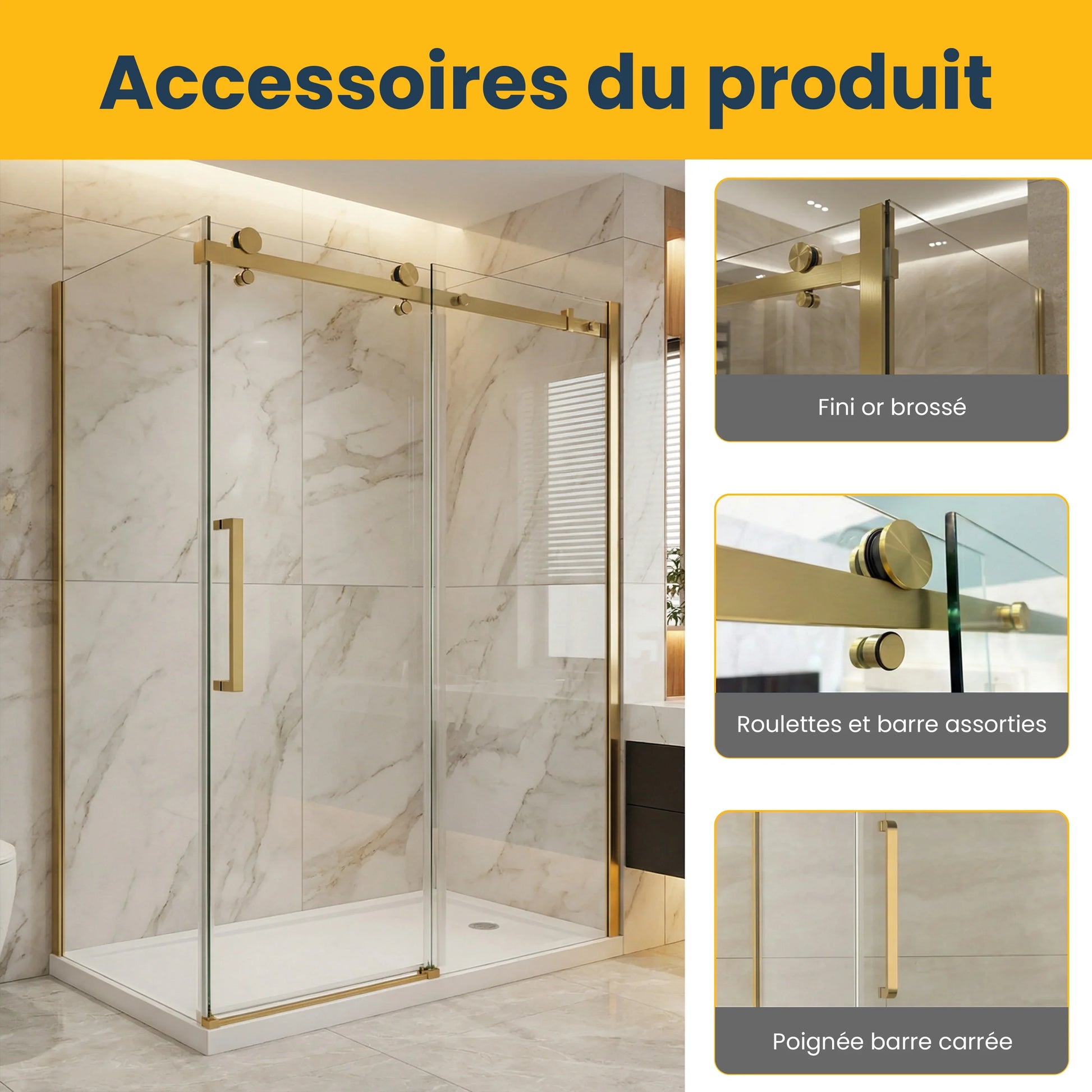 Transformez votre salle de bain en un espace luxueux avec cette magnifique porte de douche coulissante de 60po x 36po x 75po en or brossé. Dotée d'une quincaillerie carrée élégante dans une finition or brossé chaleureuse, cette douche de coin apporte une sophistication contemporaine à toute configuration de salle de bain à 2 murs.