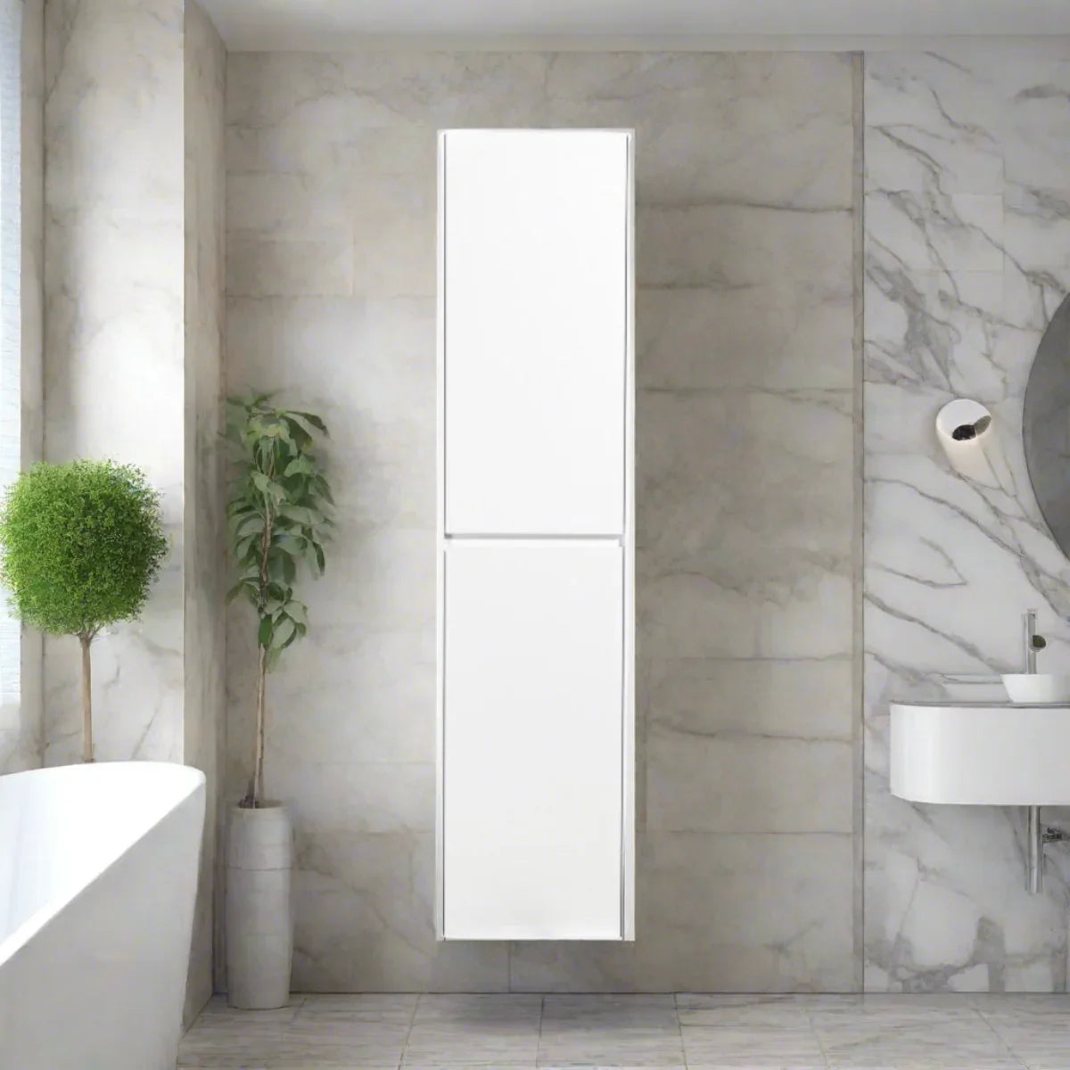 • Armoire à linge murale avec fini blanc lustré et structure en MDF résistante à l'humidité pour une durabilité optimale dans des conditions humides