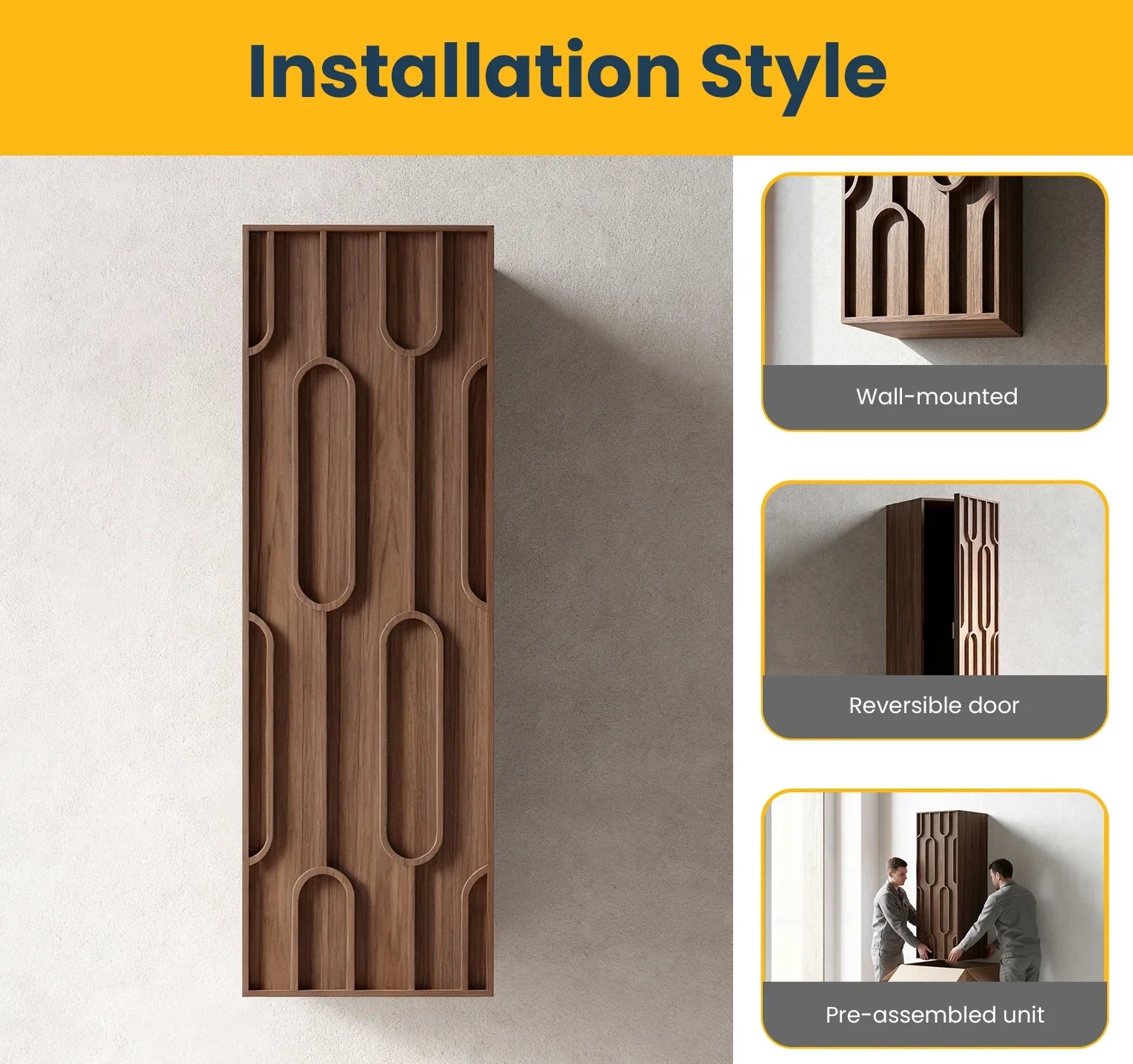 • Armoire à linge murale en bois massif et contreplaqué hydrofuge plaqué noyer américain, assurant une grande durabilité en milieu humide.