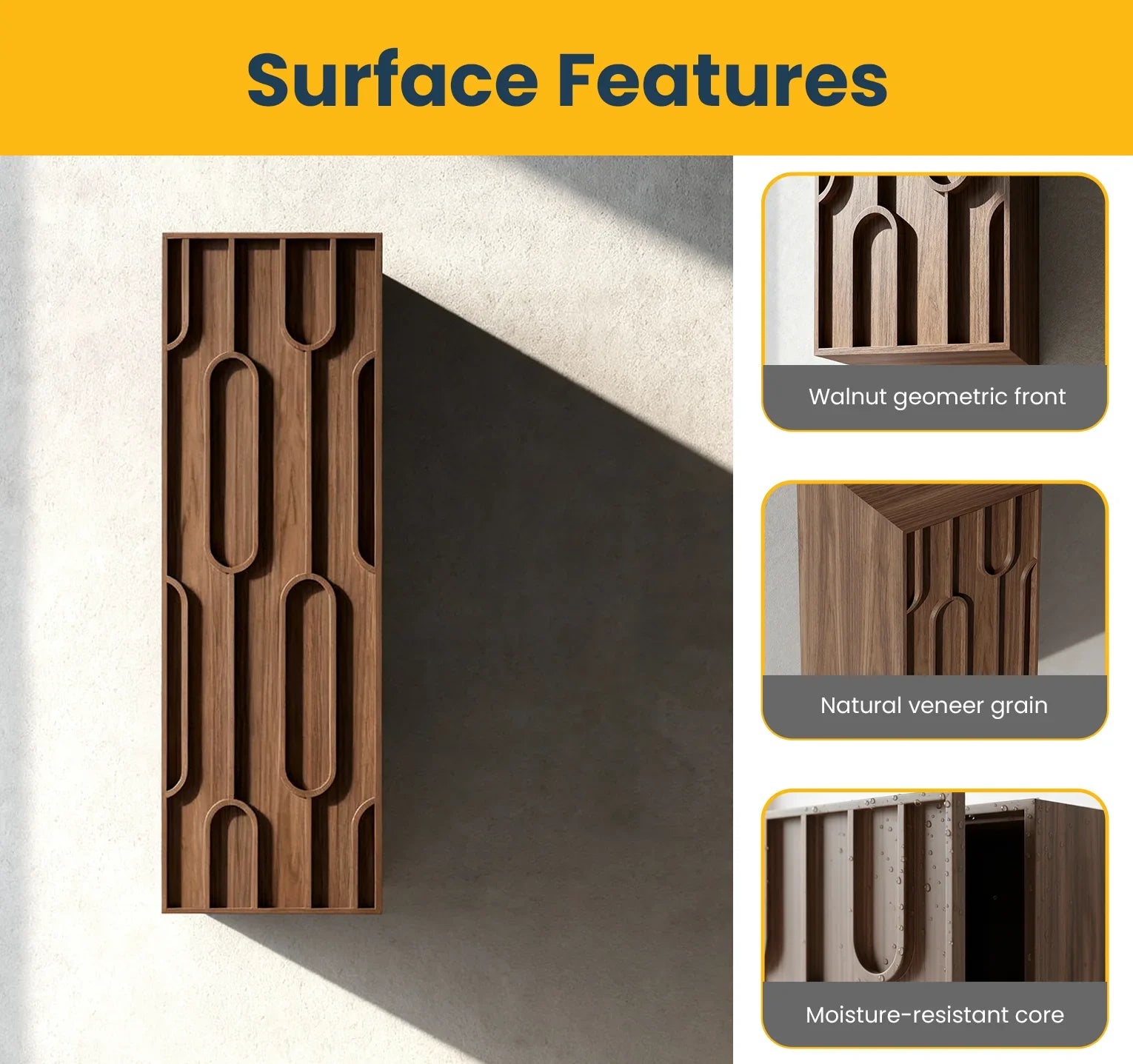 Fabriqué en bois massif et en contreplaqué résistant à l'humidité avec un placage en noyer américain, ce meuble dégage une chaleur et une sophistication naturelles grâce à son motif de cercles ondulés qui s'harmonise avec tous les styles de salle de bain.